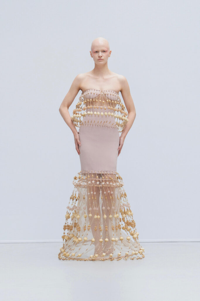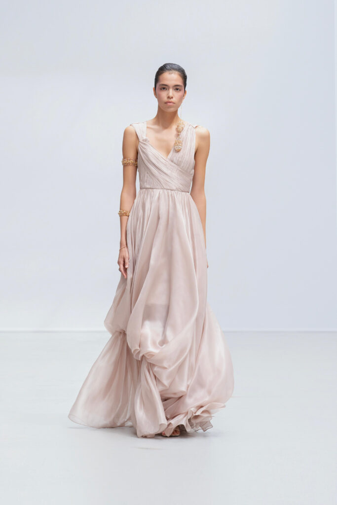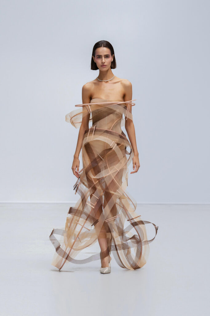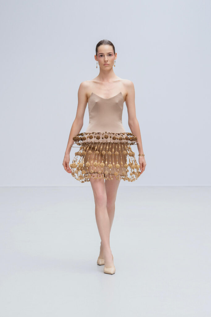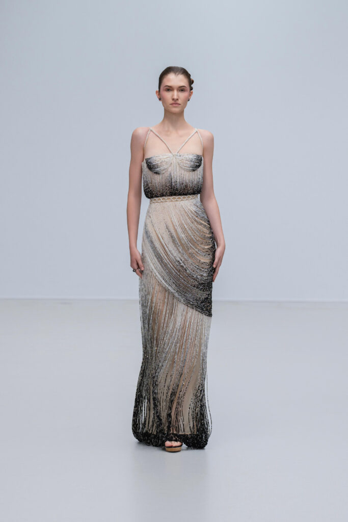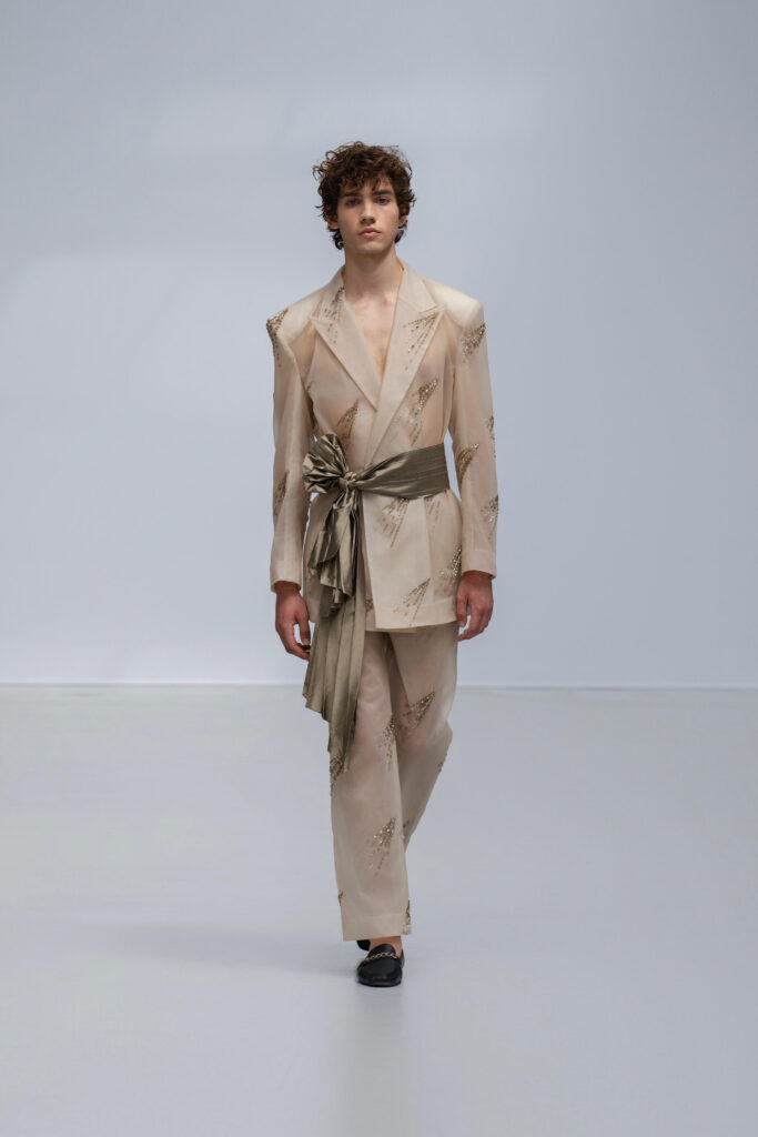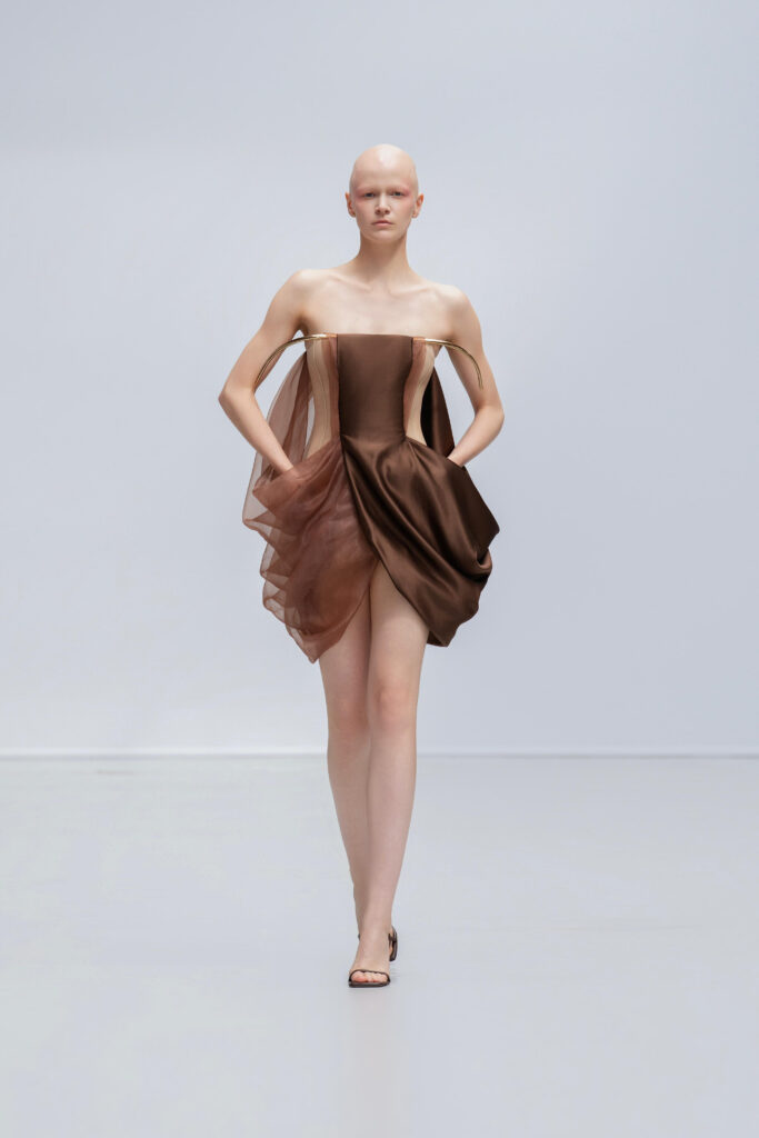 Le créateur pousse plus loin sa maille élastique irisée : un voile polymorphe qui capte la lumière et épouse la gestuelle telle l’onde d’un ruisseau. Sur d’autres looks, un tressage à la manière des paniers de pêche devient basque architecturale ; le techno-plissé évoque les sillons d’une rizière à flanc de colline. La palette terreuse — jaune “gras de poulet”, brun argile, rouge brique, poussière de chaux, reflets d’argent — renvoie à la mosaïque de couleurs d’un village au couchant.
