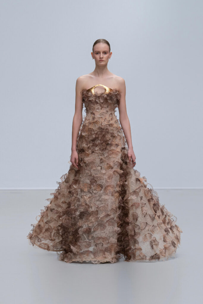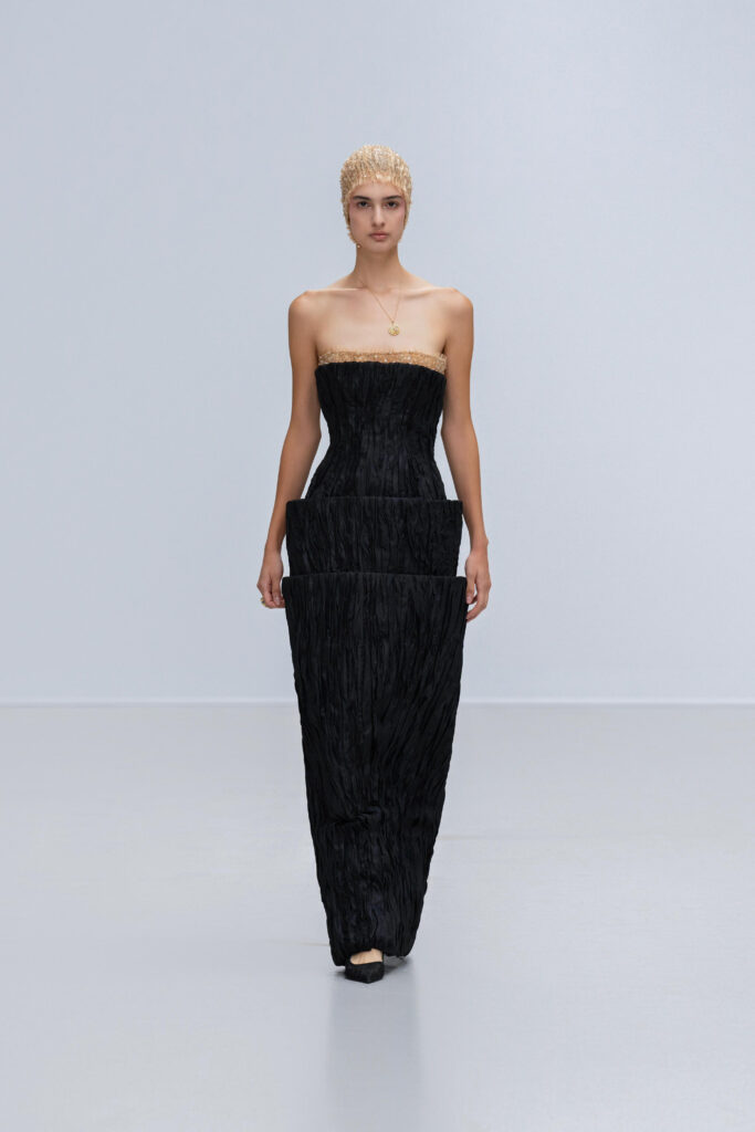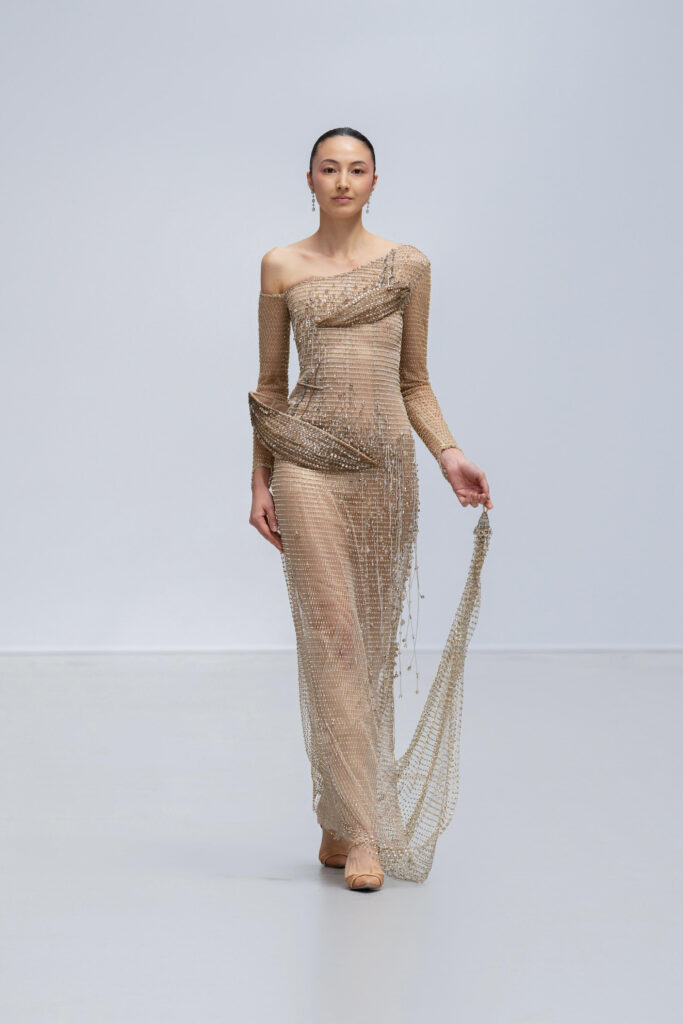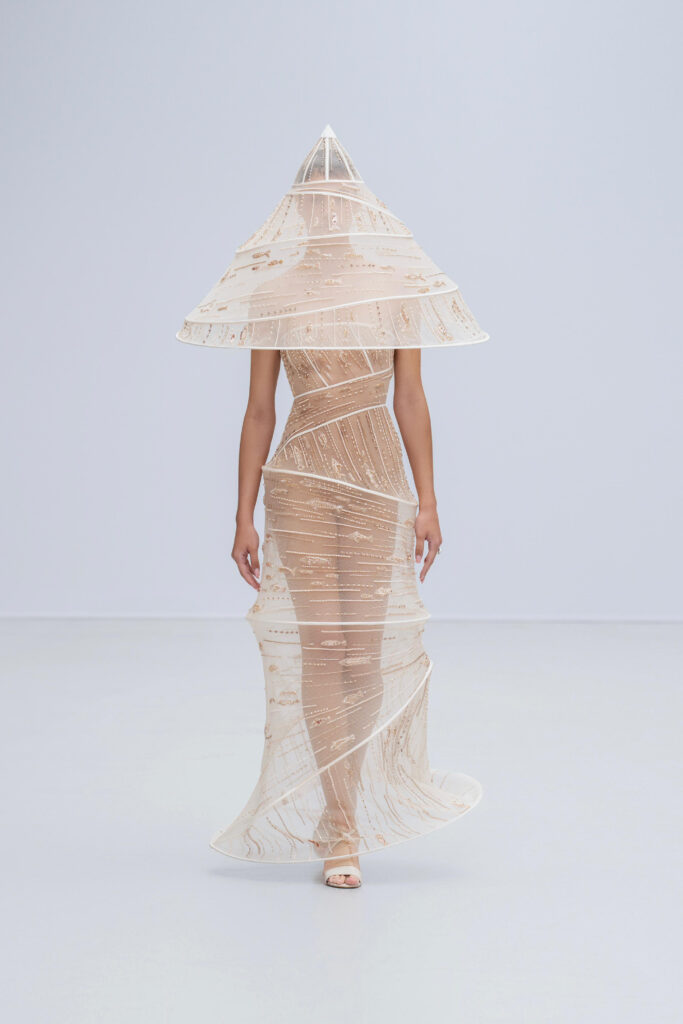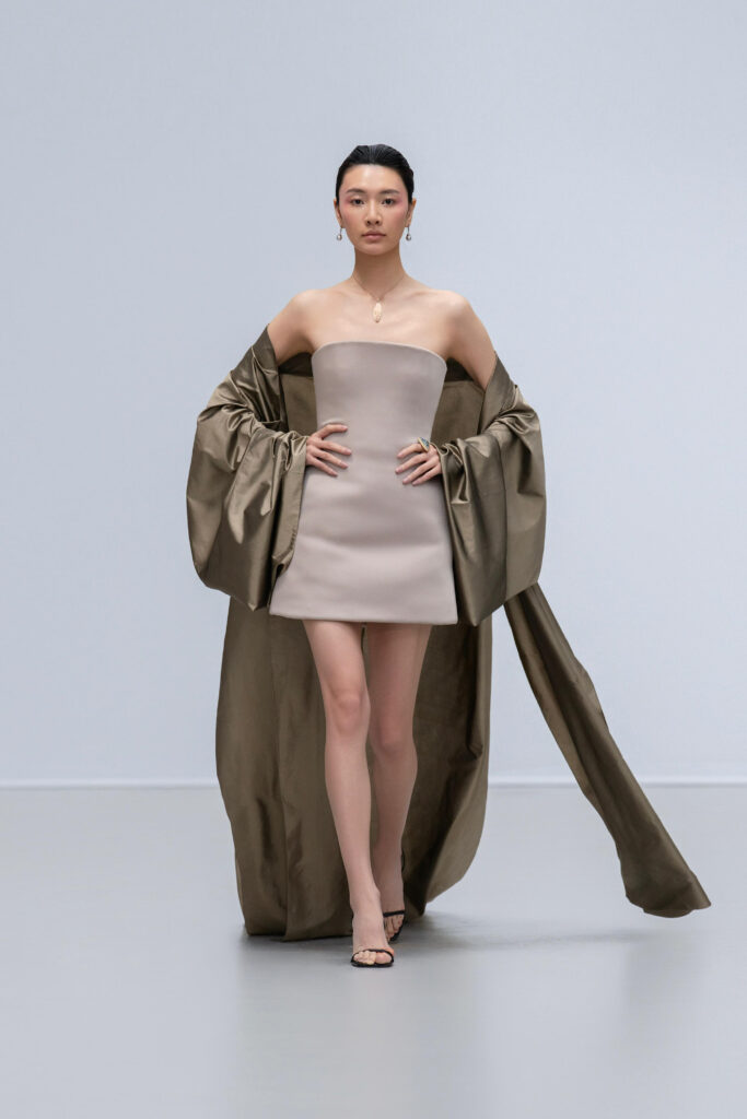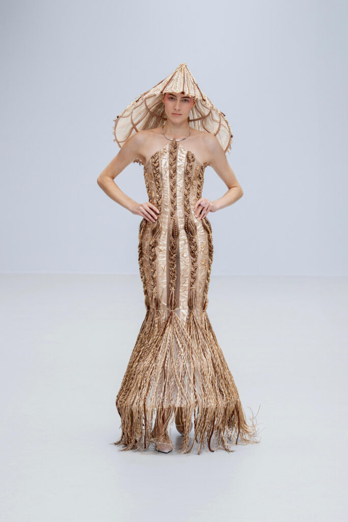 Loin d’une nostalgie figée, Phan Huy déclare « honorer les petites choses ». Ainsi, une robe « Filet » simule l’étreinte de la rivière par un drapé filet en soie lurex, tandis qu’une cape « Charbon » reproduit la fumée des foyers ruraux via une teinture dégradée anthracite-cendre. Les 36 silhouettes, toutes cousues main, privilégient la fluidité : les épaules s’arrondissent comme la voûte d’un toit de chaume, les jupes frémissent tel un champ de riz mûr sous le vent.