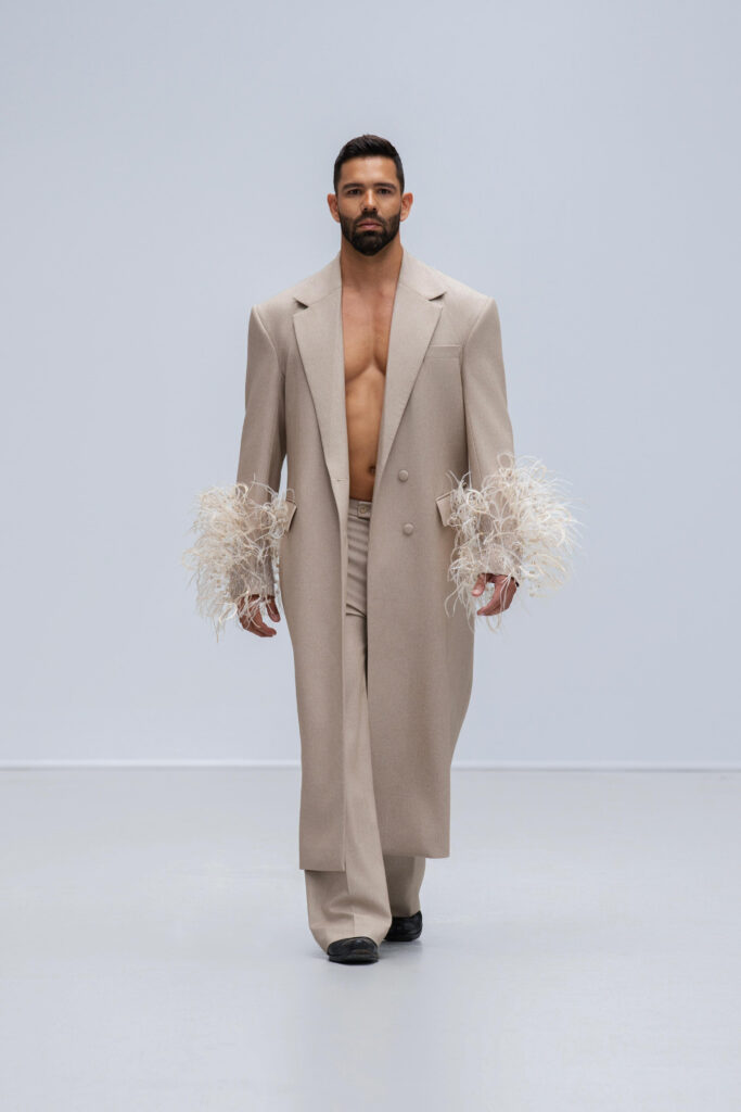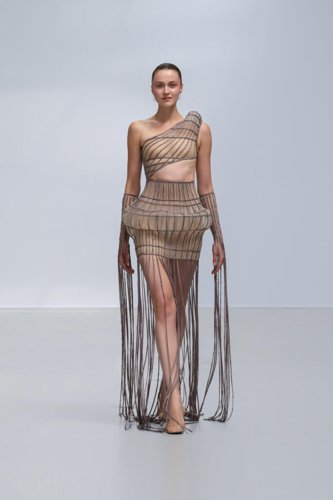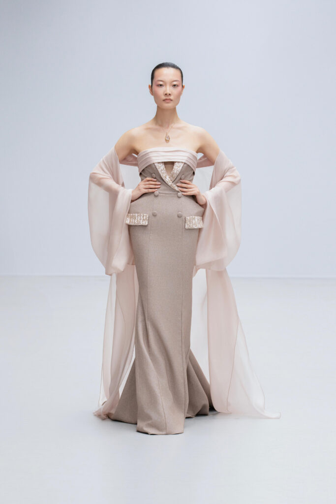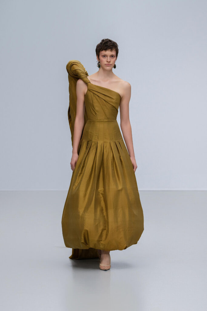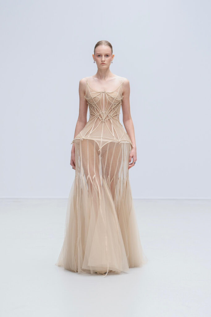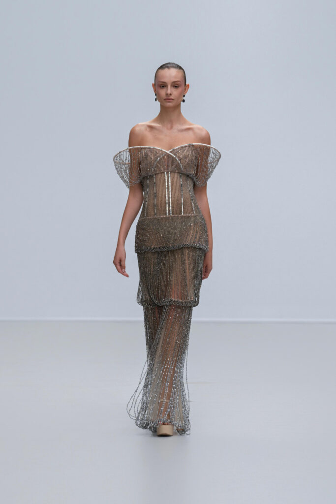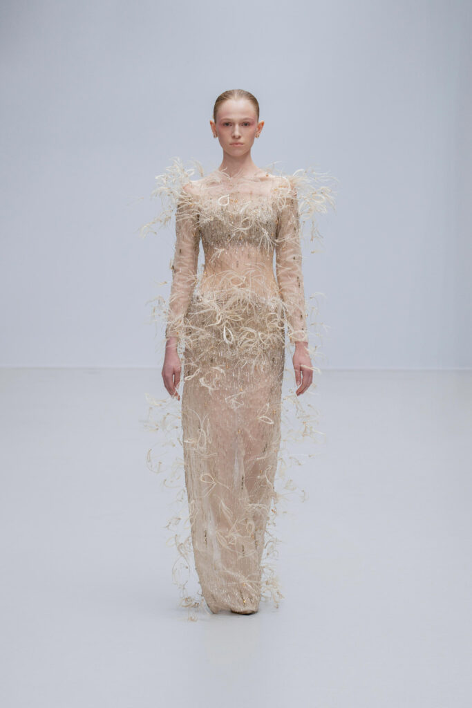 Loin d’une nostalgie figée, Phan Huy déclare « honorer les petites choses ». Ainsi, une robe « Filet » simule l’étreinte de la rivière par un drapé filet en soie lurex, tandis qu’une cape « Charbon » reproduit la fumée des foyers ruraux via une teinture dégradée anthracite-cendre. Les 36 silhouettes, toutes cousues main, privilégient la fluidité : les épaules s’arrondissent comme la voûte d’un toit de chaume, les jupes frémissent tel un champ de riz mûr sous le vent.