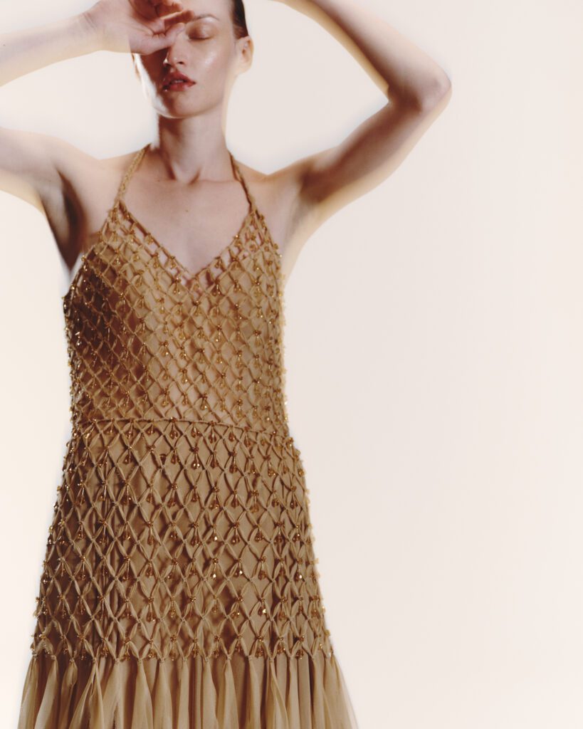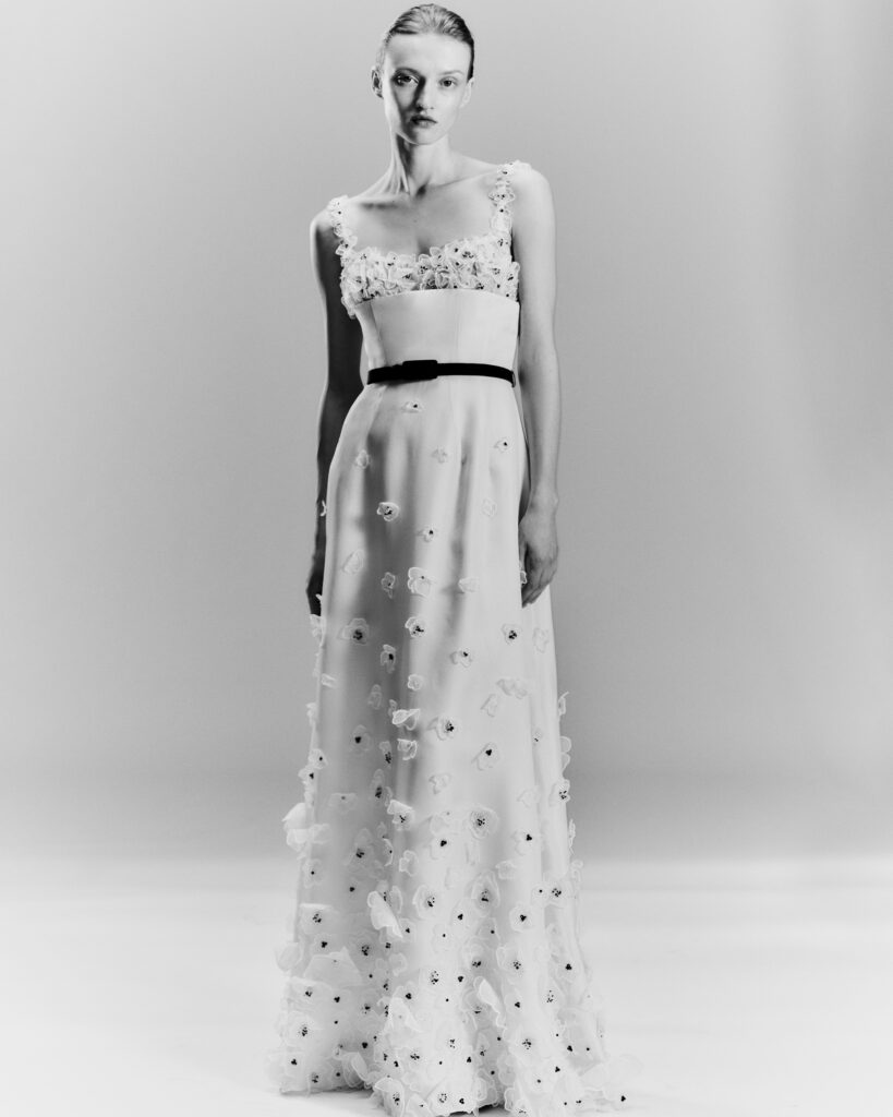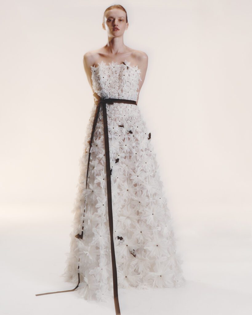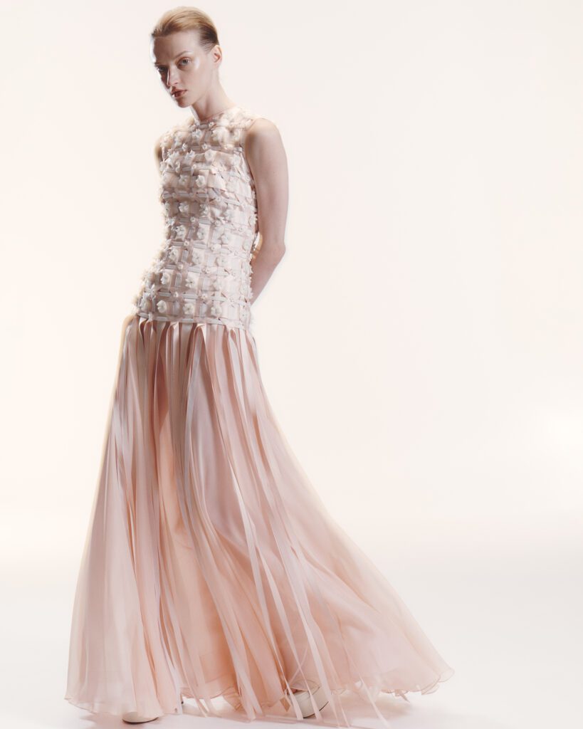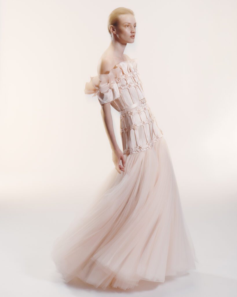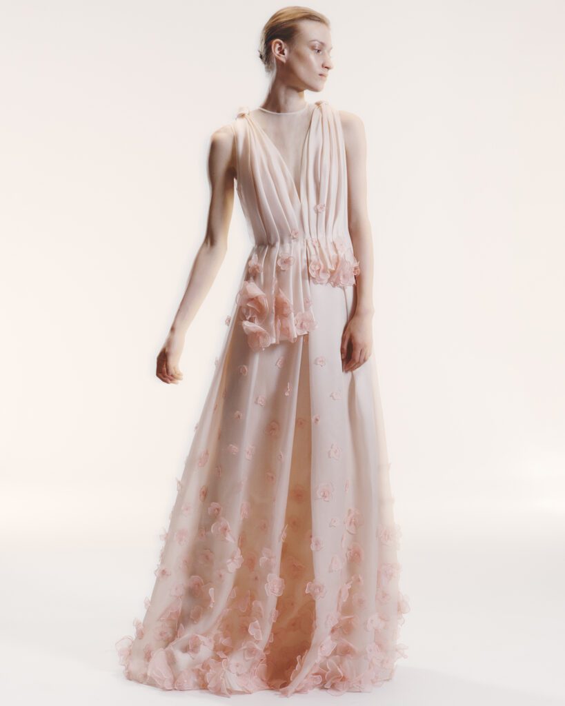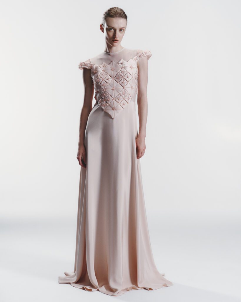 • Éclosion : micro-robes en taffetas blush plissées en rosace, épaule libre, taille soulignée d’un nœud minimal.