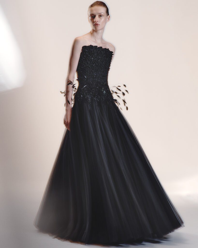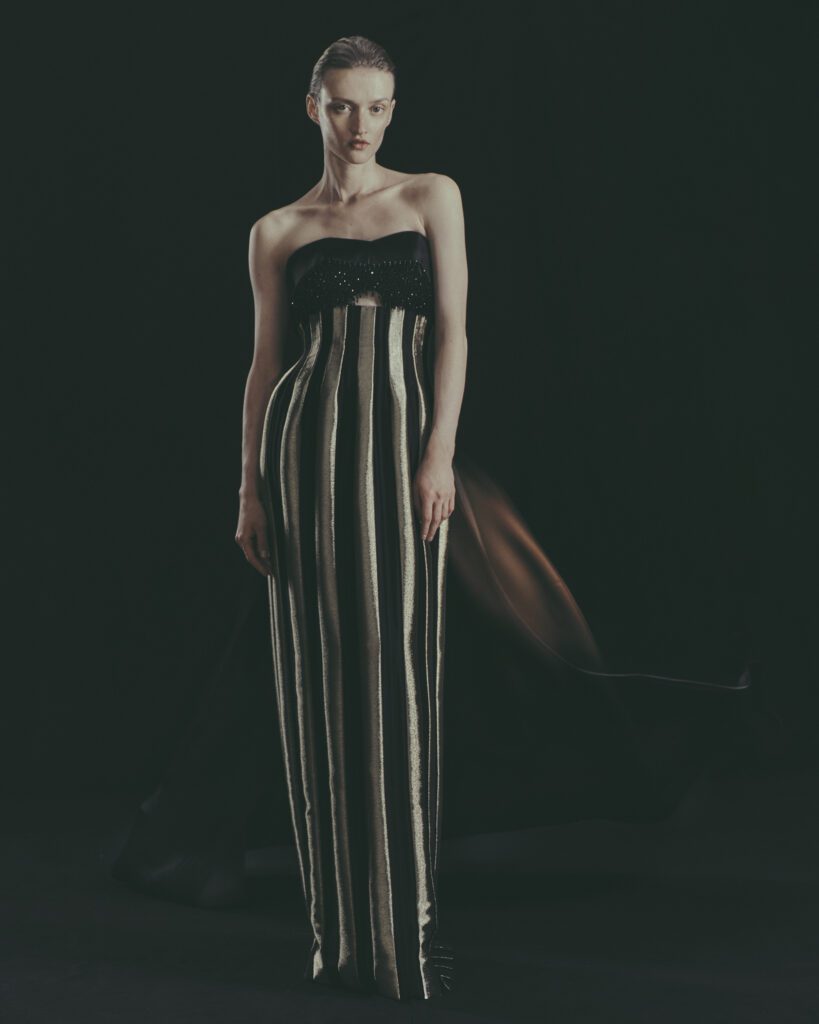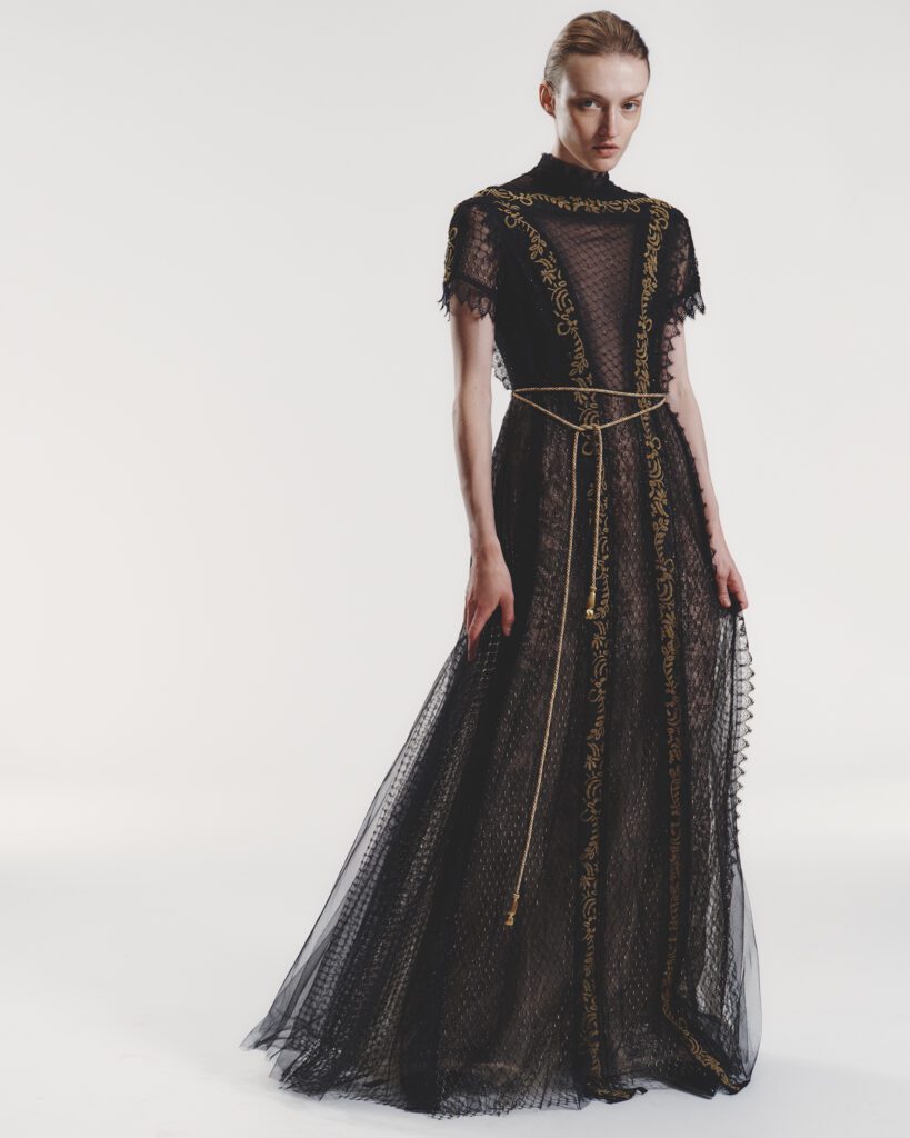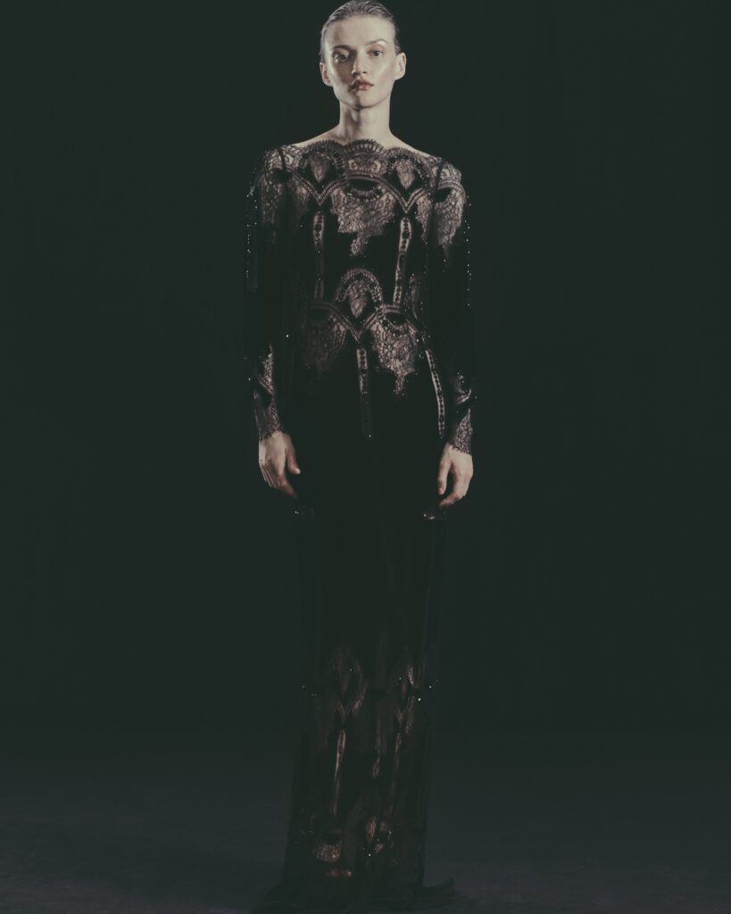 • Résonance : longues colonnes de crêpe graphite fendues jusqu’à la cuisse, dormantes sous un boléro origami perlé de jais noir.