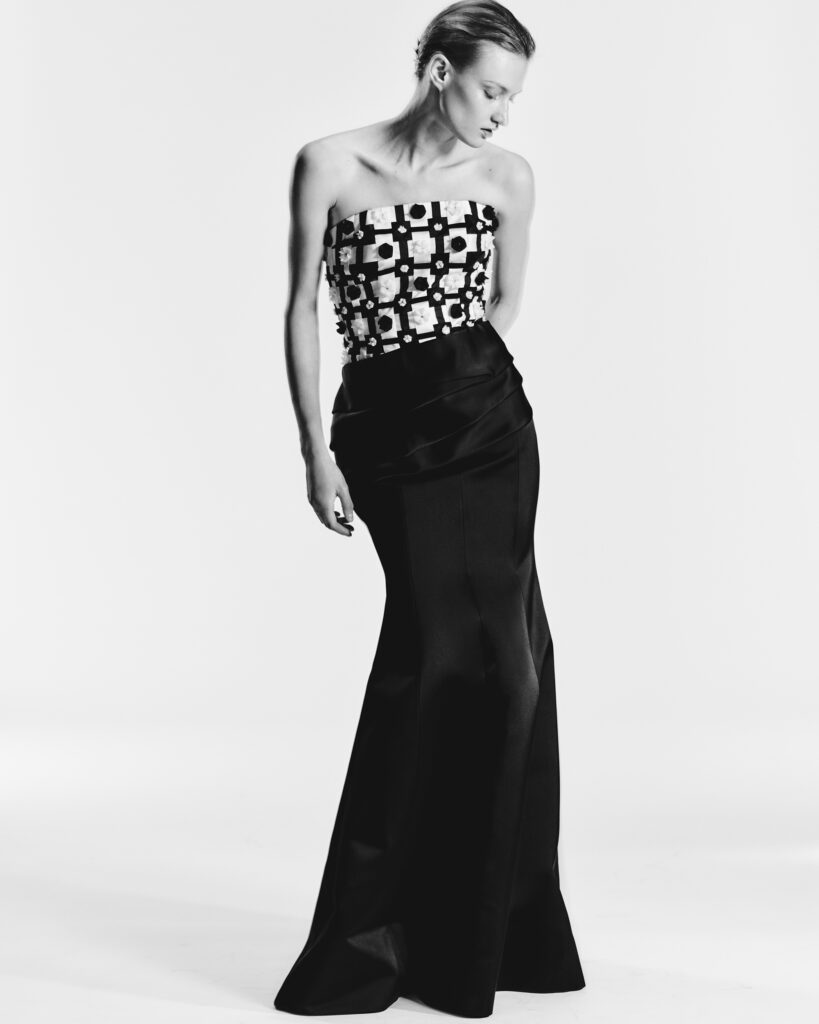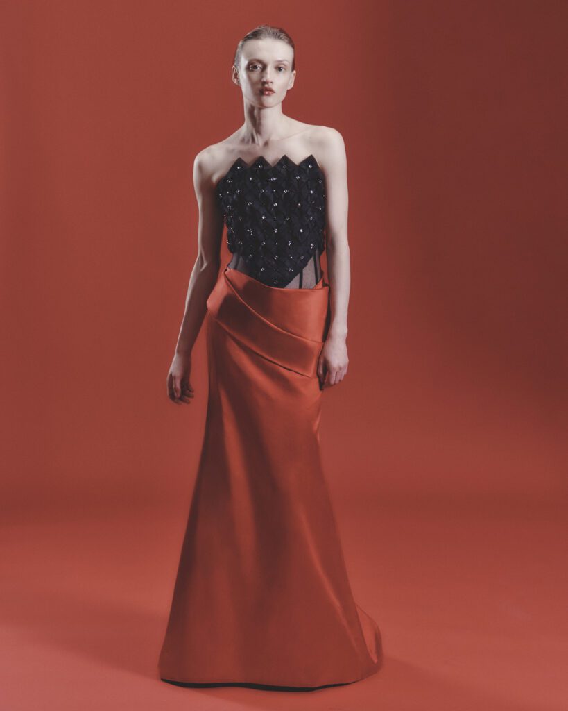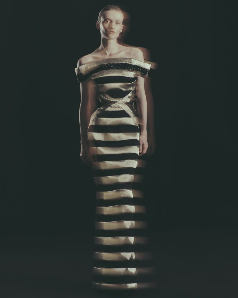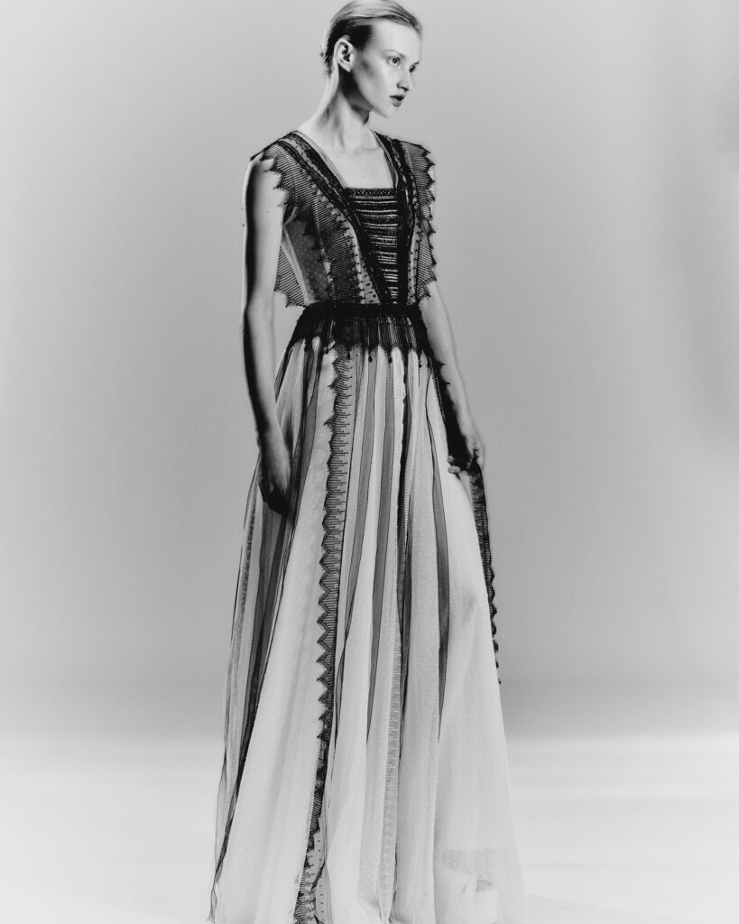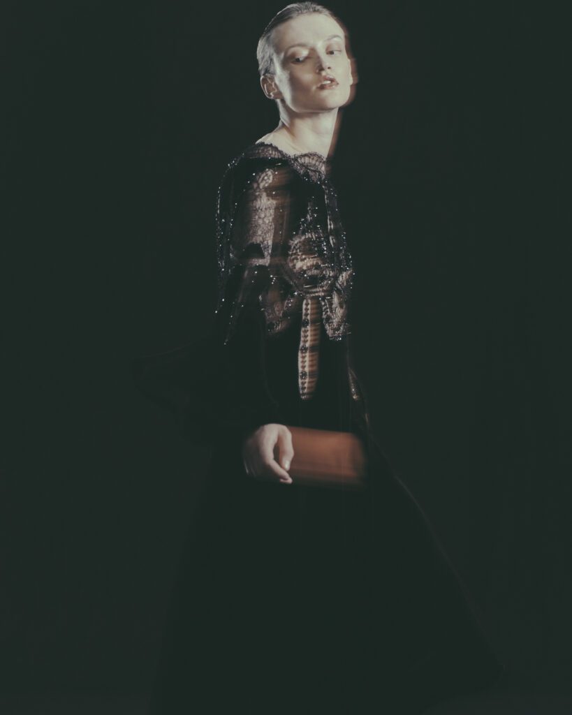 • Résonance : longues colonnes de crêpe graphite fendues jusqu’à la cuisse, dormantes sous un boléro origami perlé de jais noir.