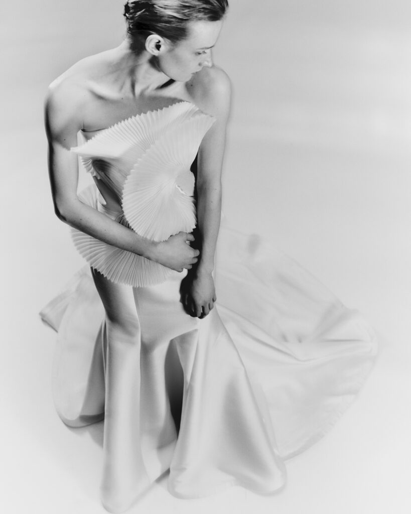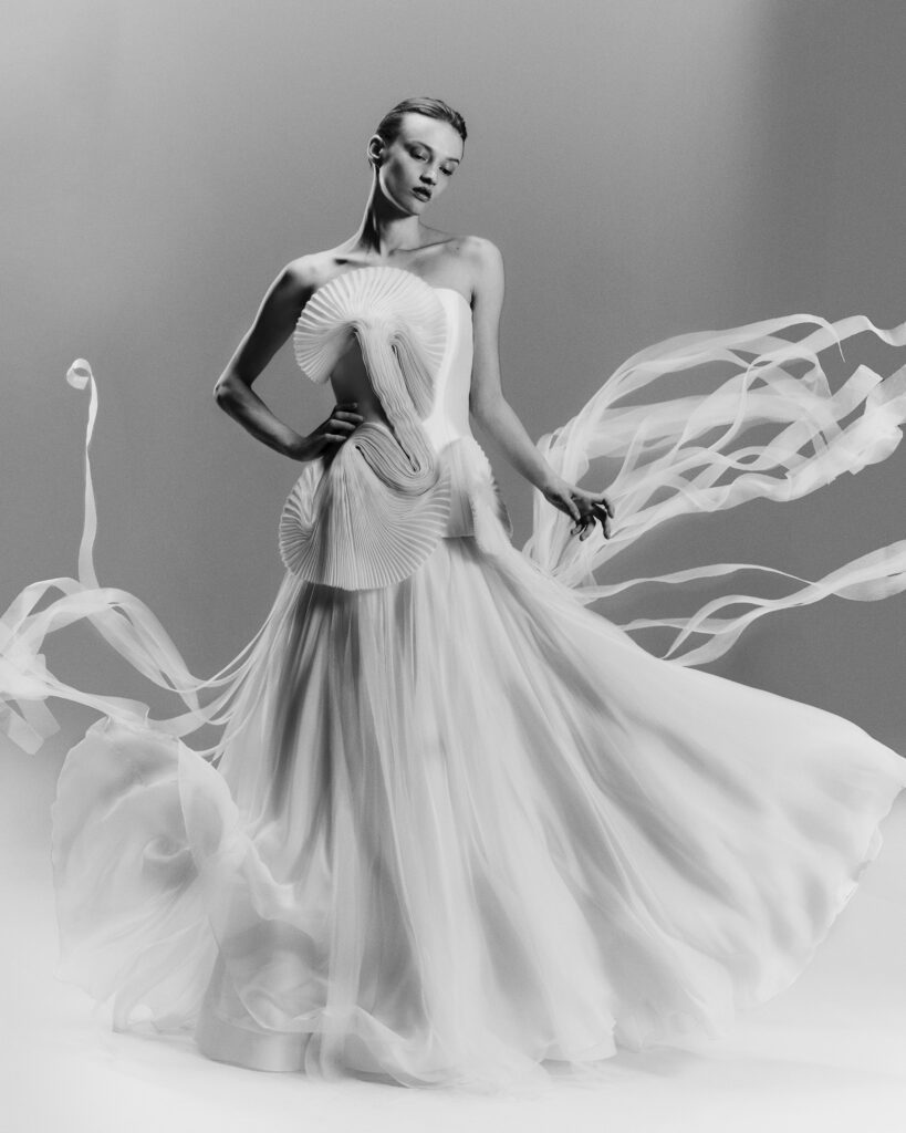 Chez by FANG, le pli n’est ni artifice ni citation : il est langage. Sur des soies techniques fumées, la créatrice reproduit la chorégraphie ancestrale apprise dans l’enfance ; chaque crête, chaque vallée naît d’une « danse du doigt » aussi codifiée qu’un idéogramme. Sous la lumière, ces reliefs — parfois gainés d’organza laqué, parfois ourlés de surpiqûres ton sur ton — transforment la surface plane en architecture vivante.