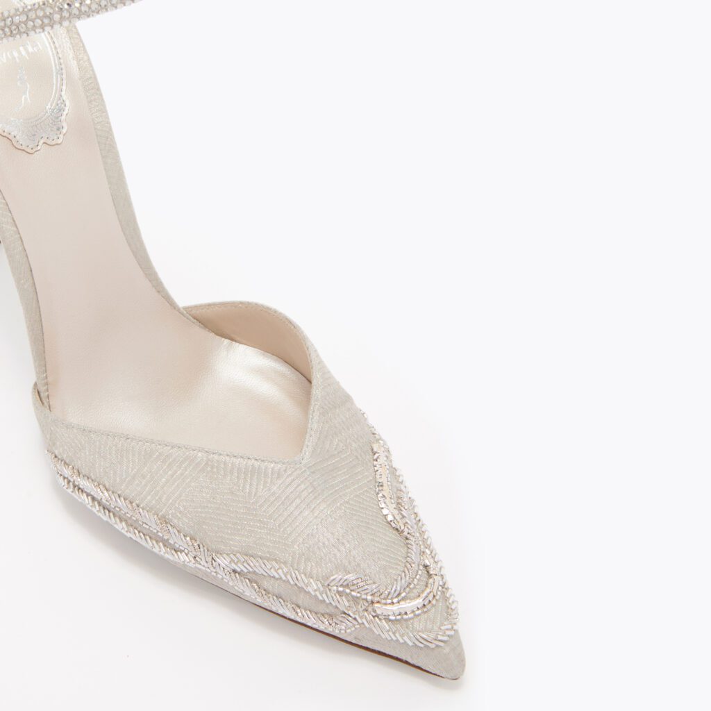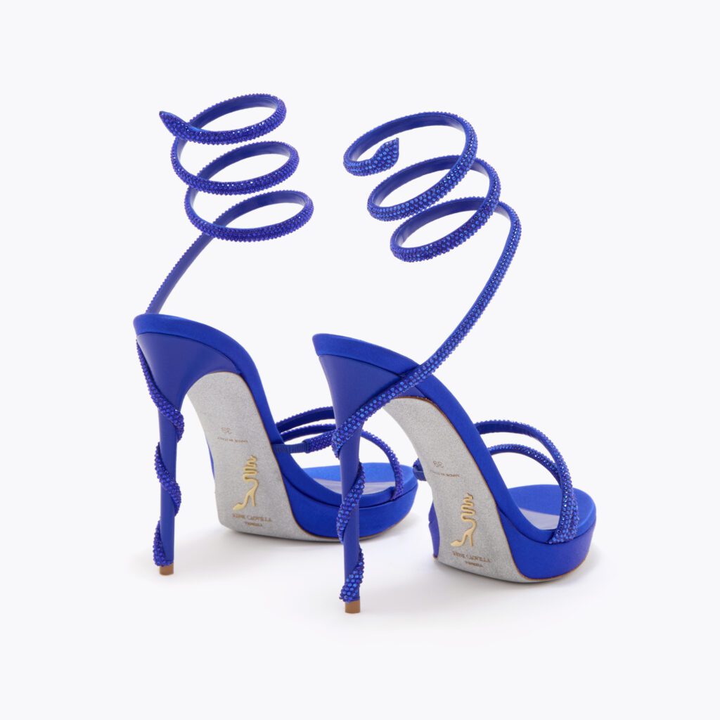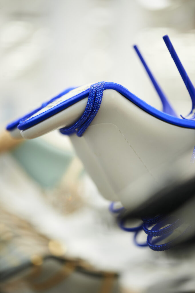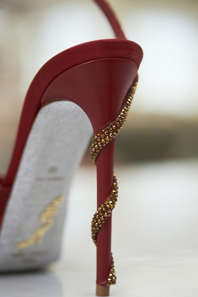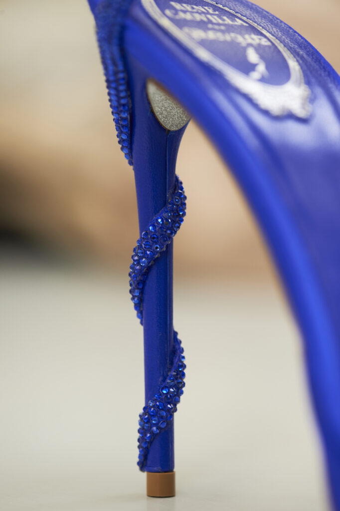 Parmi les modèles, la sandale Chandelier se distingue avec ses trois déclinaisons en satin et brocart indien ivoire et champagne, perchée sur un talon de 105 mm et ornée de pampilles en cristal évoquant la légèreté opulente des grands soirs. Le modèle Margot ose un twist dramatique : version plateforme rouge satinée serpent doré ou bleu électrique à cristaux ton sur ton. Enfin, la Cleo pump, en brocard noir profond ou ivoire doux, distille une élégance feutrée, soulignée de détails cristallins discrets.