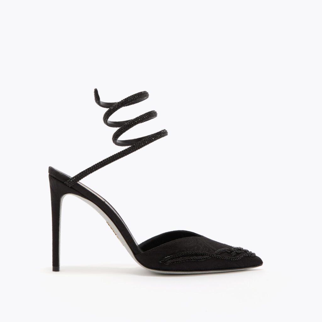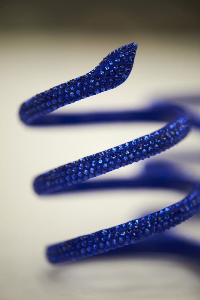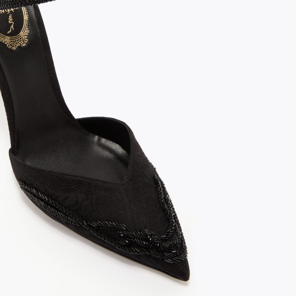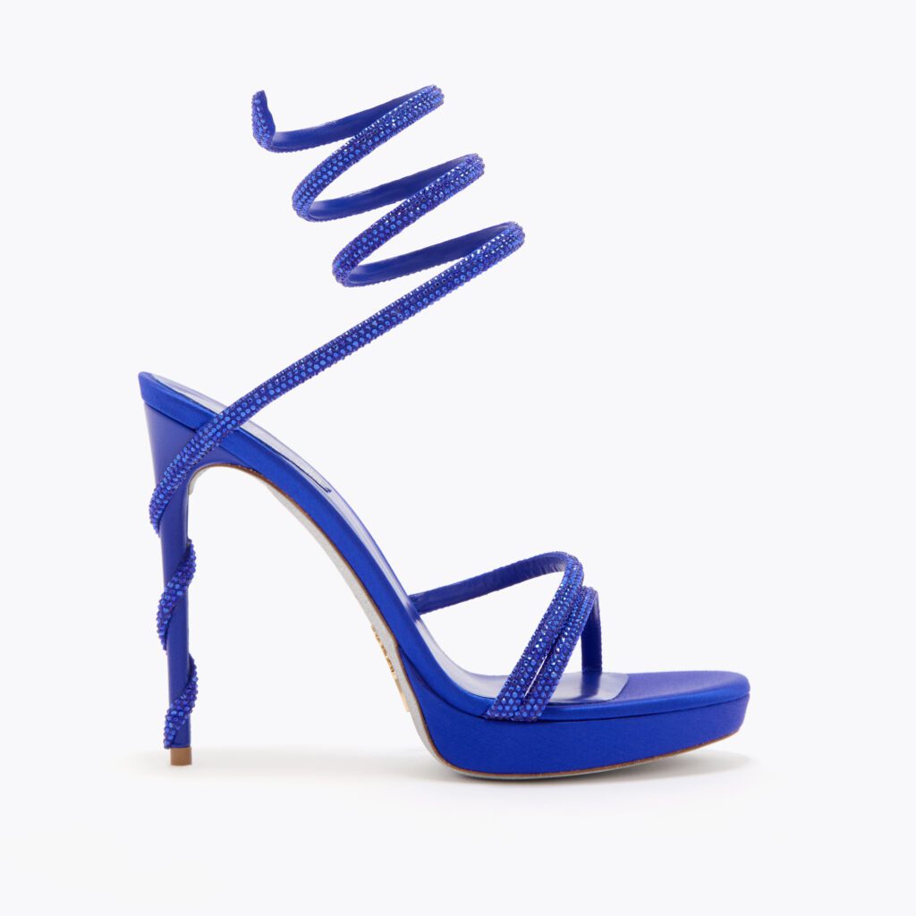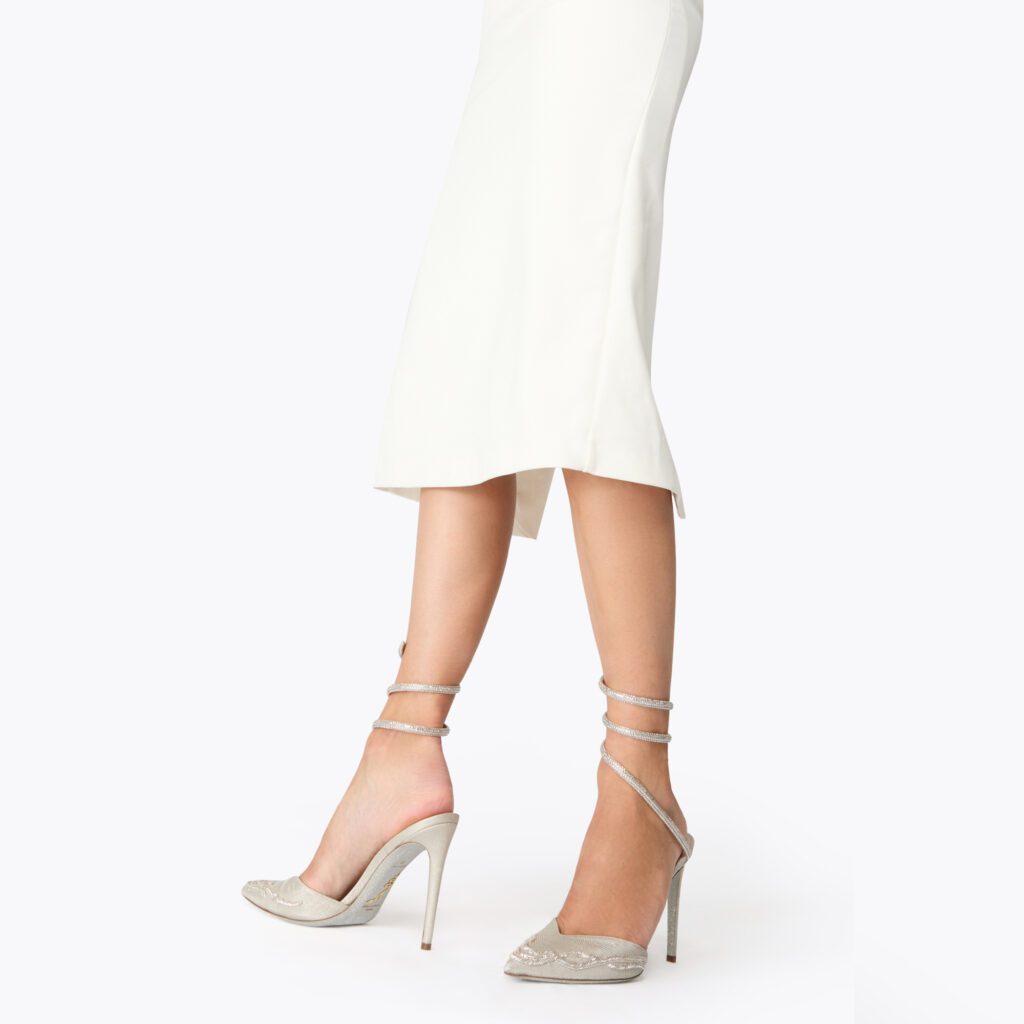 Parmi les modèles, la sandale Chandelier se distingue avec ses trois déclinaisons en satin et brocart indien ivoire et champagne, perchée sur un talon de 105 mm et ornée de pampilles en cristal évoquant la légèreté opulente des grands soirs. Le modèle Margot ose un twist dramatique : version plateforme rouge satinée serpent doré ou bleu électrique à cristaux ton sur ton. Enfin, la Cleo pump, en brocard noir profond ou ivoire doux, distille une élégance feutrée, soulignée de détails cristallins discrets.