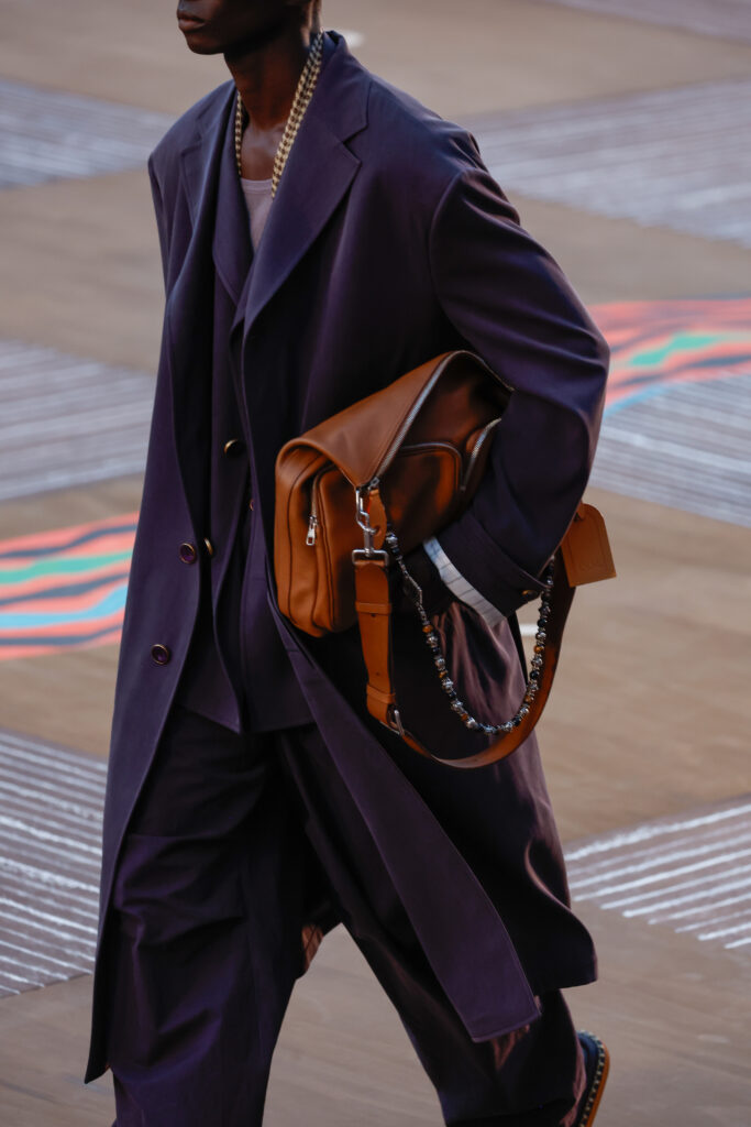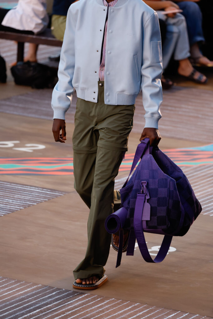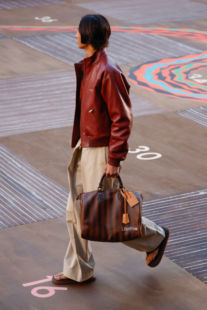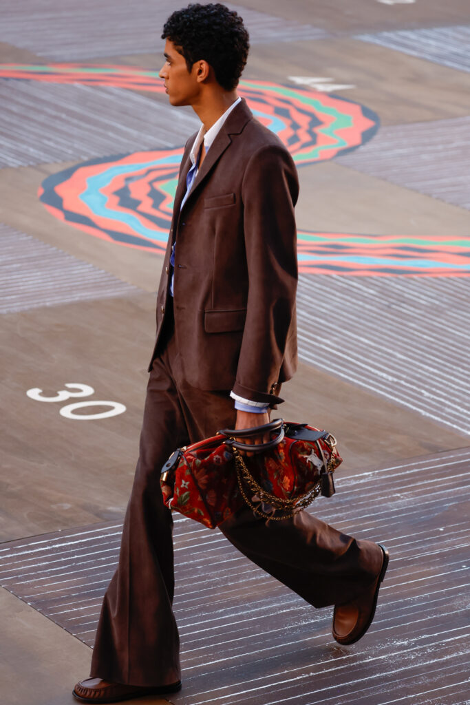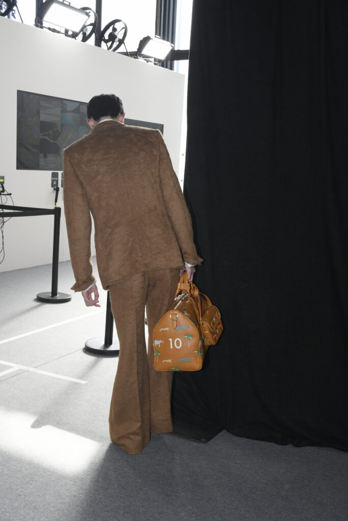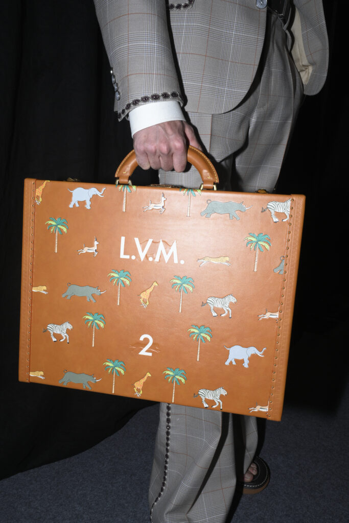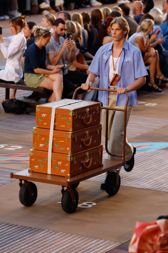 Événement marquant : Louis Vuitton intègre pour la première fois les imprimés et bagages conçus en 2007 pour le film culte de Wes Anderson, The Darjeeling Limited. On retrouve ces motifs sur des vestes brodées, des sacs monogrammés délavés ou encore des sneakers Buttersoft. Une manière brillante de faire entrer le cinéma dans le patrimoine maroquinier de la Maison.