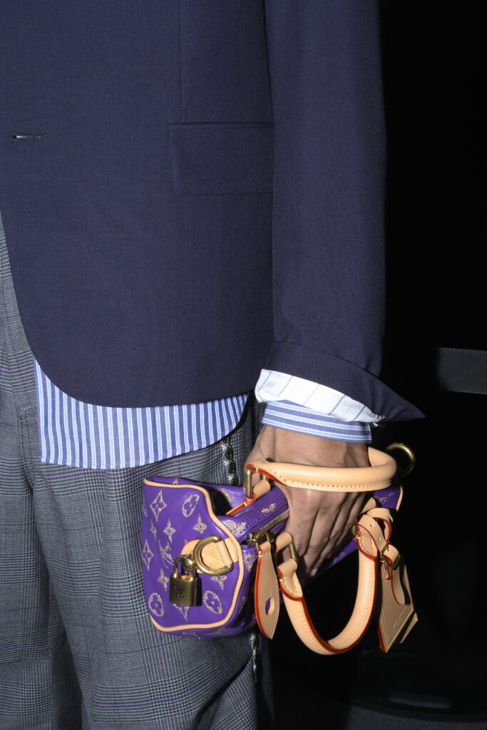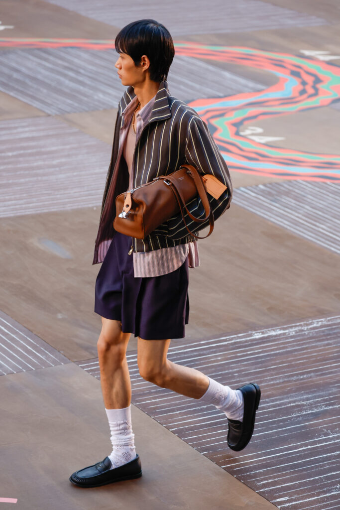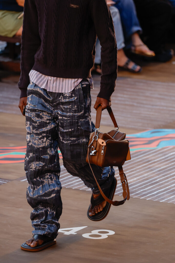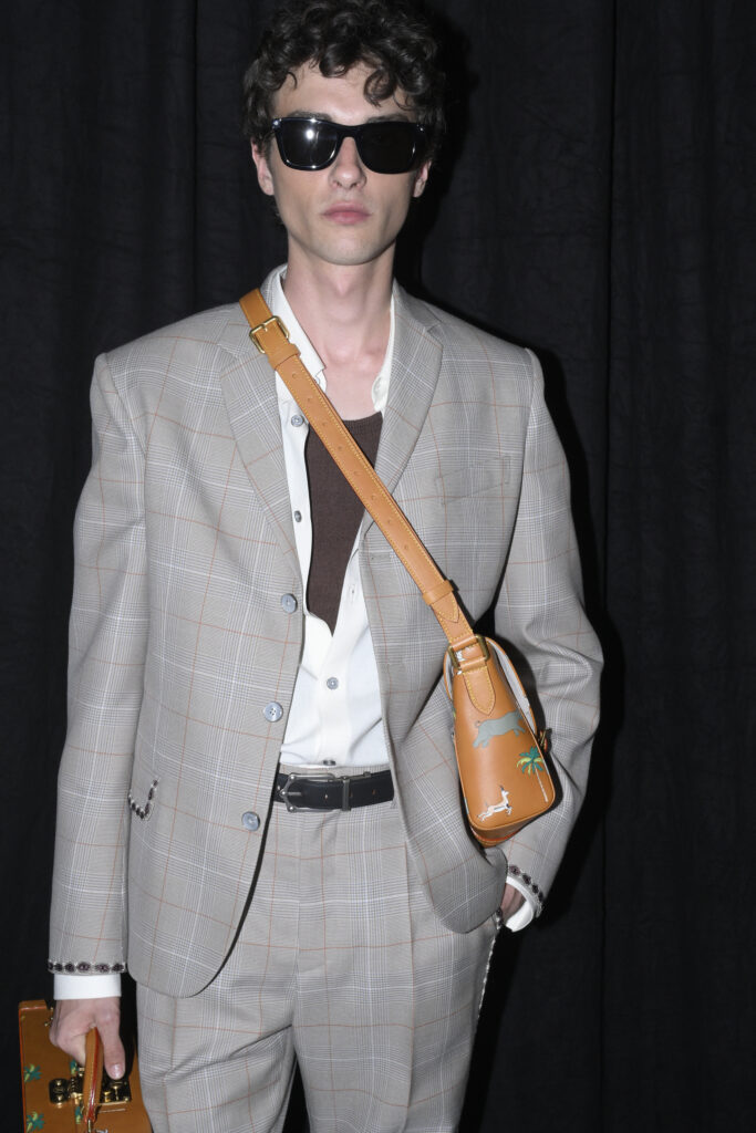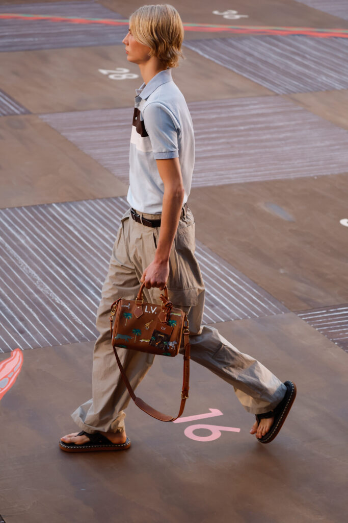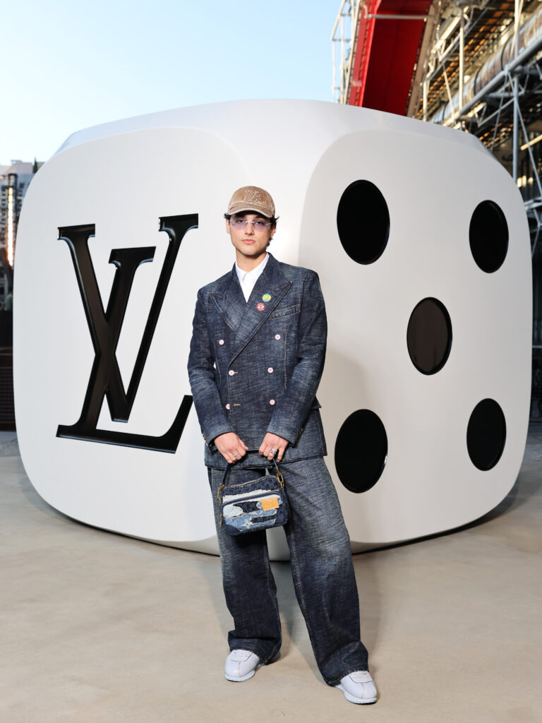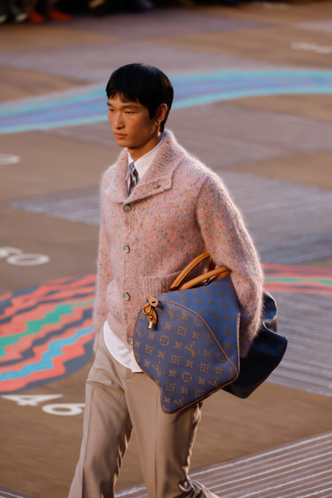 Événement marquant : Louis Vuitton intègre pour la première fois les imprimés et bagages conçus en 2007 pour le film culte de Wes Anderson, The Darjeeling Limited. On retrouve ces motifs sur des vestes brodées, des sacs monogrammés délavés ou encore des sneakers Buttersoft. Une manière brillante de faire entrer le cinéma dans le patrimoine maroquinier de la Maison.