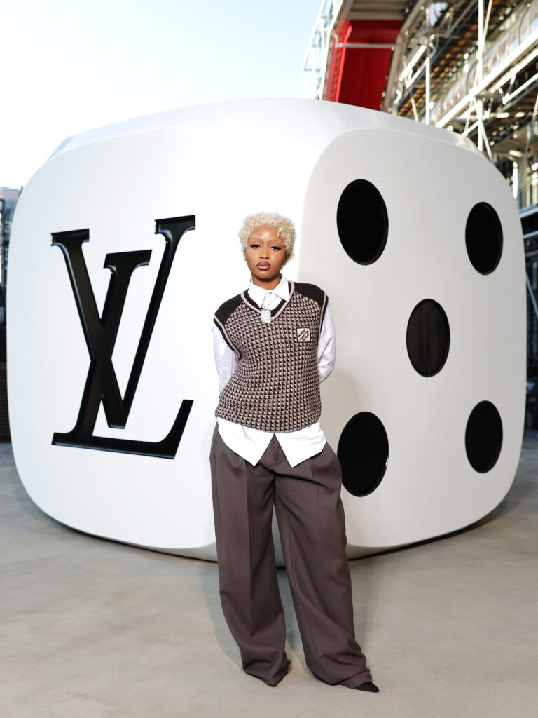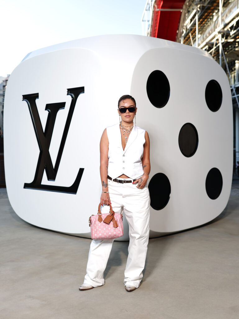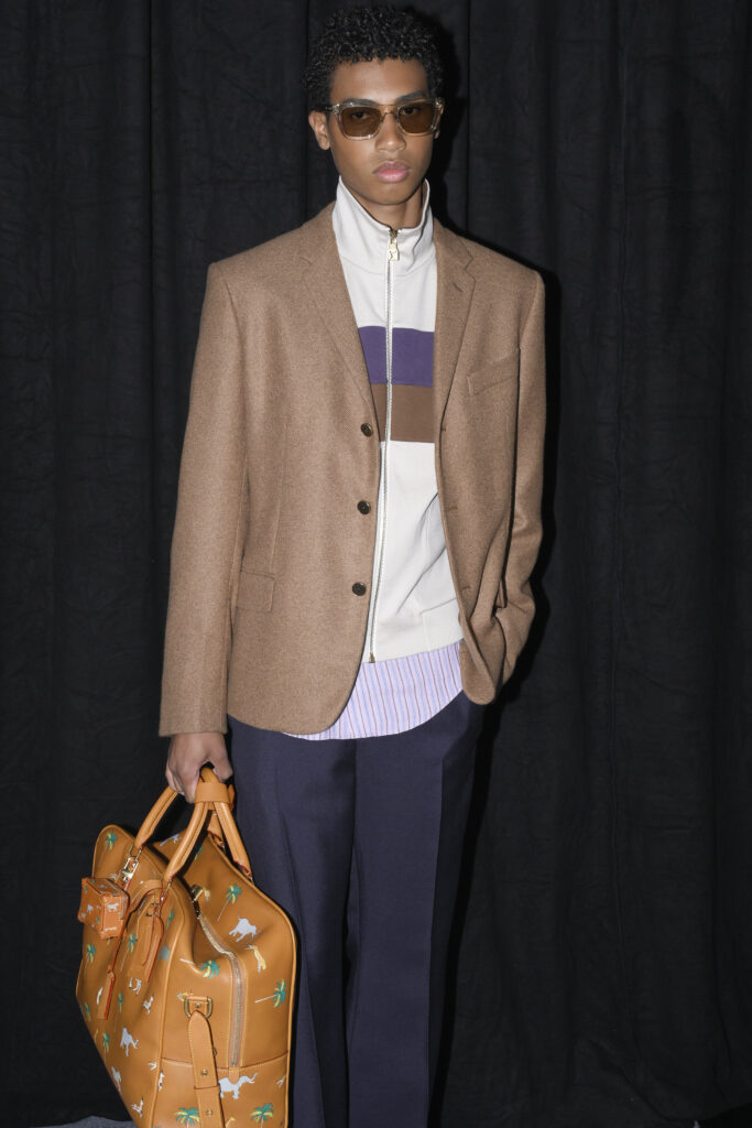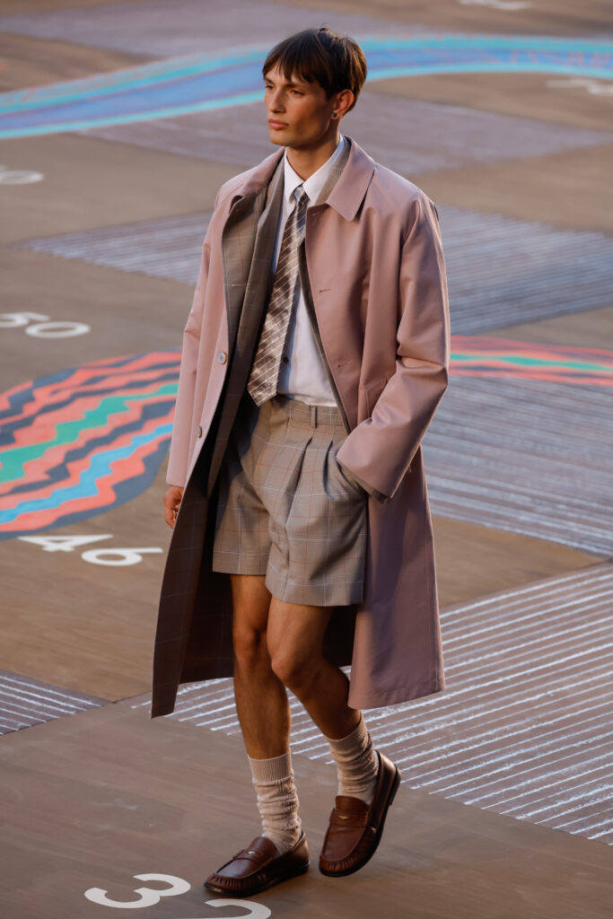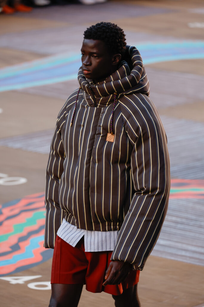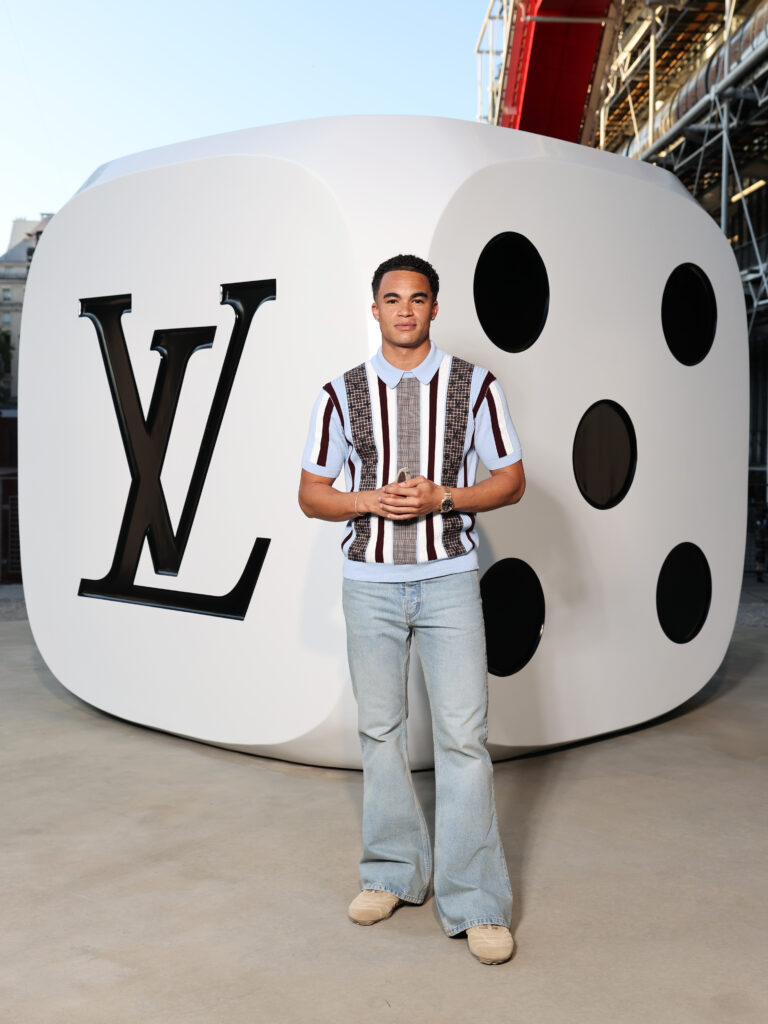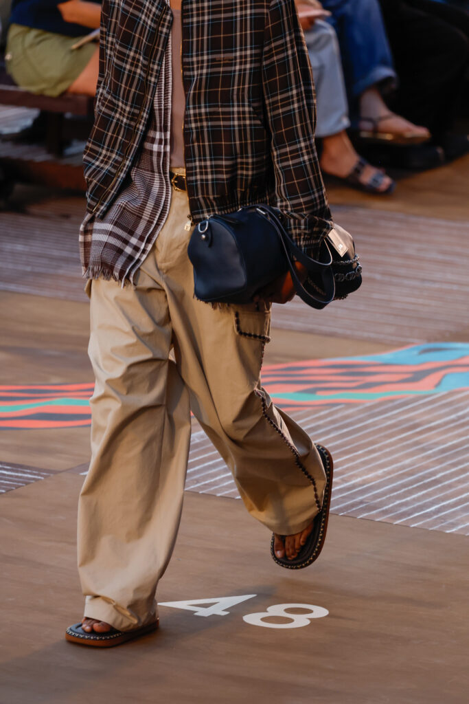 Événement marquant : Louis Vuitton intègre pour la première fois les imprimés et bagages conçus en 2007 pour le film culte de Wes Anderson, The Darjeeling Limited. On retrouve ces motifs sur des vestes brodées, des sacs monogrammés délavés ou encore des sneakers Buttersoft. Une manière brillante de faire entrer le cinéma dans le patrimoine maroquinier de la Maison.