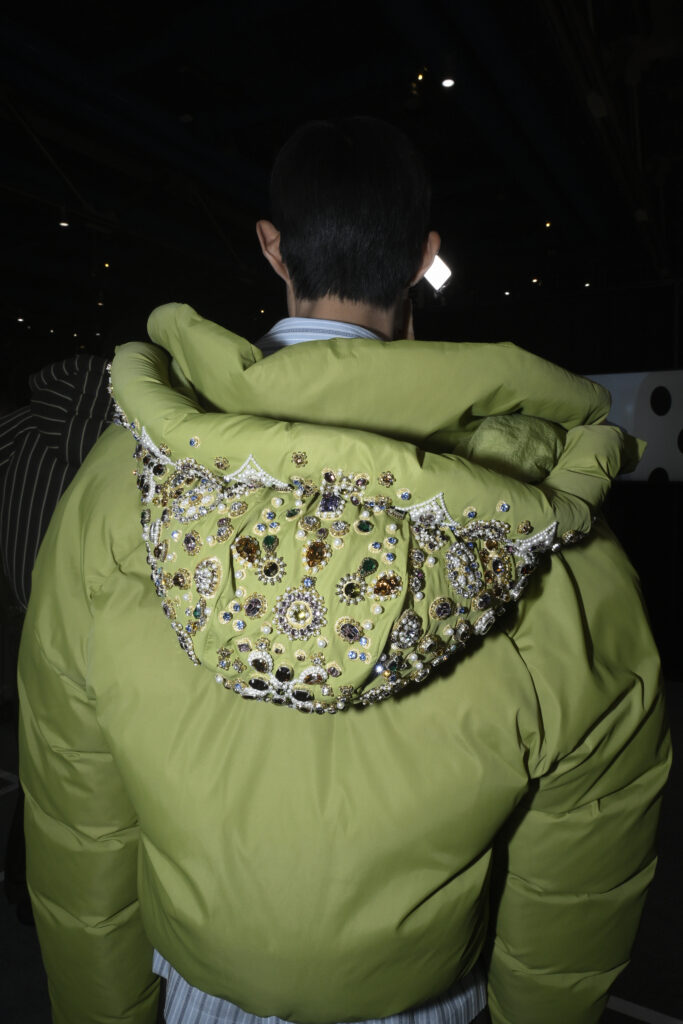 La collection rivalise de savoir-faire haute joaillerie textile : vestes brodées de pierres semi-précieuses, combinaisons en fils métalliques tissés, chaussettes en dentelle cristallisée, chapeaux patinés, ceintures en chaîne serties… Chaque pièce se lit comme une relique contemporaine.