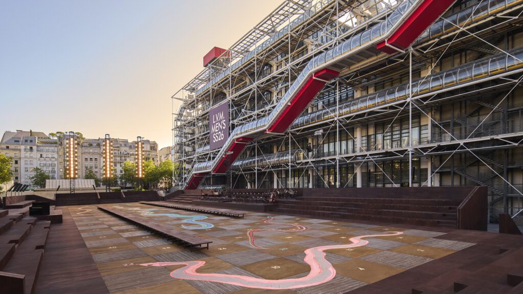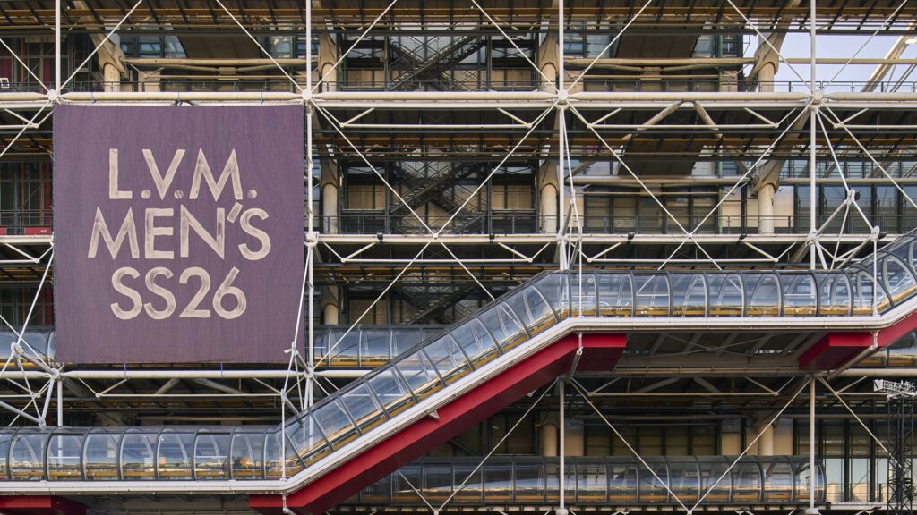 Avec la collection Louis Vuitton Homme Printemps-Été 2026, Pharrell Williams poursuit son dialogue interculturel et sensitif entamé depuis sa nomination à la direction artistique. Intitulée Paris to India, cette saison fait vibrer le tailoring masculin sous la lumière brûlante du sous-continent indien, à travers une scénographie monumentale imaginée avec Bijoy Jain de Studio Mumbai, installée sur le parvis du Centre Pompidou.