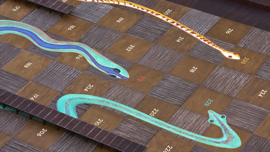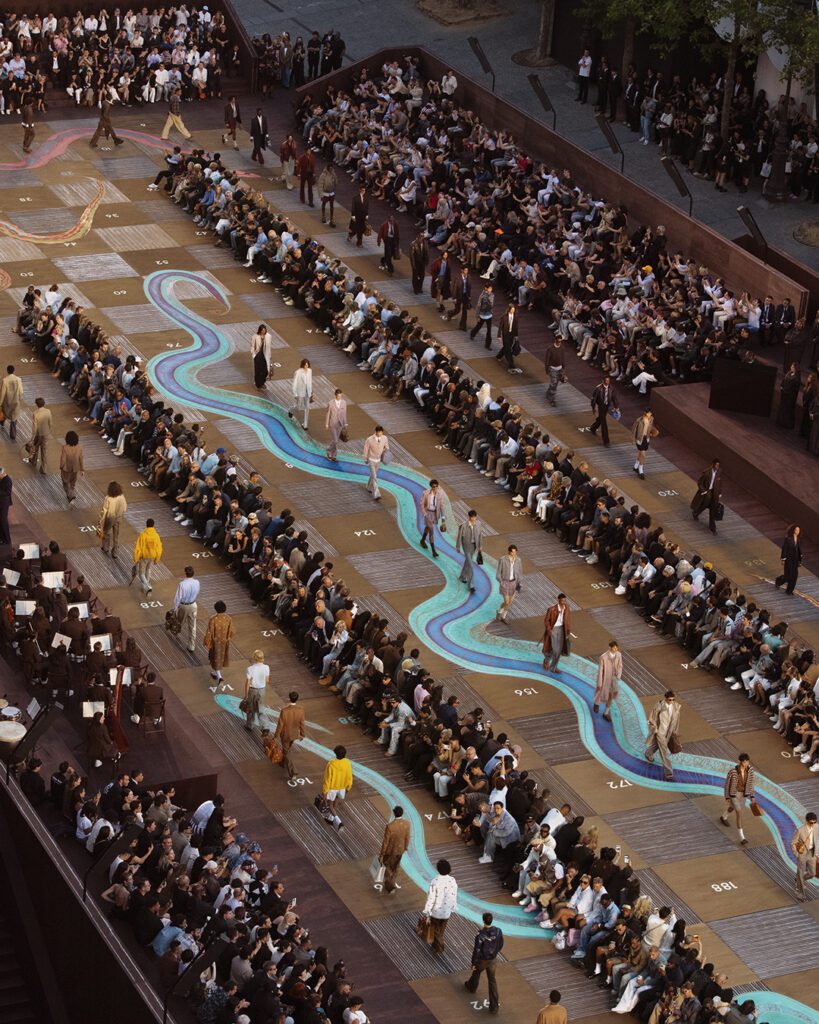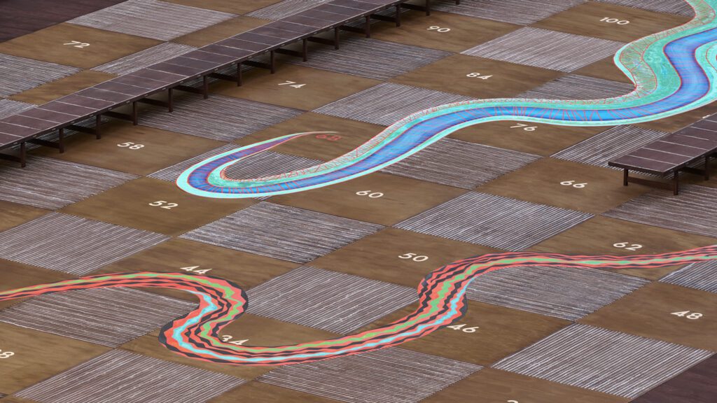 Au cœur de ce dispositif scénique : un plateau de Snakes and Ladders (l’équivalent indien du jeu de l’oie), devenu métaphore de l’élévation et des embûches, clin d’œil au parcours des créateurs et au credo de Pharrell : chaque pas est un acte de foi. Dans ce décor symbolique, les silhouettes apparaissent comme les pions d’un récit universel.