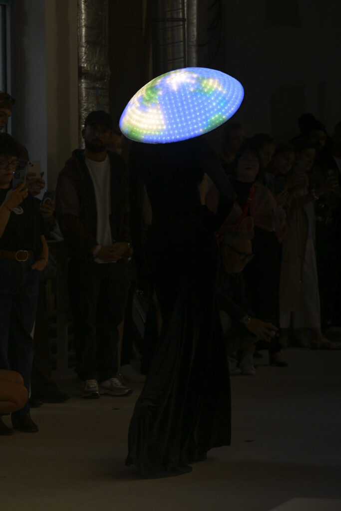 Ici, le vêtement n’est plus simplement matière — il respire, il pulse, il interagit. Il devient interface entre le corps et un monde fictionnel, connecté, en constante métamorphose. Le décor convoque à la fois les mirages désertiques de Vegas et une imagerie techno-chamanique digne d’un cabaret du futur.