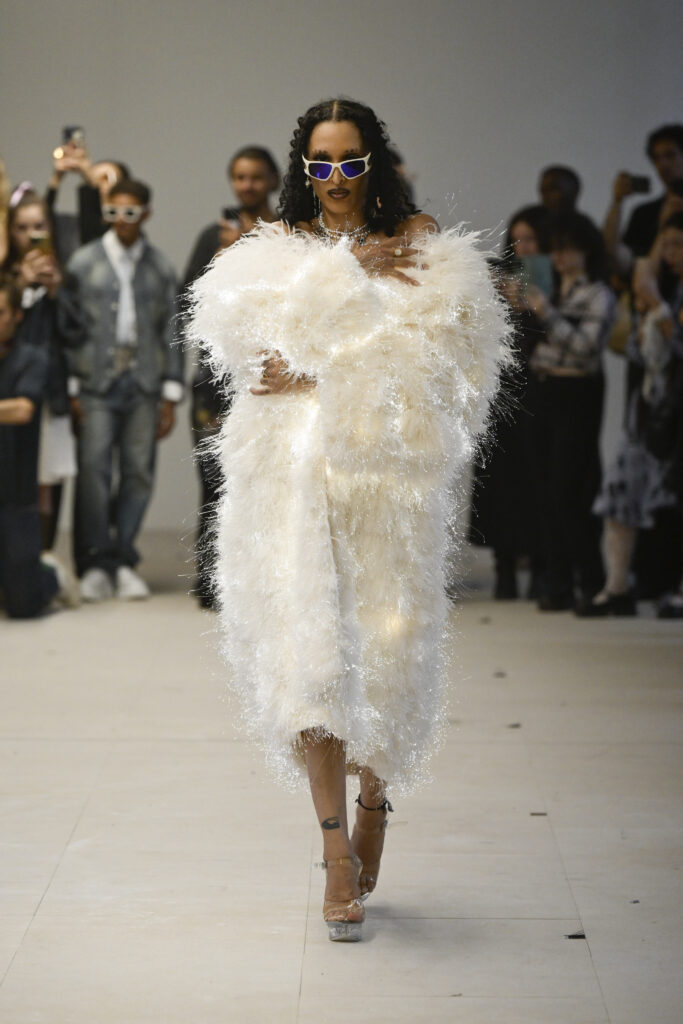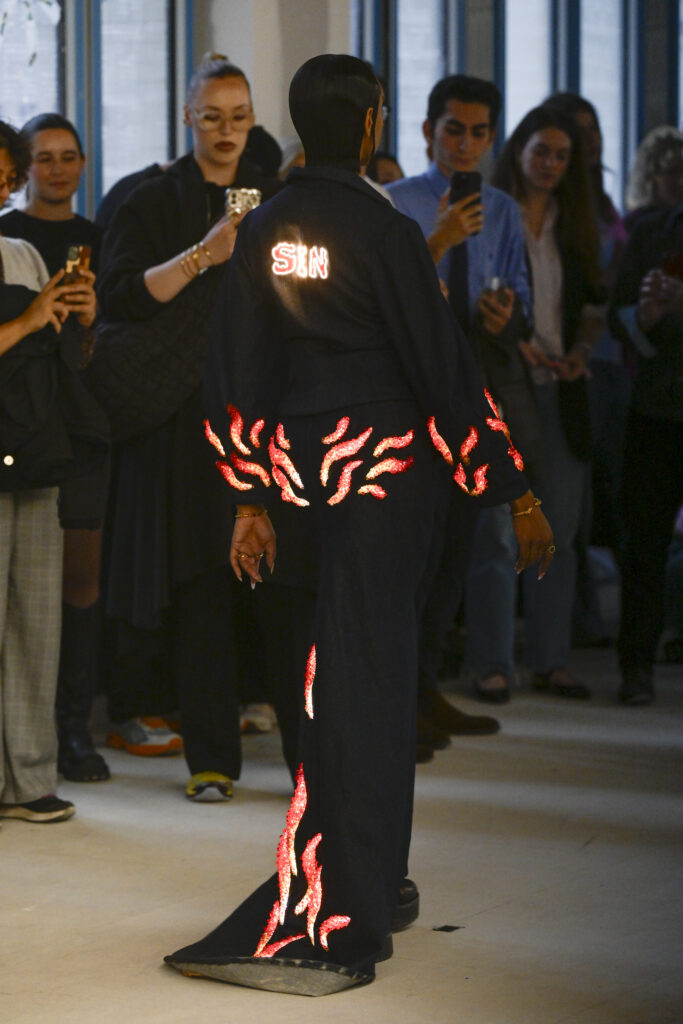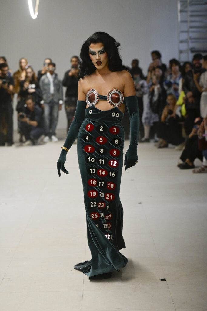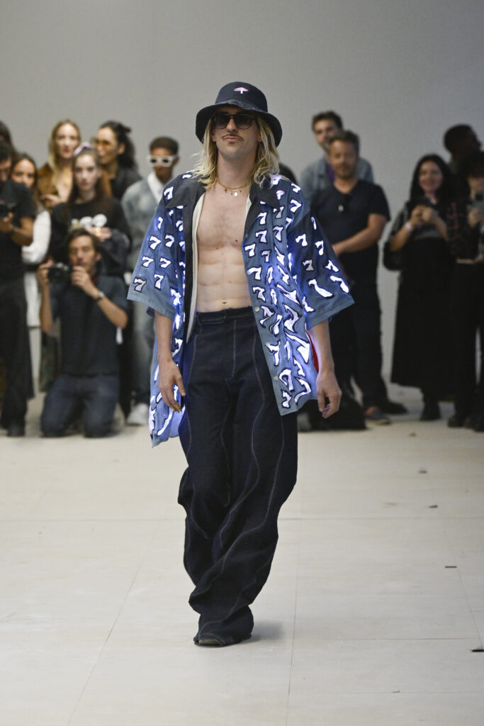 Fidèle à son ADN mêlant artisanat et haute technologie, Daguin insuffle à ses créations une vie propre : circuits lumineux, fibres optiques, broderies programmées. Les robes vibrent comme des jackpots, les vestes s’illuminent à la manière d’enseignes nocturnes. Parmi les pièces phares : la robe Bellagio, hommage aquatique aux célèbres fontaines ; un costume-laser fait de fils optiques colorés ; ou encore le look Pimp, porté par SDM, saturé de plumes holographiques et de fibres digitales.