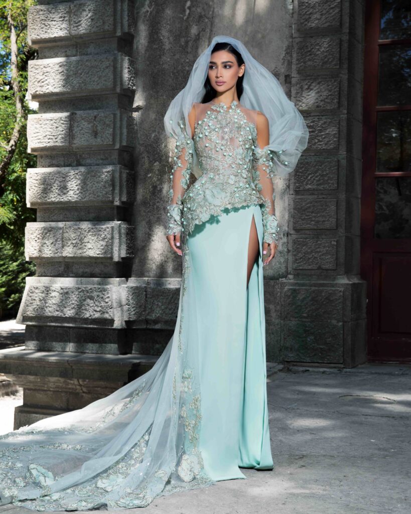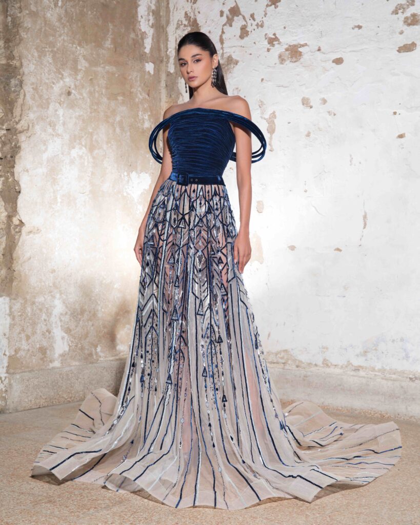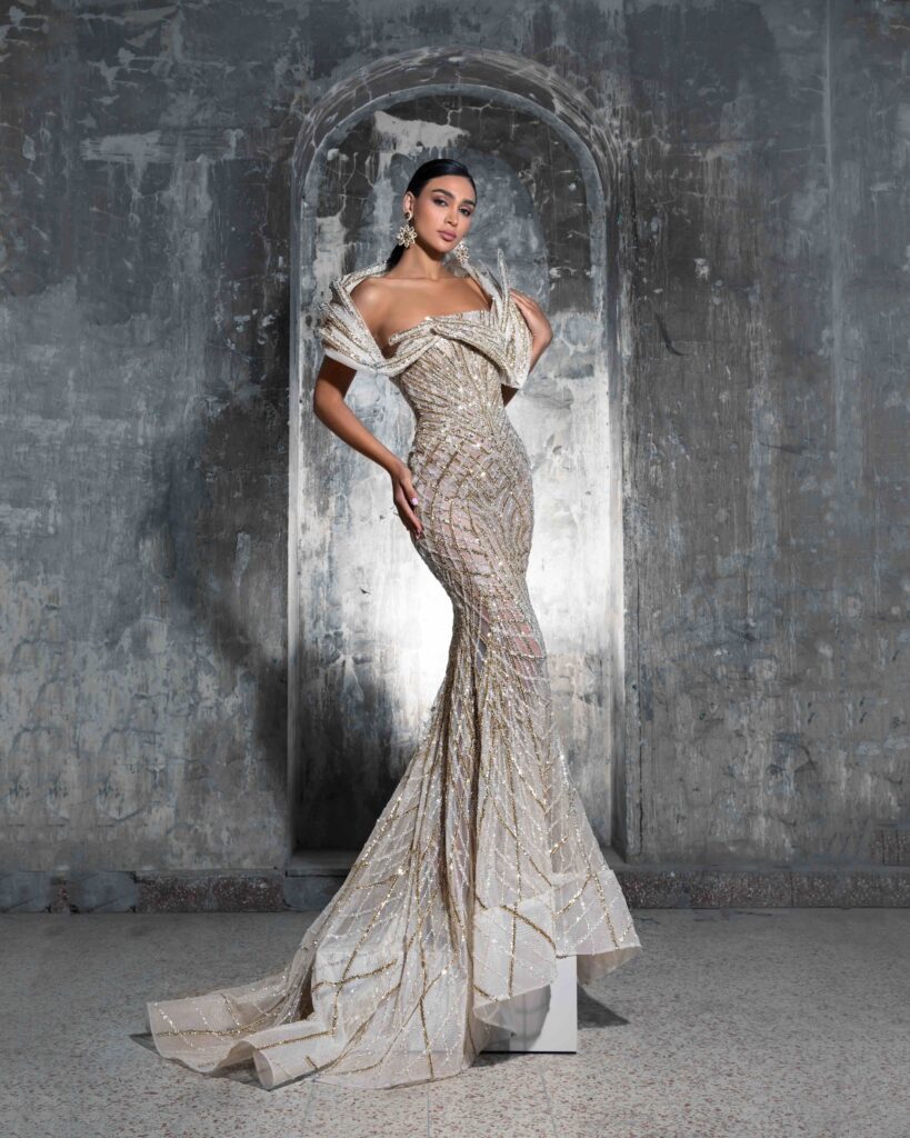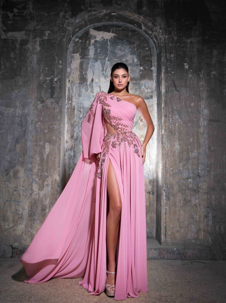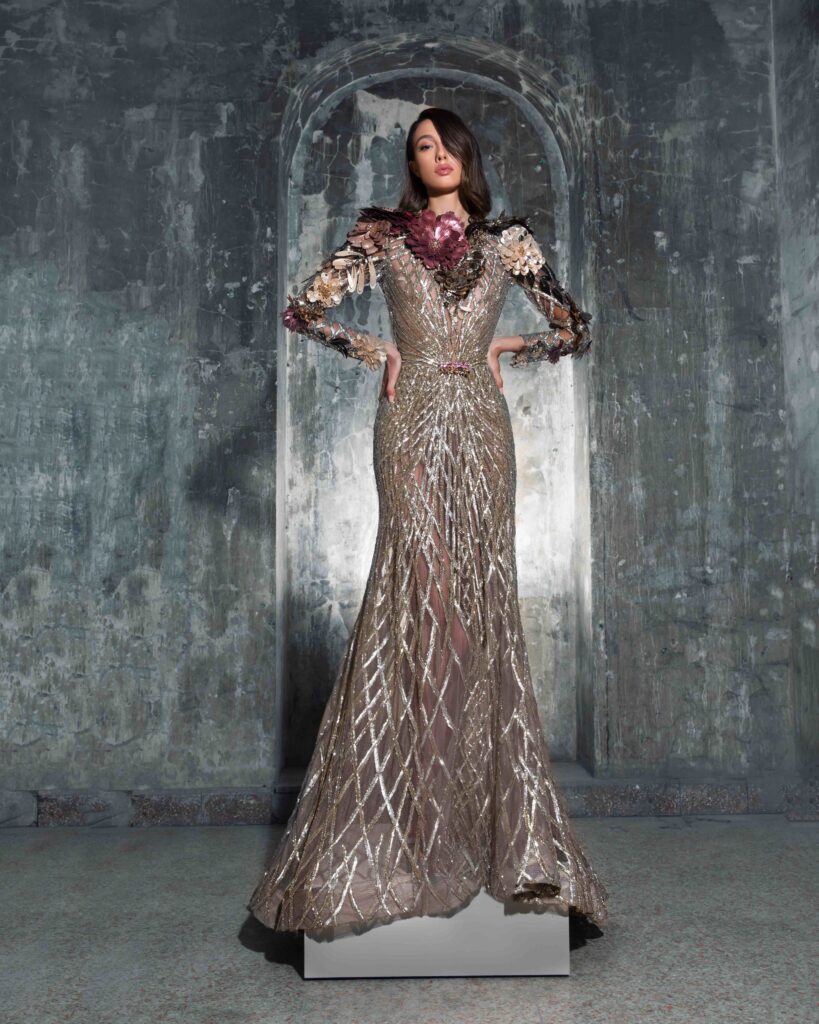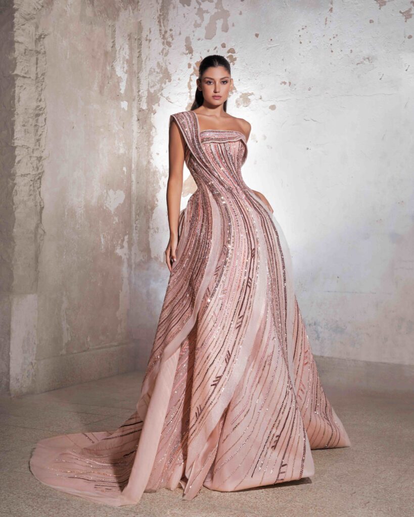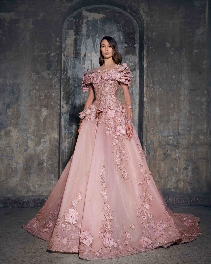 Chaque silhouette semble exhumée d’un coffre royal : velours grenat incrusté de constellations cristallines, mousseline rosée frôlée par des broderies florales, tulle fumé rehaussé de broches métalliques sculptées comme des reliques. Les tailles se cintrent, les bustiers s’évasent en traînes liquides, tandis que des épaules dénudées ou des fentes audacieuses injectent une sensualité contenue – le choc doux entre l’artisanat d’antan et l’audace contemporaine .