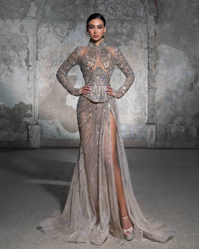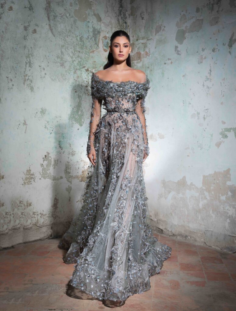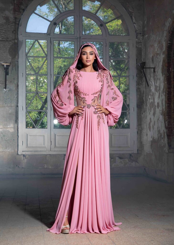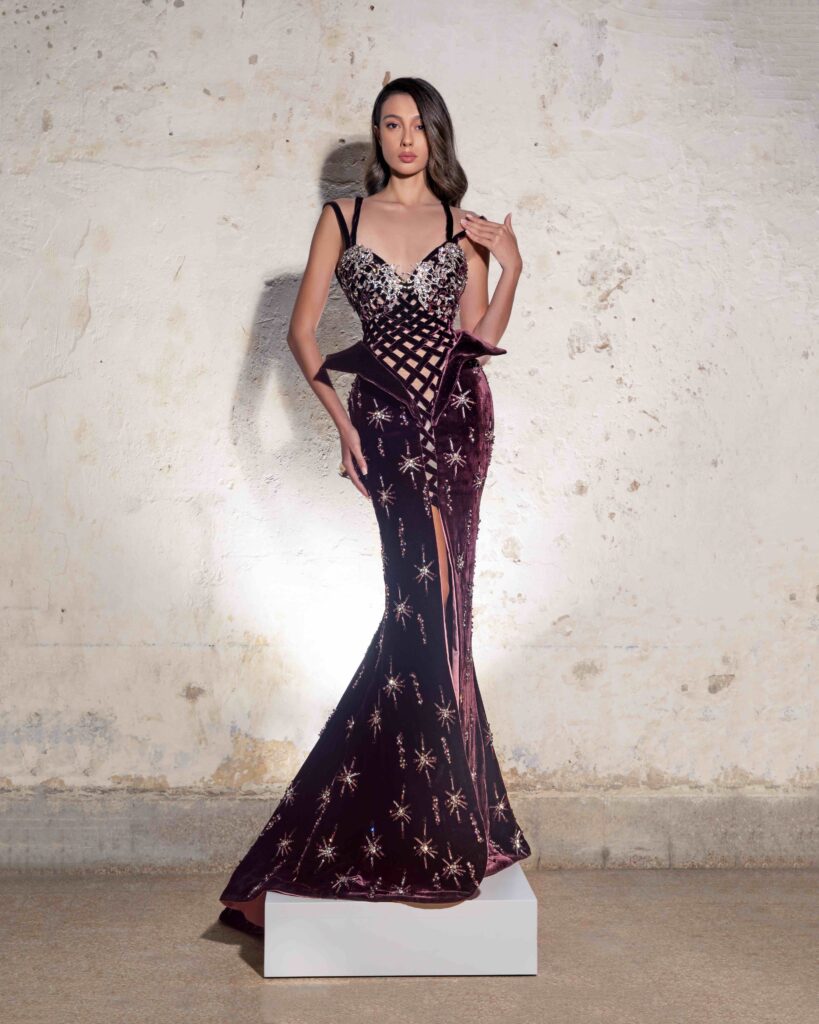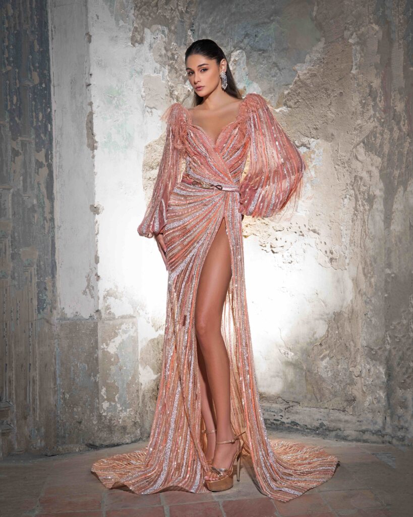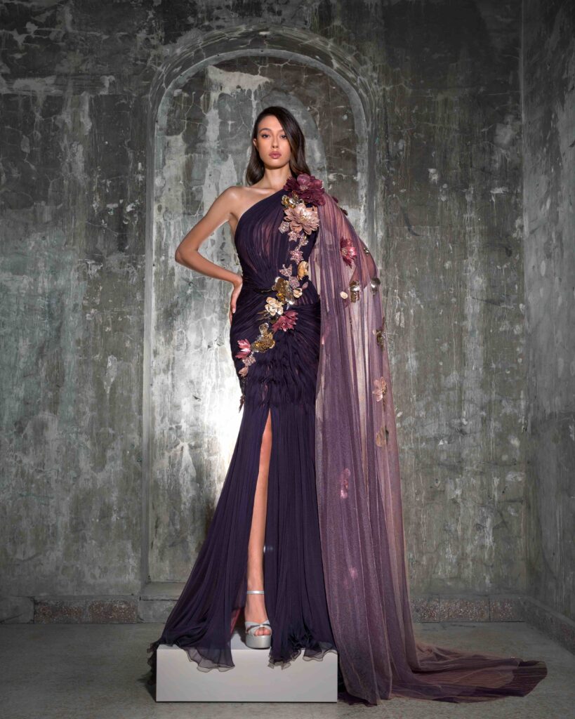 Chaque silhouette semble exhumée d’un coffre royal : velours grenat incrusté de constellations cristallines, mousseline rosée frôlée par des broderies florales, tulle fumé rehaussé de broches métalliques sculptées comme des reliques. Les tailles se cintrent, les bustiers s’évasent en traînes liquides, tandis que des épaules dénudées ou des fentes audacieuses injectent une sensualité contenue – le choc doux entre l’artisanat d’antan et l’audace contemporaine .