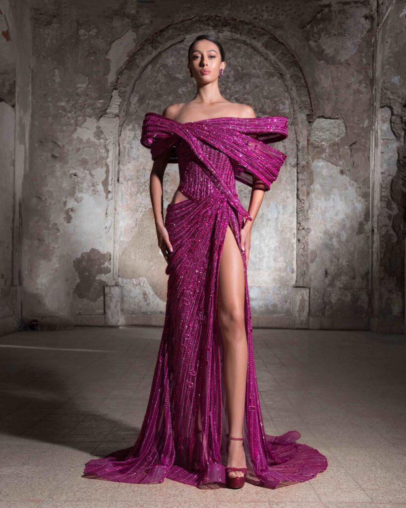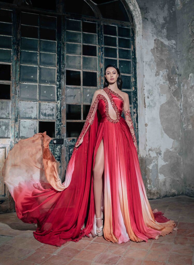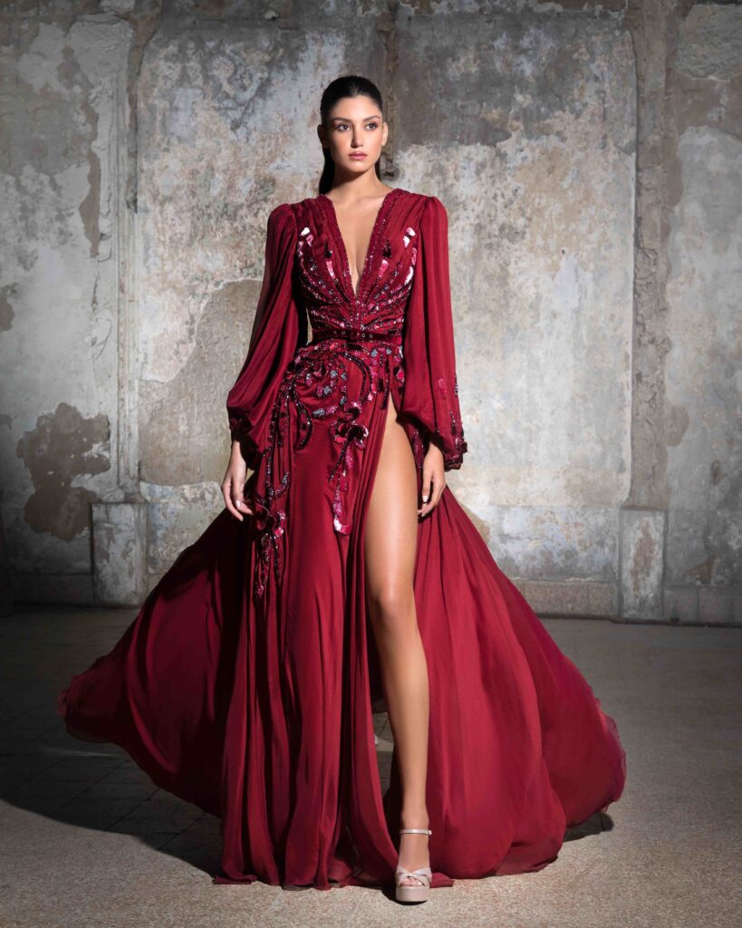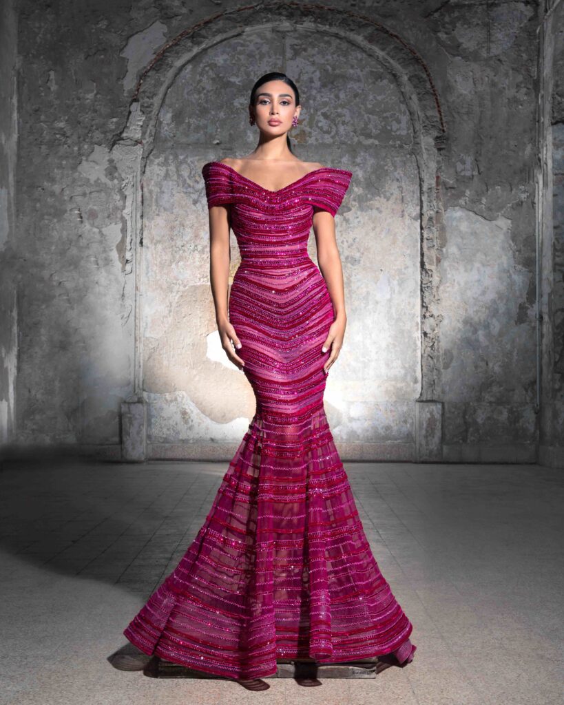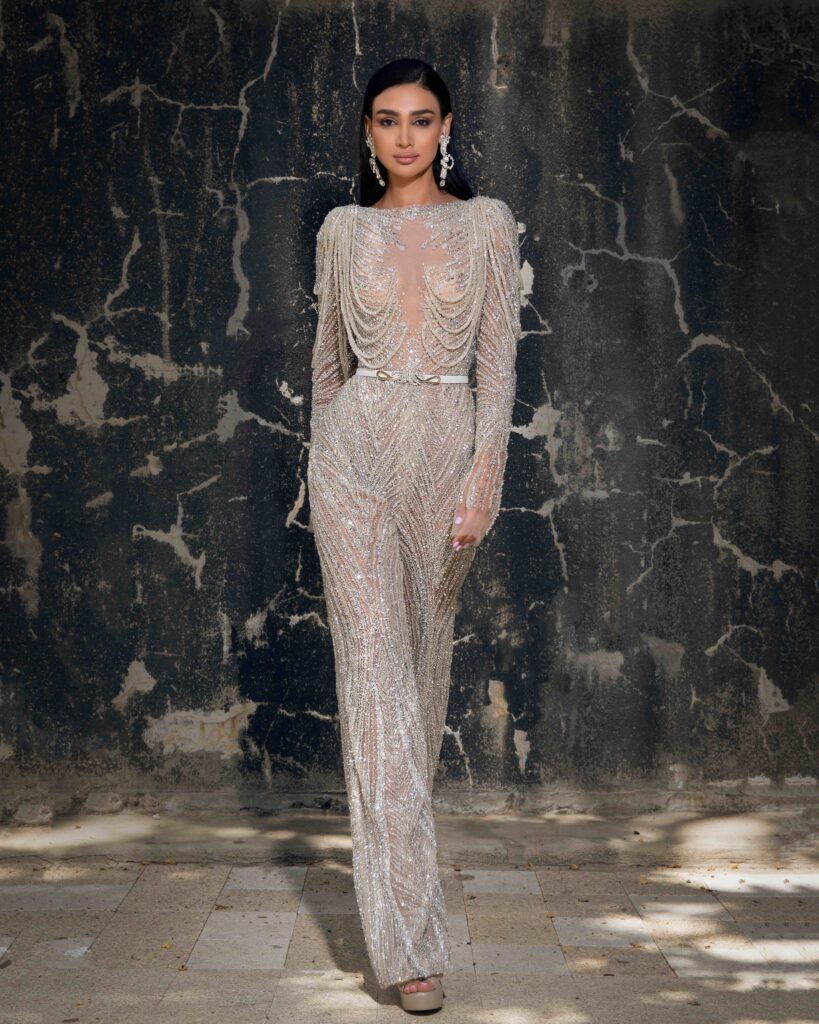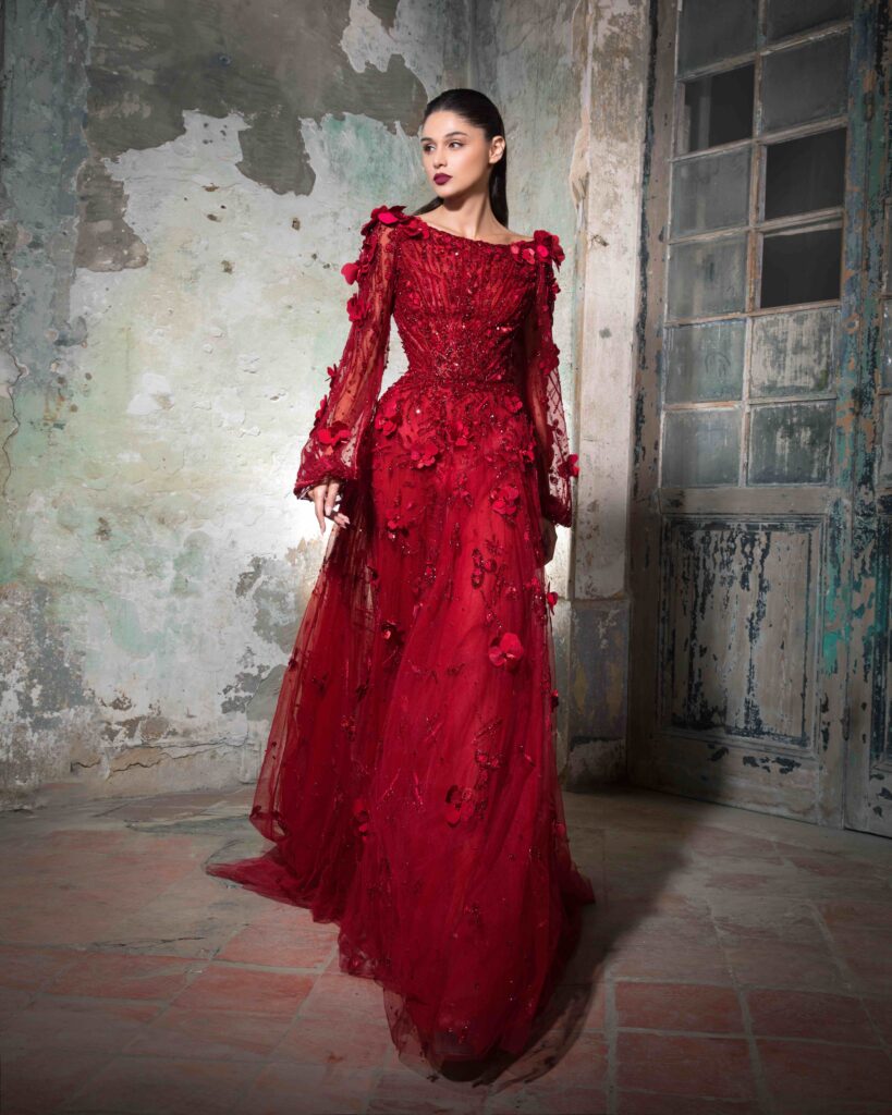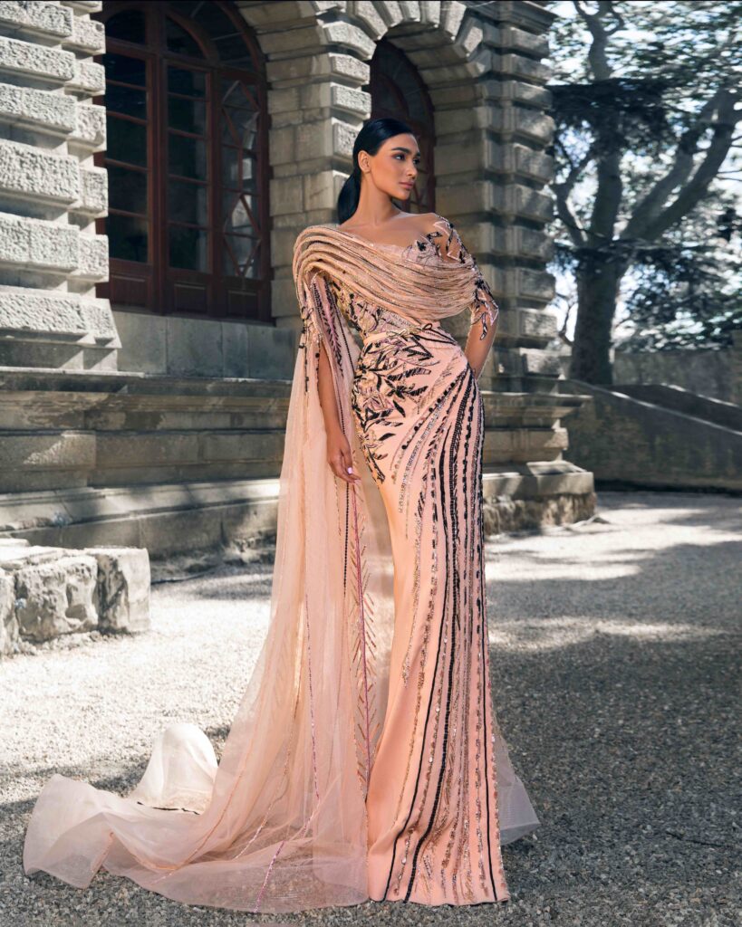 Chaque silhouette semble exhumée d’un coffre royal : velours grenat incrusté de constellations cristallines, mousseline rosée frôlée par des broderies florales, tulle fumé rehaussé de broches métalliques sculptées comme des reliques. Les tailles se cintrent, les bustiers s’évasent en traînes liquides, tandis que des épaules dénudées ou des fentes audacieuses injectent une sensualité contenue – le choc doux entre l’artisanat d’antan et l’audace contemporaine .