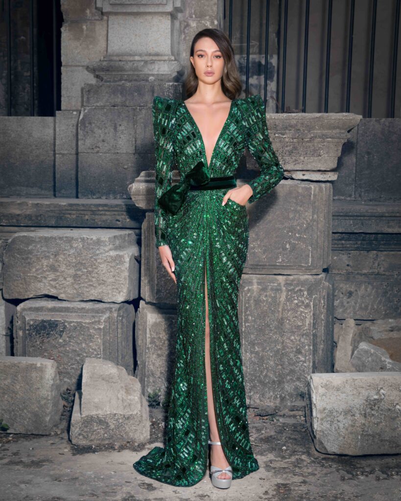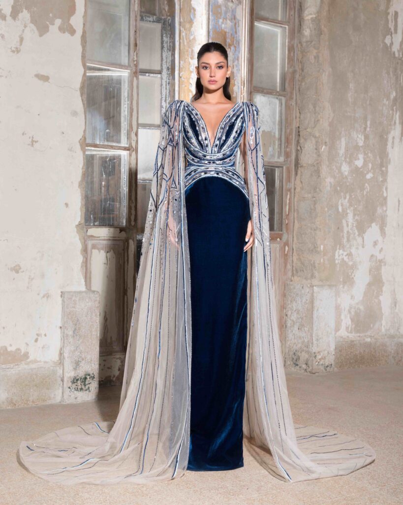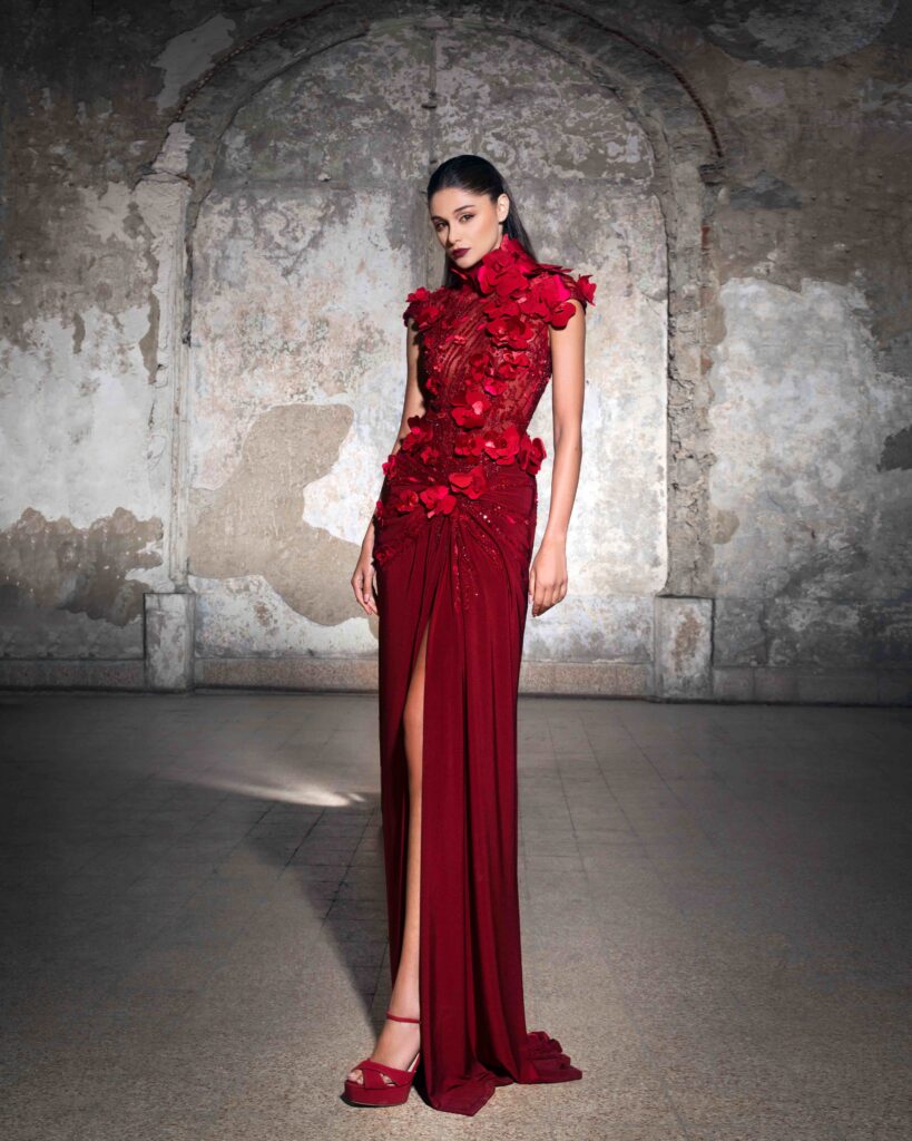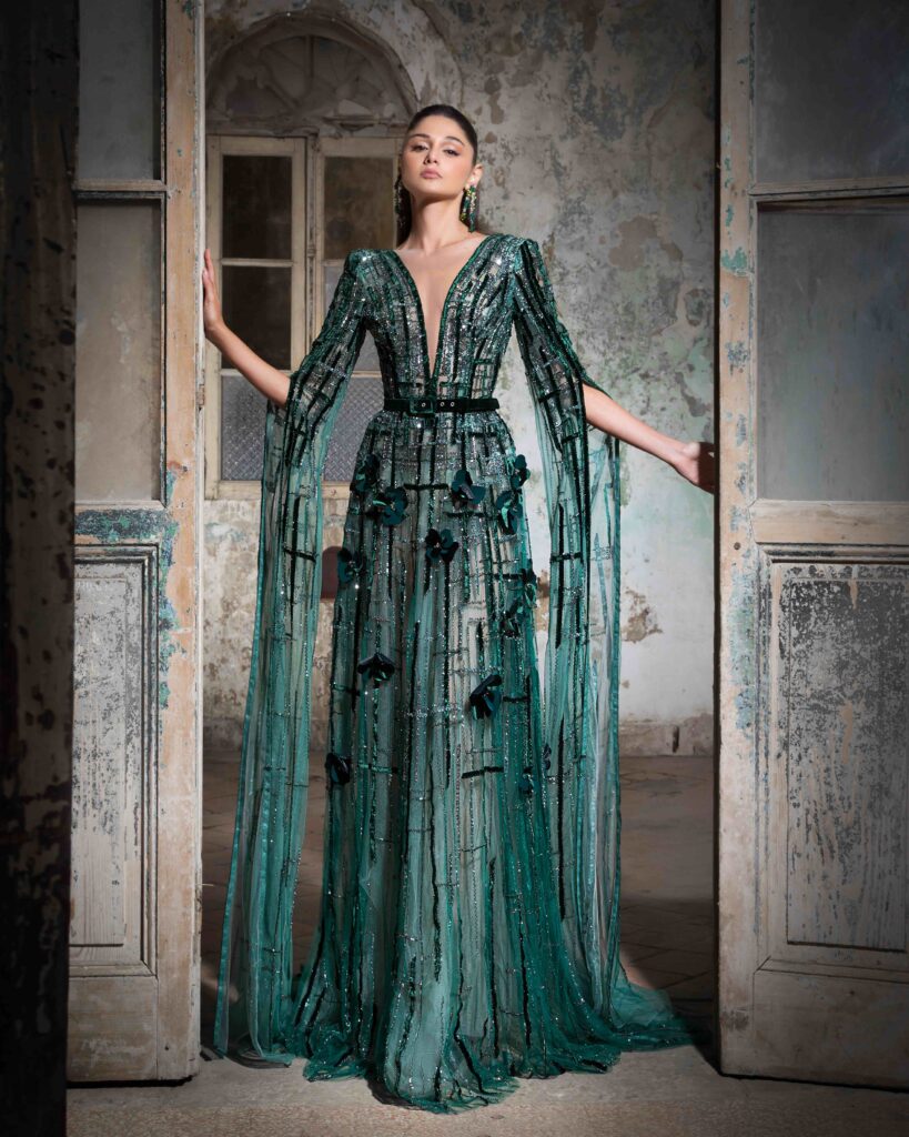 Bourgogne « vin de roi », vert impérial, rose cendré, marine encre, or et argent fusionnent pour signer un romantisme baroque. Nakad orchestre des tensions : le poids du velours rencontre la légèreté diaphane du tulle, la brillance métallique dialogue avec la matité du satin. Les motifs floraux, tantôt brodés, tantôt sculptés, offrent un contrepoint organique aux coupes architecturales .