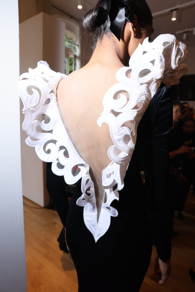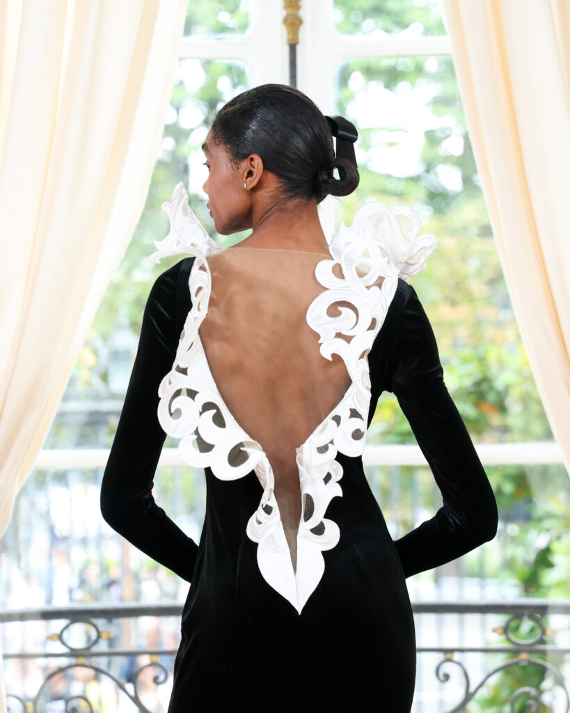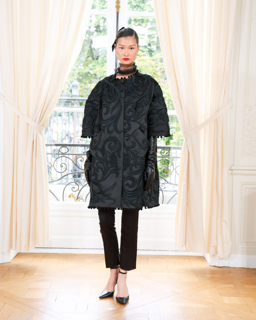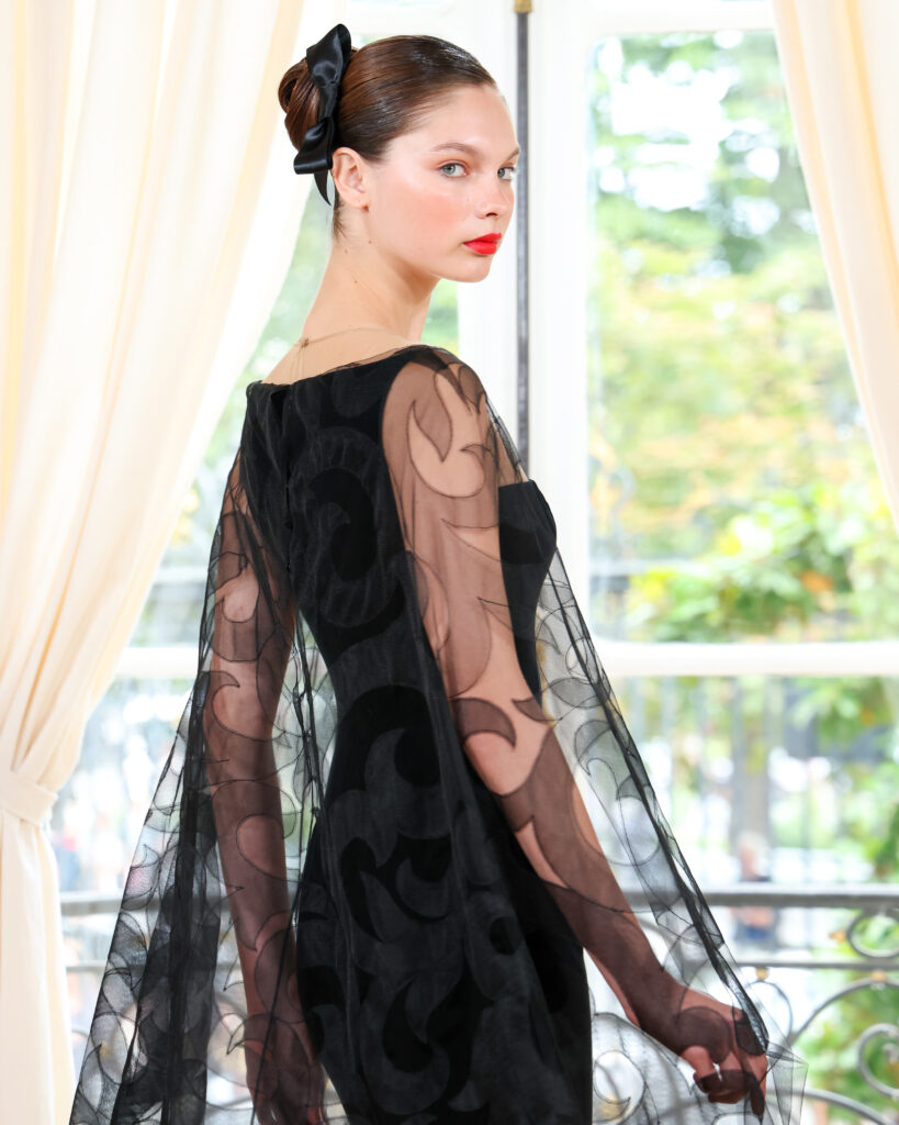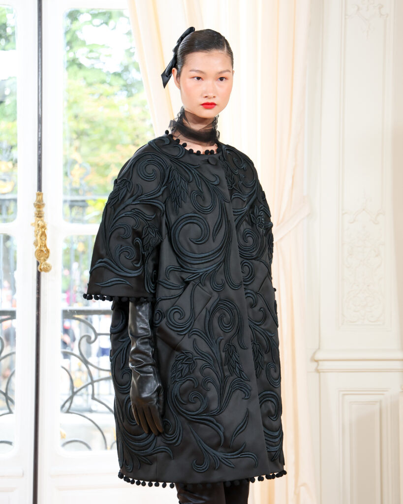 Ici, les broderies ecclésiastiques flirtent avec les fresques de plafonds baroques, les portes de château deviennent des corsets, et les ornements dorés se muent en bas-reliefs couture. Chaque silhouette évoque une héroïne mythologique qui, loin d’avoir à séduire ou convaincre, incarne une assurance tranquille. Dans la palette monochrome signature — noir et blanc d’un classicisme vibrant —, tailleurs de laine, robes de tulle brodé, velours sculptural et satin architectural se répondent dans un ballet de textures et de lignes.