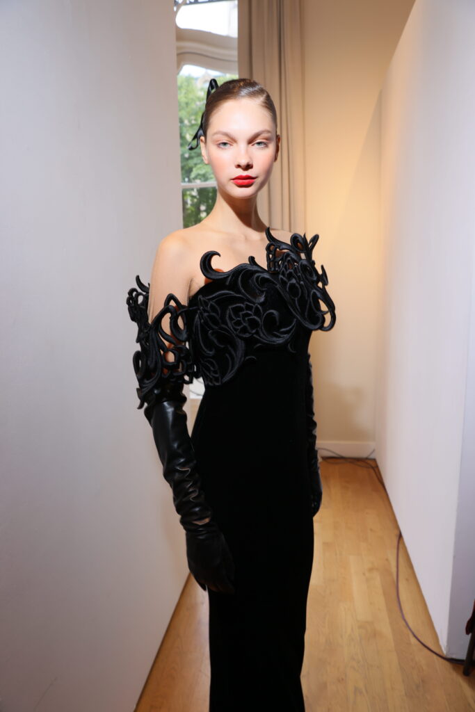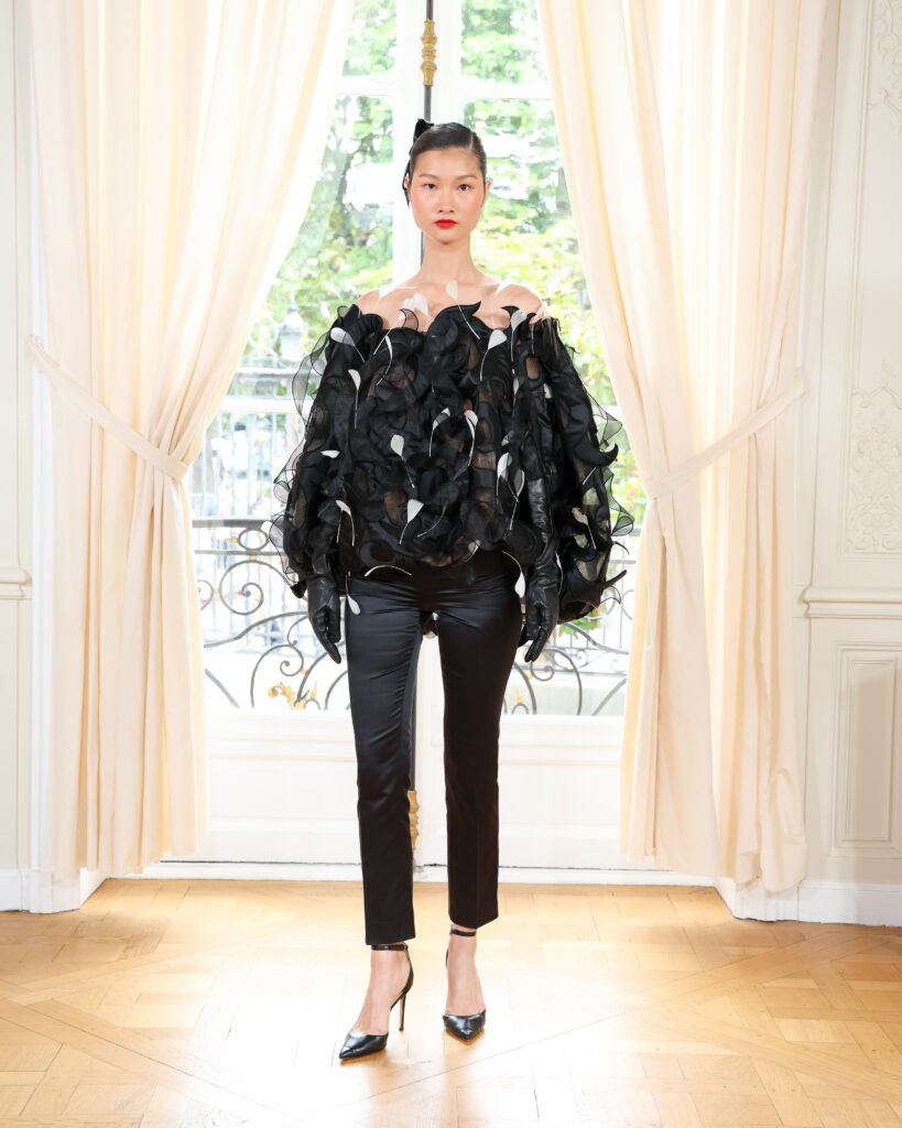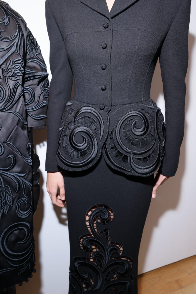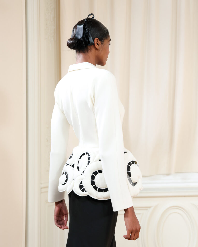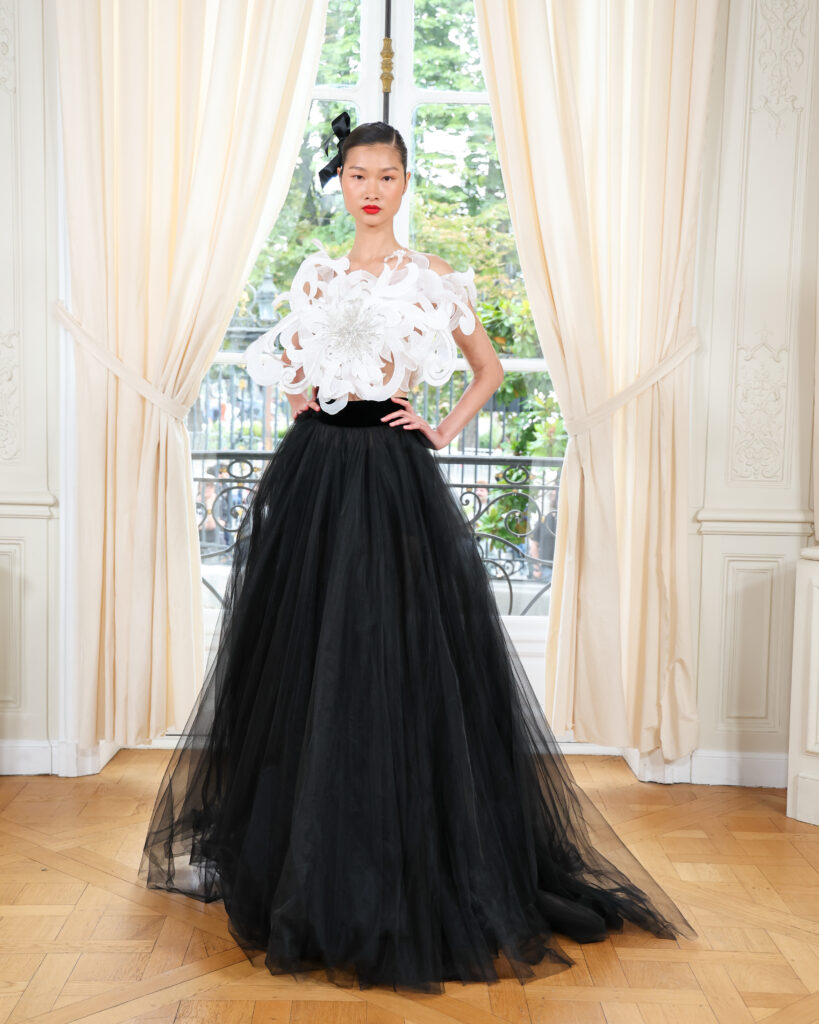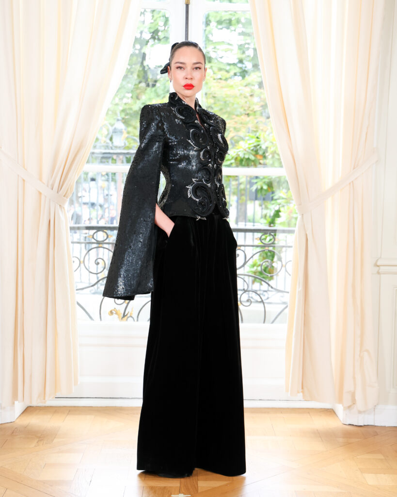 Ici, les broderies ecclésiastiques flirtent avec les fresques de plafonds baroques, les portes de château deviennent des corsets, et les ornements dorés se muent en bas-reliefs couture. Chaque silhouette évoque une héroïne mythologique qui, loin d’avoir à séduire ou convaincre, incarne une assurance tranquille. Dans la palette monochrome signature — noir et blanc d’un classicisme vibrant —, tailleurs de laine, robes de tulle brodé, velours sculptural et satin architectural se répondent dans un ballet de textures et de lignes.