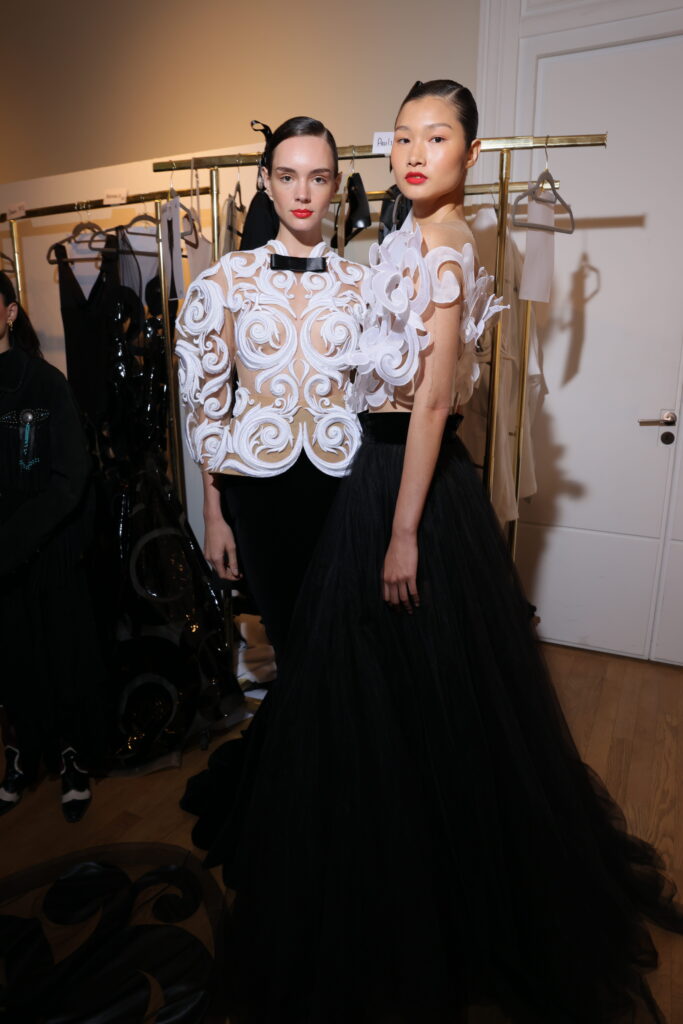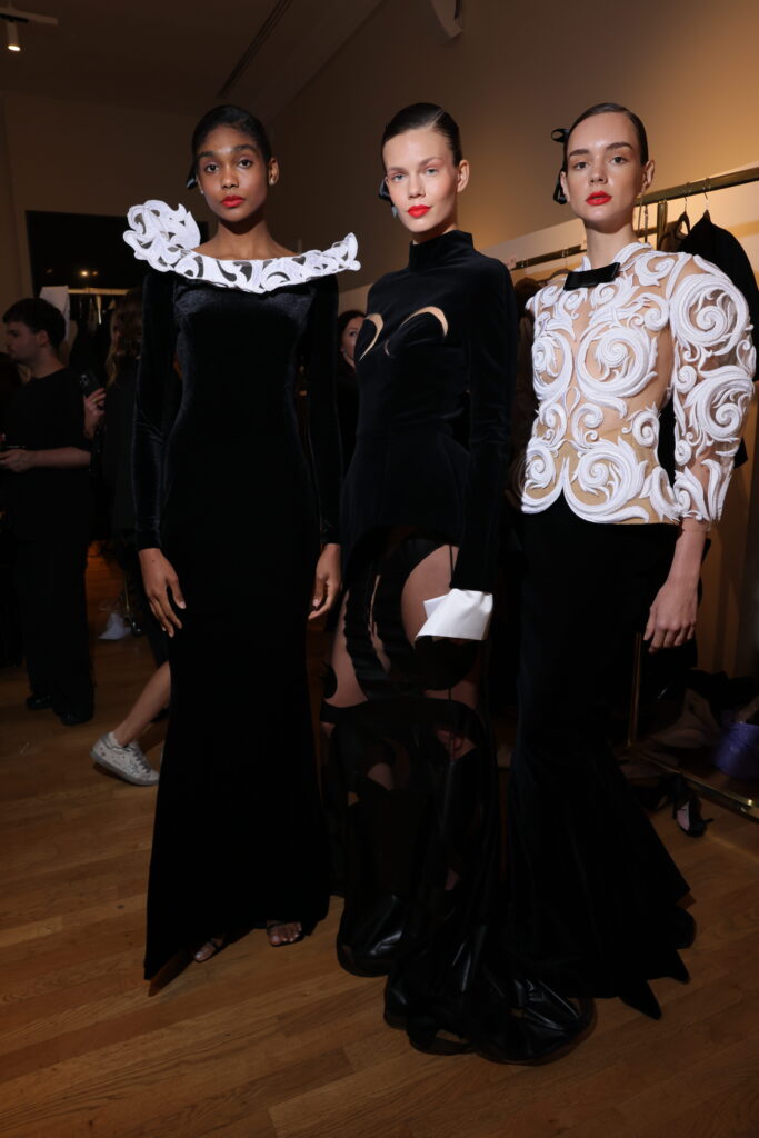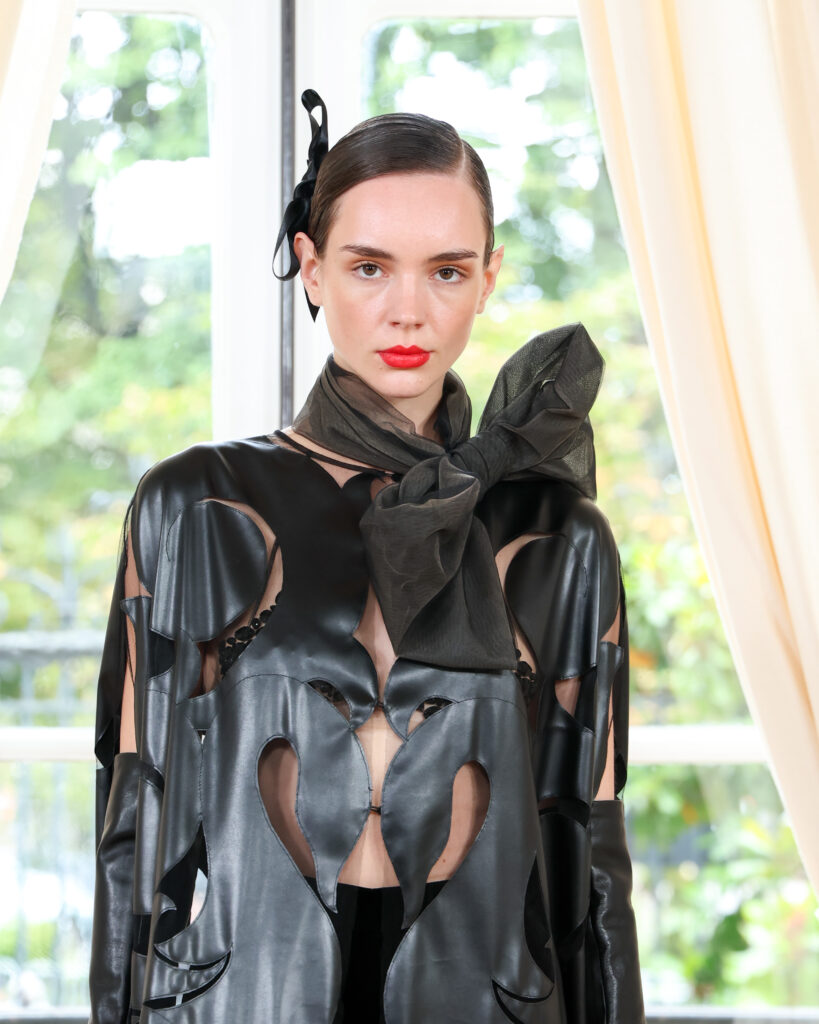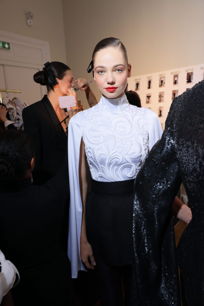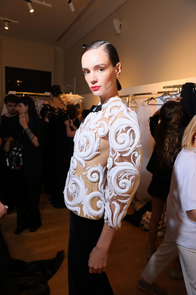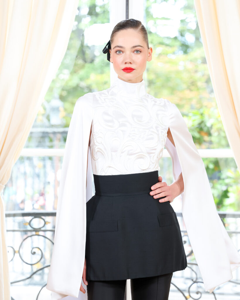 Ici, les broderies ecclésiastiques flirtent avec les fresques de plafonds baroques, les portes de château deviennent des corsets, et les ornements dorés se muent en bas-reliefs couture. Chaque silhouette évoque une héroïne mythologique qui, loin d’avoir à séduire ou convaincre, incarne une assurance tranquille. Dans la palette monochrome signature — noir et blanc d’un classicisme vibrant —, tailleurs de laine, robes de tulle brodé, velours sculptural et satin architectural se répondent dans un ballet de textures et de lignes.