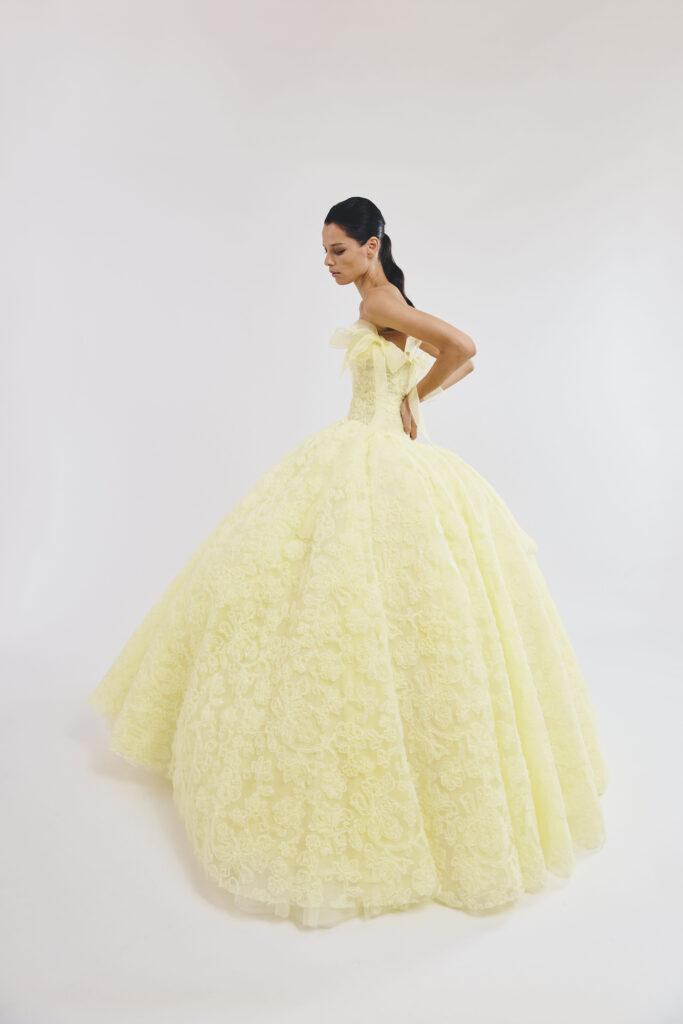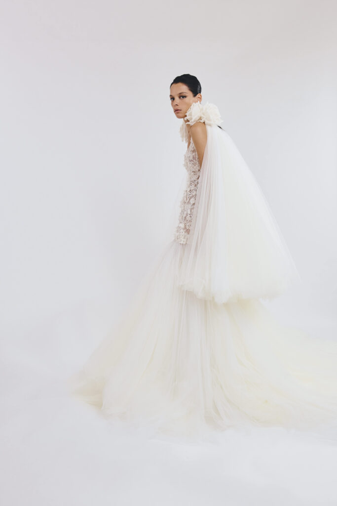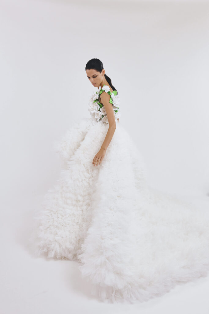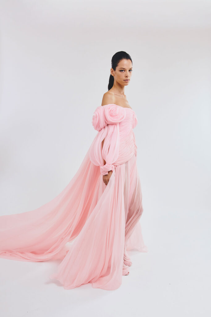 La collection s’ouvre comme un tableau vivant, convoquant l’esprit bucolique et sensuel des fêtes galantes à la Watteau ou Fragonard. Drapés de mousseline « forsythia », tulle brodé en ramage, roses en gazar de soie, volants « millefeuille » ou capes à la Polonaise : chaque pièce exhale la légèreté orchestrée propre à l’atelier Valli, où le tissu n’est jamais imposé mais sculpté avec douceur, comme par le vent.