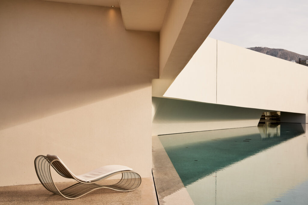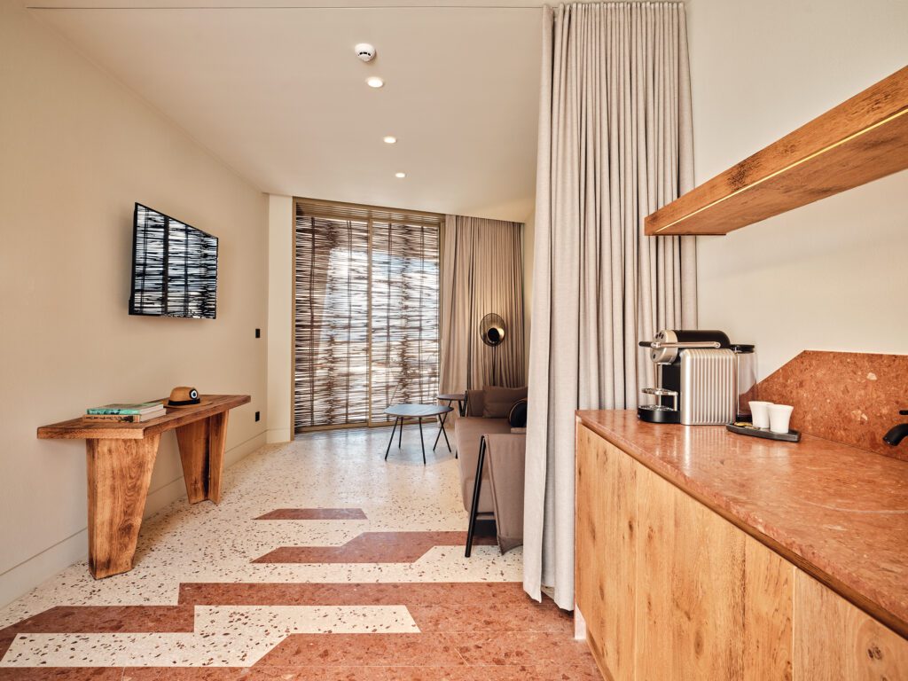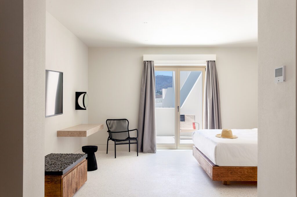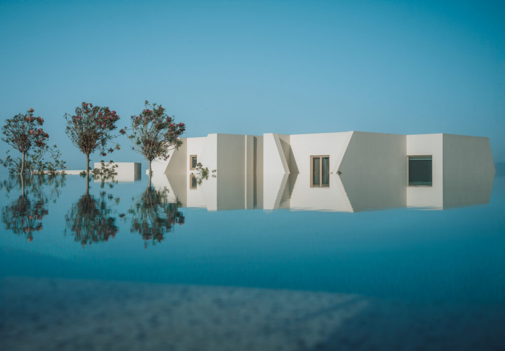 Pensé par un collectif de designers internationaux et porté par la vision du collectionneur Dakis Joannou, le lieu conjugue lignes épurées, matériaux bruts et élégance atemporelle. Pierre volcanique, bois naturel, marbre — l’épure devient art de vivre. Mais ici, l’art ne se limite pas au décor : il habite les murs, se glisse dans chaque espace, dialoguant avec les hôtes au fil des saisons grâce à des installations et œuvres contemporaines sélectionnées comme autant d’actes curatoriaux.