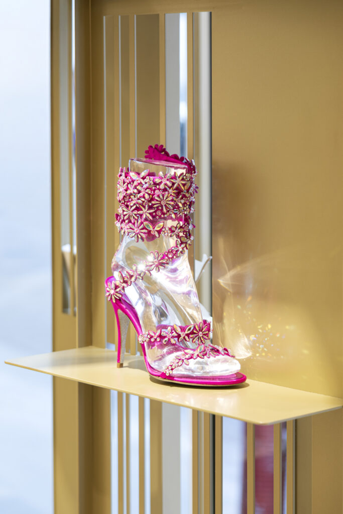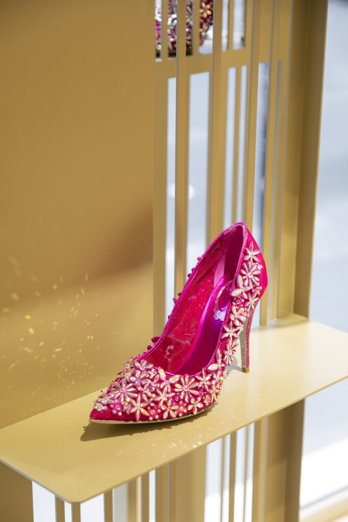 Le fuchsia, teinte unique et signature chromatique de cette collection, envahit l’ensemble des modèles avec une audace théâtrale. Il teinte aussi les créations disponibles uniquement sur commande : l’escarpin Jungle, le slingback Jungle, et les sandales Jungle SuperCleo, toutes parées de satin recouvert de tulle et enrichies de cristaux (jusqu’à 150 sur certaines paires), créant un vocabulaire visuel vibrant, presque mythologique.