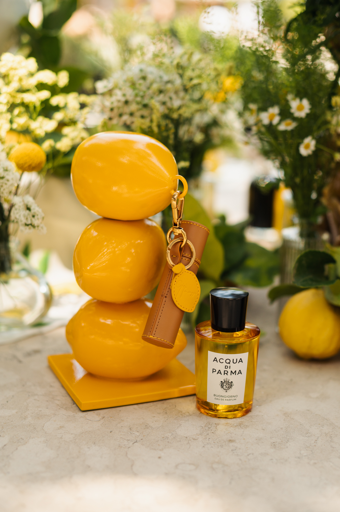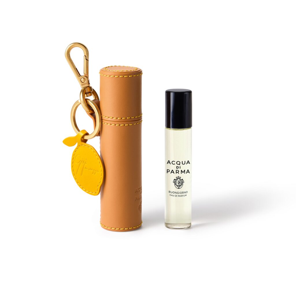 Véritable « clé universelle », le Passepartout – taillé dans un veau brun souple, cousu et poli à la main – garde près de soi une fiole de 12 ml tout en se fixant à un sac ou à un trousseau grâce à son fermoir palladié. Pour cette capsule, un citron en cuir embossé, signature d’Acqua di Parma, se pare de la mention « Gigi in Viaggio », clin d’œil à l’esprit globe-trotter de la table la plus festive du Golfe de Saint-Tropez. L’accessoire est préchargé de Buongiorno Eau de Parfum : une brassée de petit-grain et de basilic co-distillés, accord vibrant qui célèbre « l’exaltation des nouveaux départs dans les collines toscanes ».