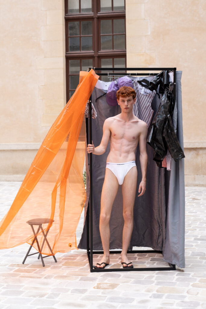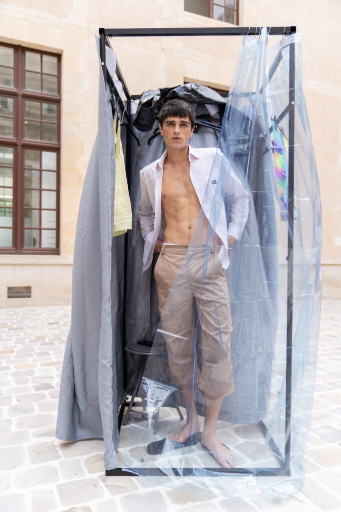 Plutôt qu’un défilé classique, les créateurs ont imaginé une performance de 2h30, où 10 mannequins évoluent en boucle, changeant de vêtements, de postures et d’aura, dans des cabines semi-transparentes visibles par le public. Le regard devient partie intégrante de la pièce : le spectateur est observateur, mais aussi acteur du regard qu’il pose.
