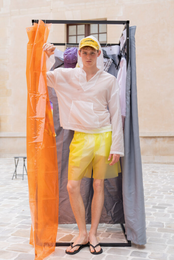 La collection oscille entre workwear détourné et fantasmes queer, entre rayures de banquier et paillettes manga, entre denim jaune lavé main et bleus californiens pastel. Les silhouettes parlent d’hybridité, d’identité en flux : Workwear by 9, fantasy by 9:30.