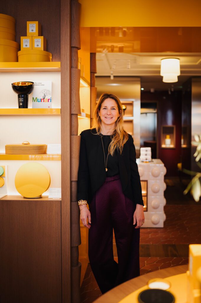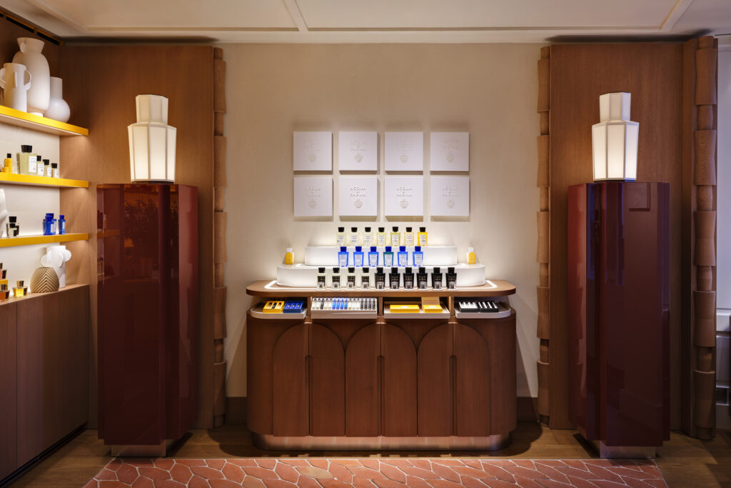 Une table centrale, ornée de demi-citrons sculptés à la main, intègre un lavabo d’essai pour expérimenter la texture et les notes des produits. Chaque meuble, des présentoirs en cuir jaune aux pieds arqués jusqu’aux stèles transformées en lampes parchemin, évoque la générosité formelle et la précision italienne.