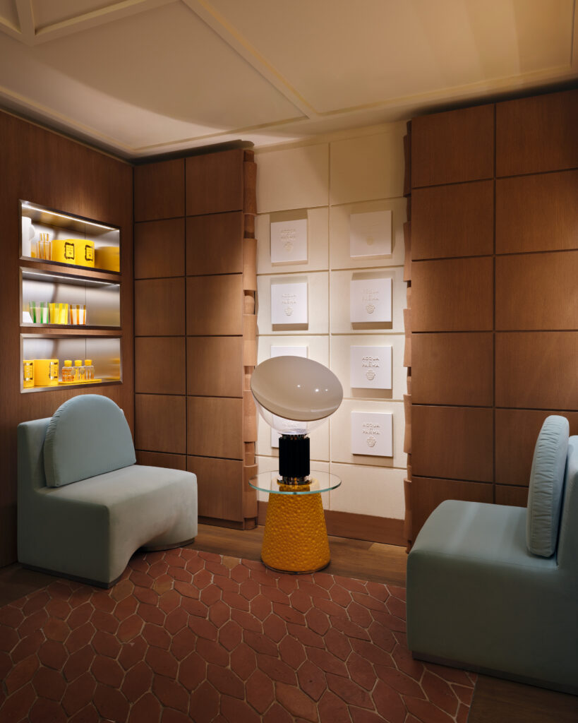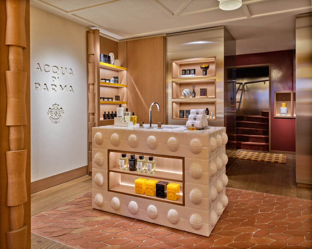Les arches arrondies, signature visuelle d’Acqua di Parma, s’hybrident ici aux codes haussmanniens : carreaux en terre cuite faits main, bois sculpté en colonnes flacon, murs en marmorino gravé dans un style hommage à Jean-Michel Frank. Le tout baigne dans un jaune laqué intense, revisité pour Paris avec des accents crème et beiges, pour une luminosité solaire raffinée.
