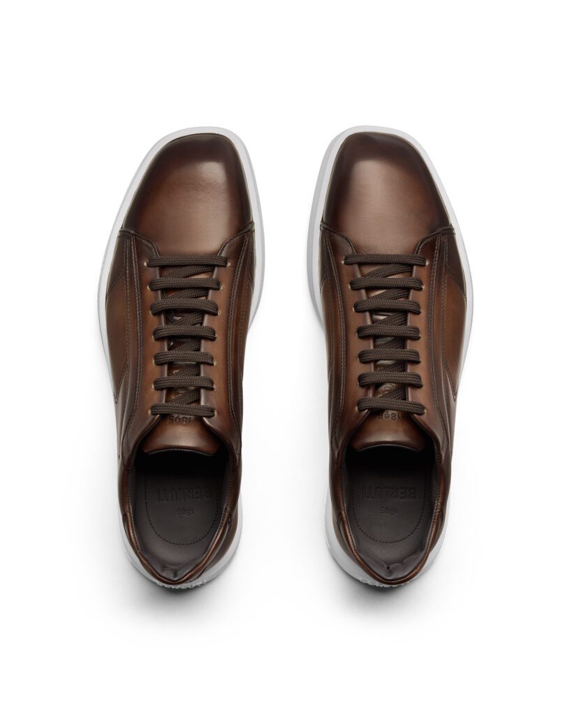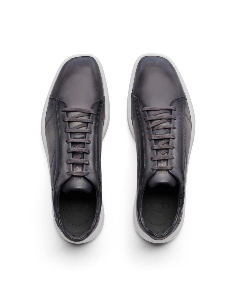 Les connaisseurs s’en souviennent : Alessandro Sartori avait bousculé les puristes en glissant une première sneaker dans le défilé printemps-été 2015 ; la critique soulignait déjà le mariage inédit entre patine artisanale et confort sporty. Quatre ans plus tard, Kris Van Assche affinait le concept avec la première itération Stellar, injectant un souffle street au vestiaire tailleur de Berluti. L’édition 2025 pousse le curseur technologique tout en modérant les lignes : bout angulaire légèrement arrondi, couture latérale dynamisante et talon biseauté à l’absorption renforcée ; de quoi avaler les 10 000 pas réglementaires sans sourciller .