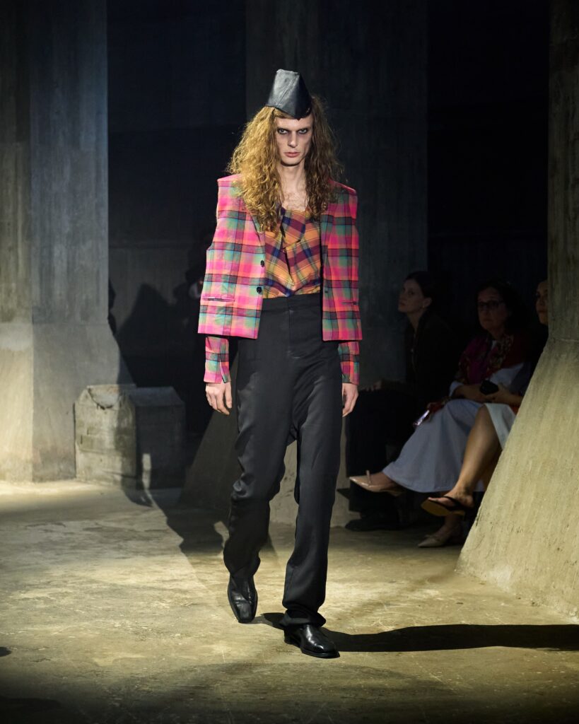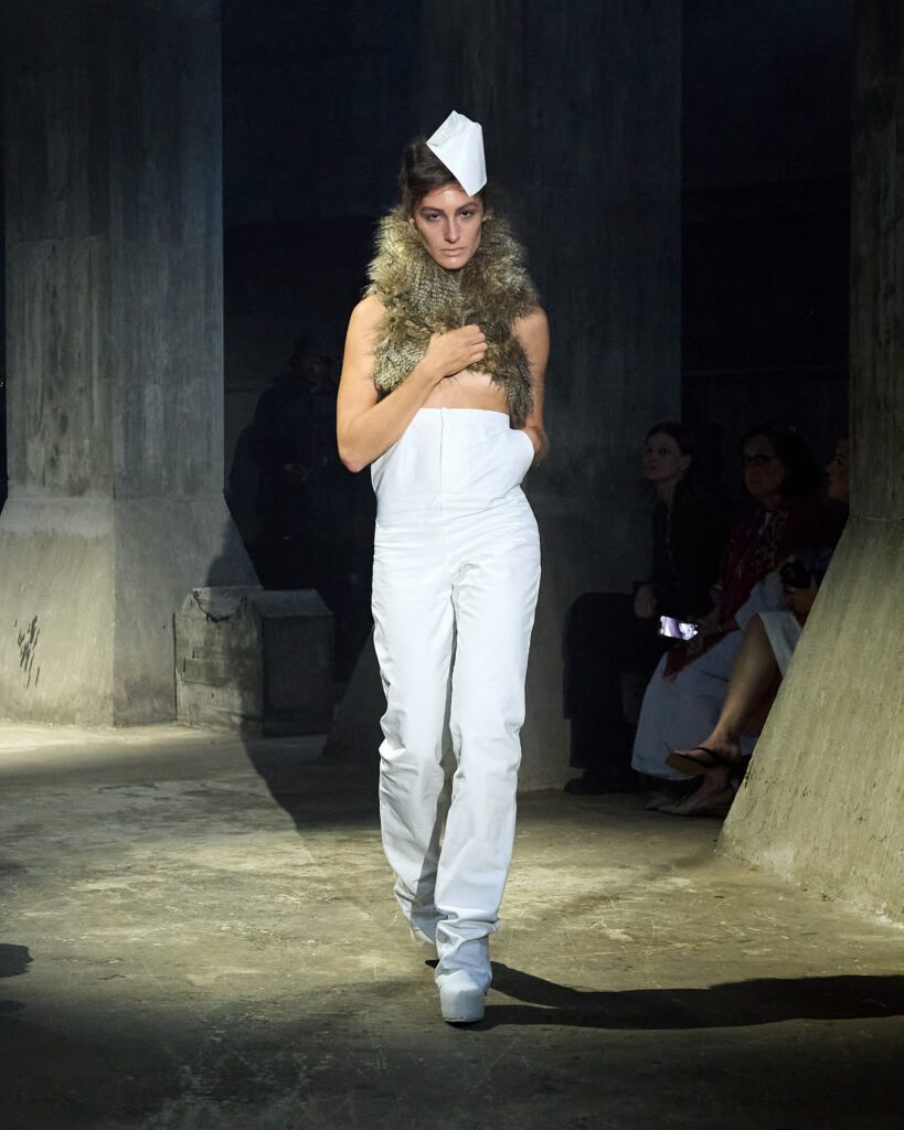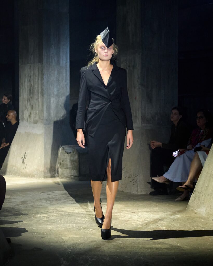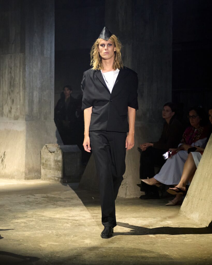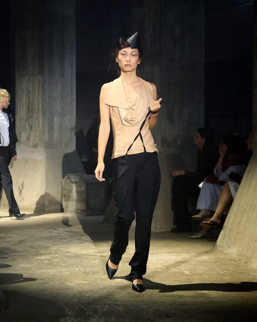 Chaque vêtement démontre une approche radicale du tailleur traditionnel : les vestes aux manches retournées créent une silhouette épurée sans coutures apparentes. Les pantalons sont exceptionnellement hauts, montant sous la poitrine, tandis que les jupes s’arrêtent juste au-dessus de l’entrejambe, les passants de ceinture se transformant en bretelles fonctionnelles. Les cols montants traduisent la rigueur clinique, et des revêtements rappelant le nitrile sont utilisés sur les jeans, accessoires et couvre-chefs, en référence aux matériaux médicaux. La collection mise sur des tissus restants et recyclés, soulignant l’engagement de la marque envers une production responsable et un travail artisanal réfléchi.