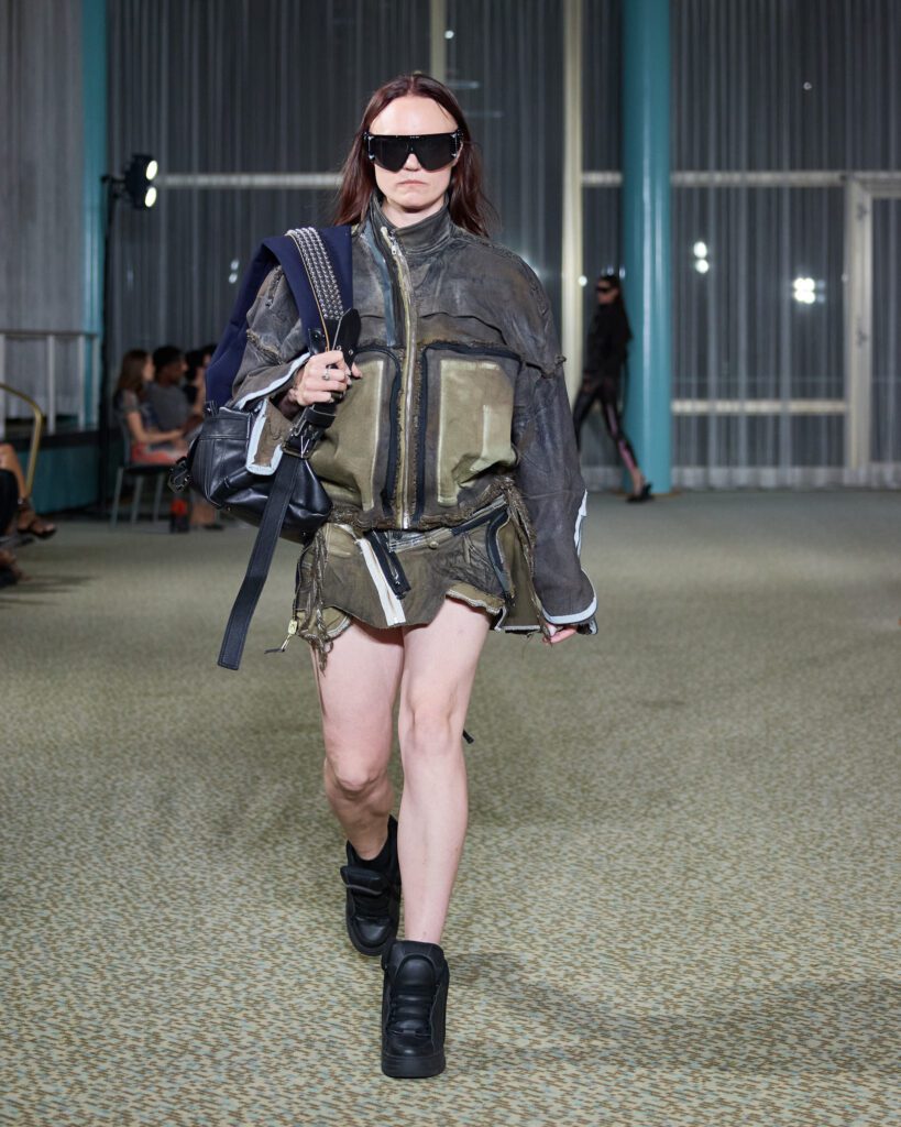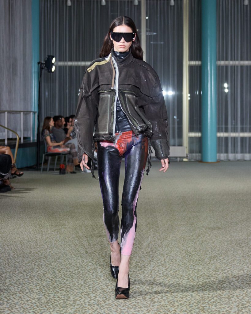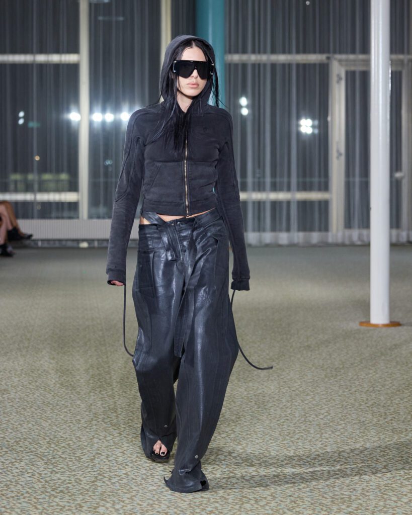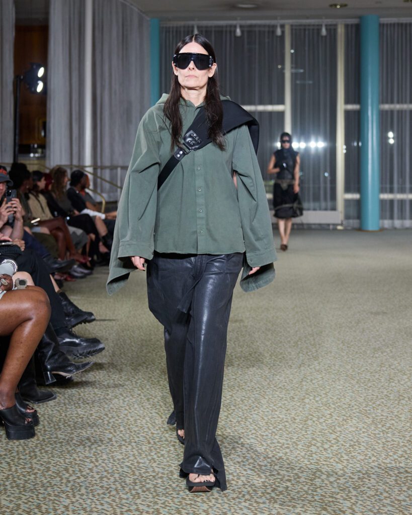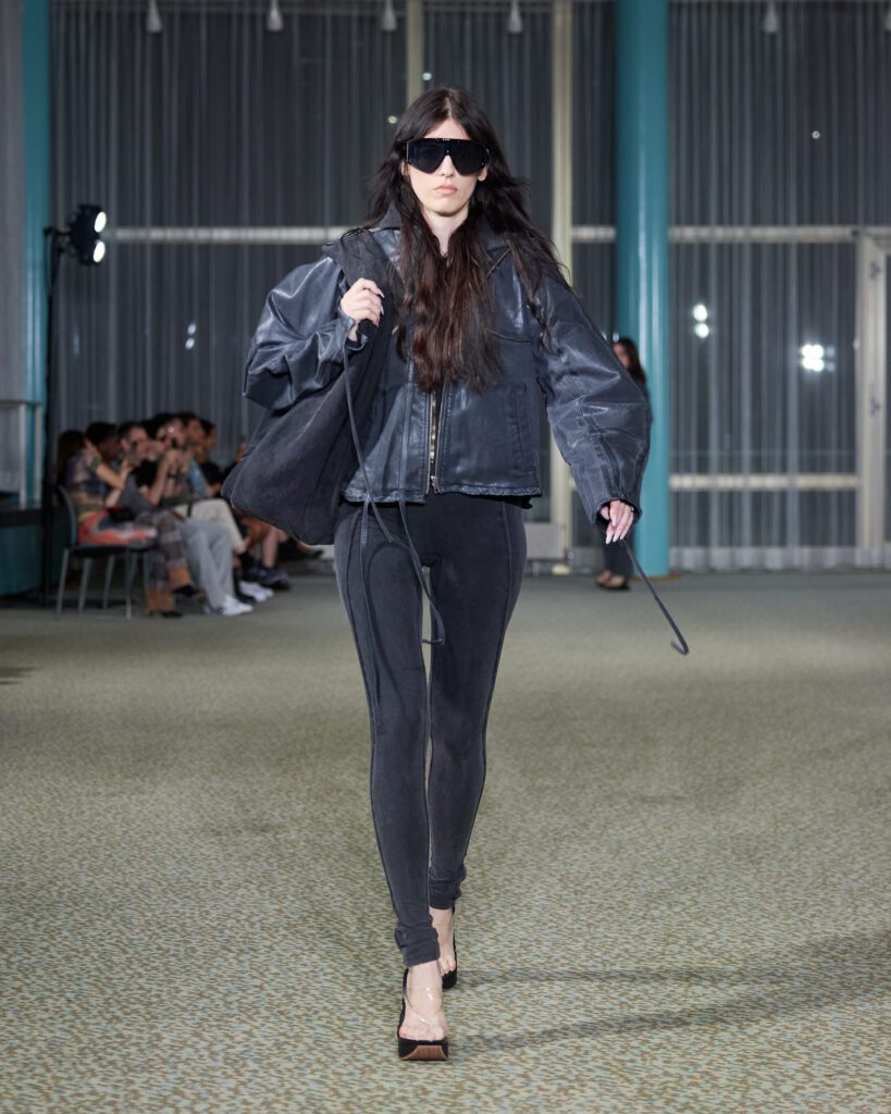 Chaque look devient un message chuchoté à l’oreille des jeunes femmes qui apprennent encore à s’aimer sans s’excuser. Olinger décline un langage textile de l’ambivalence : du cuir vieilli et des satins lustrés, des coupes franches mais flottantes, des volumes protéiformes, comme pour évoquer un corps en mouvement perpétuel, jamais captif d’une tendance.
