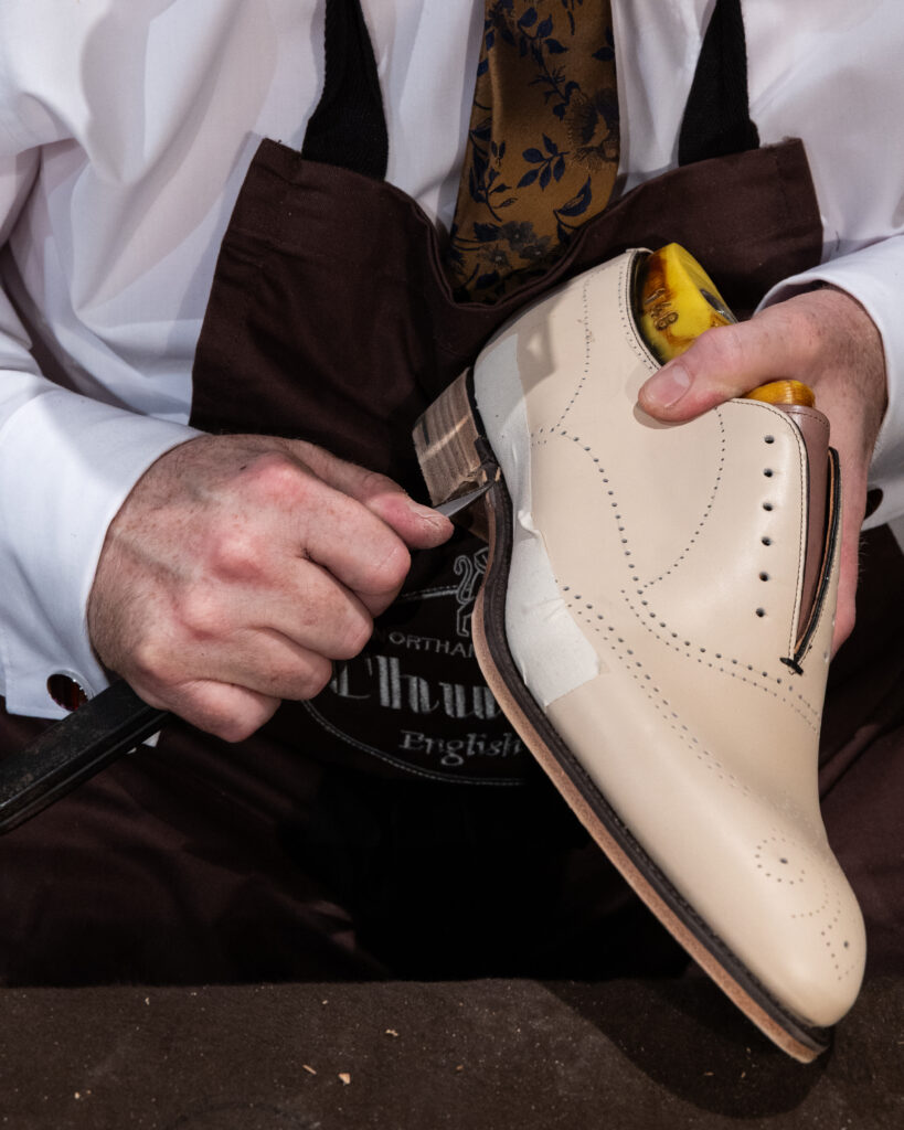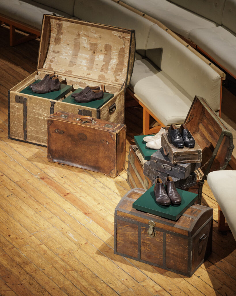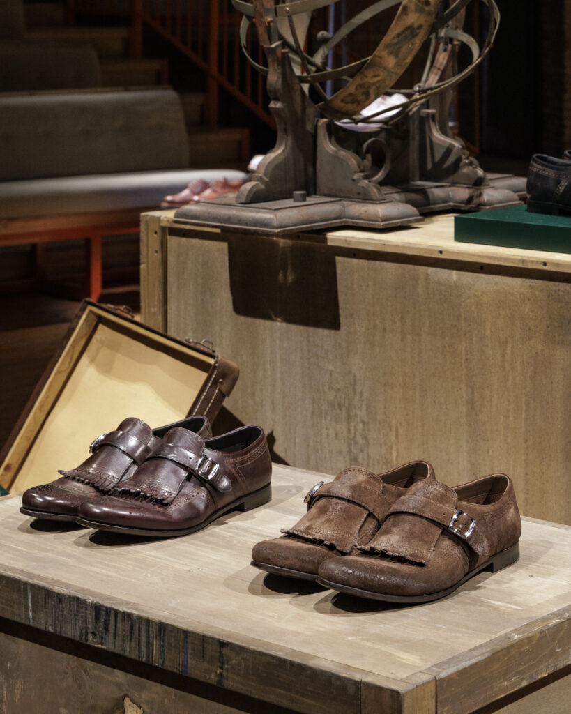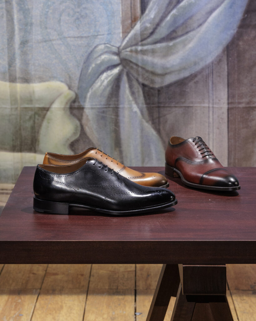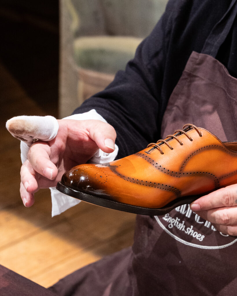 En clôture, la collection Crown rend hommage à l’artisanat britannique le plus pur. Confectionnées en cuir “crust” blanc naturel, teinté à la main en bleu profond, vert forêt et bordeaux intense, ces chaussures deviennent des objets uniques, porteurs d’une élégance durable et d’un caractère affirmé.