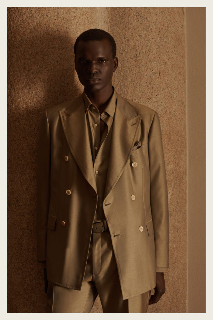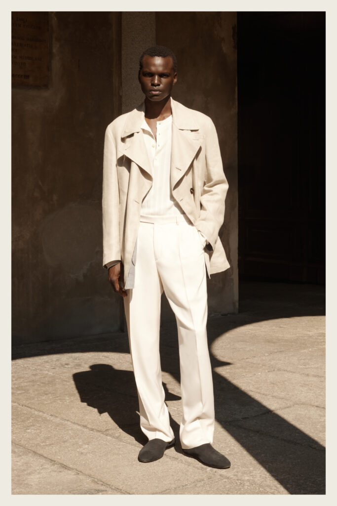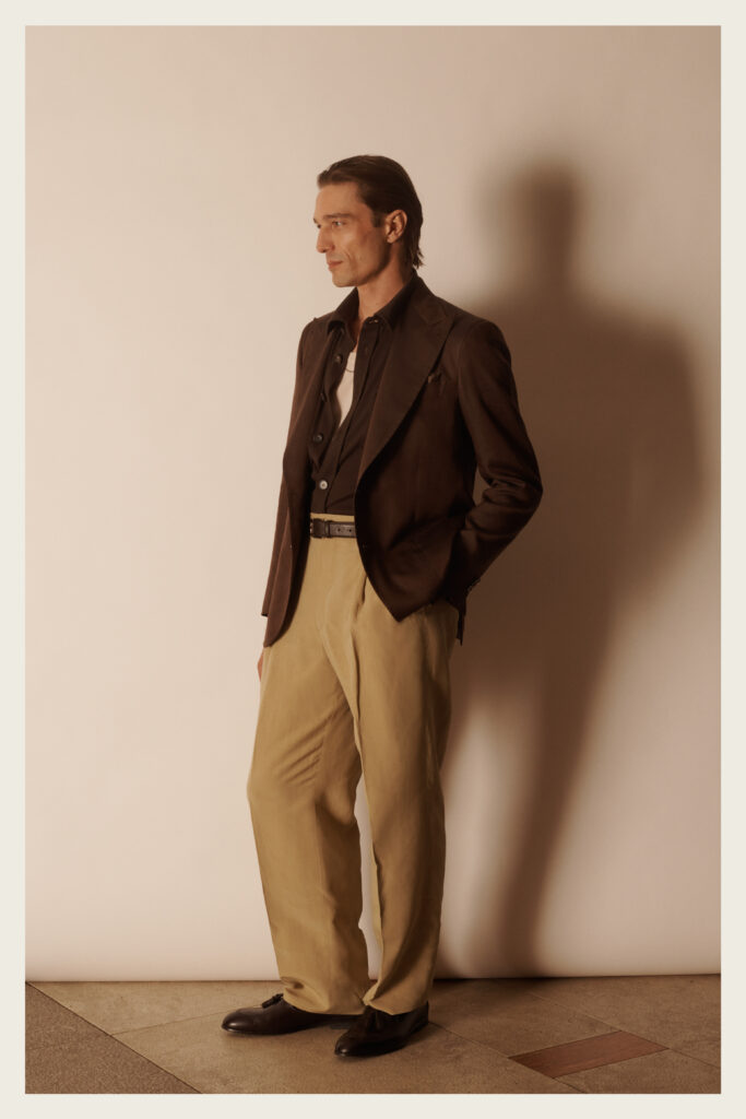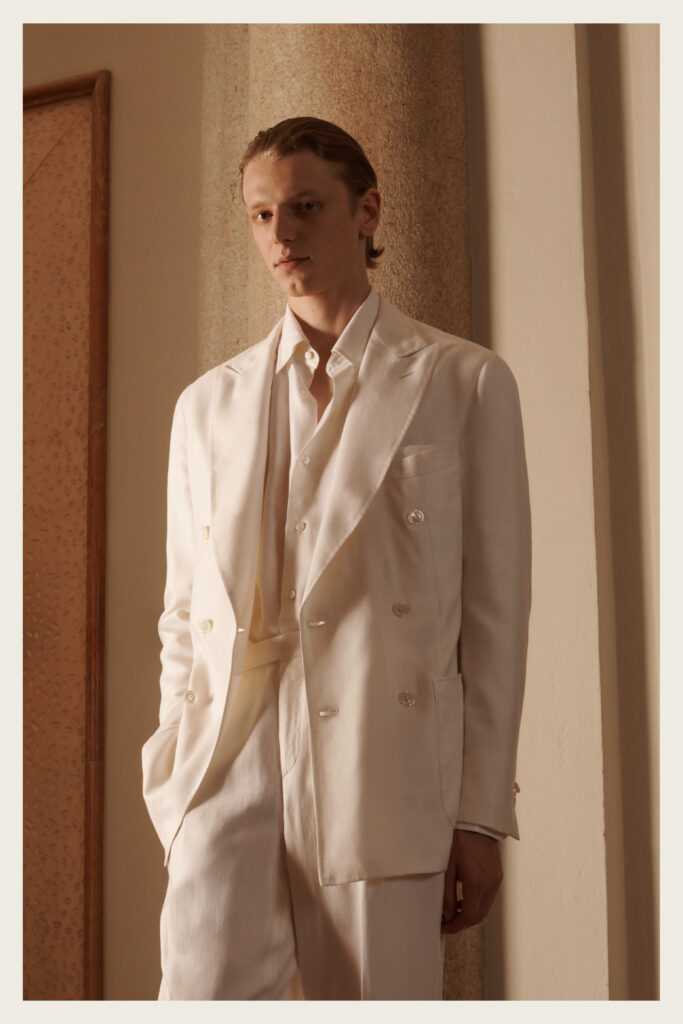Les volumes généreux, légèrement resserrés, laissent deviner les lignes du corps sous des vestes croisées et des superpositions diaphanes. Les costumes et blazers, porteurs de l’inimitable légèreté Brioni, se prêtent désormais autant aux loisirs qu’au formel. Les vestes en denim, daim ou cuir introduisent une rugosité poétique, tandis que les shorts coordonnés et les chemises doublées de motifs internes insufflent une vision plus estivale.