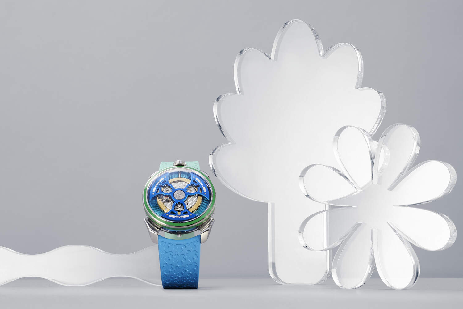 De cette rencontre naît une série poétique de trois montres en éditions limitées à 400 exemplaires chacune : Sun, Nature et Water. L’arbre, symbole récurrent de l’artiste, s’invite au cœur du rotor, redessiné en titane, plus fin et plus complexe, puis anodisé en jaune, vert ou bleu selon le modèle. Le Super-LumiNova illumine la devise d’Ilori – Grow Your Dreams – inscrite en filigrane.