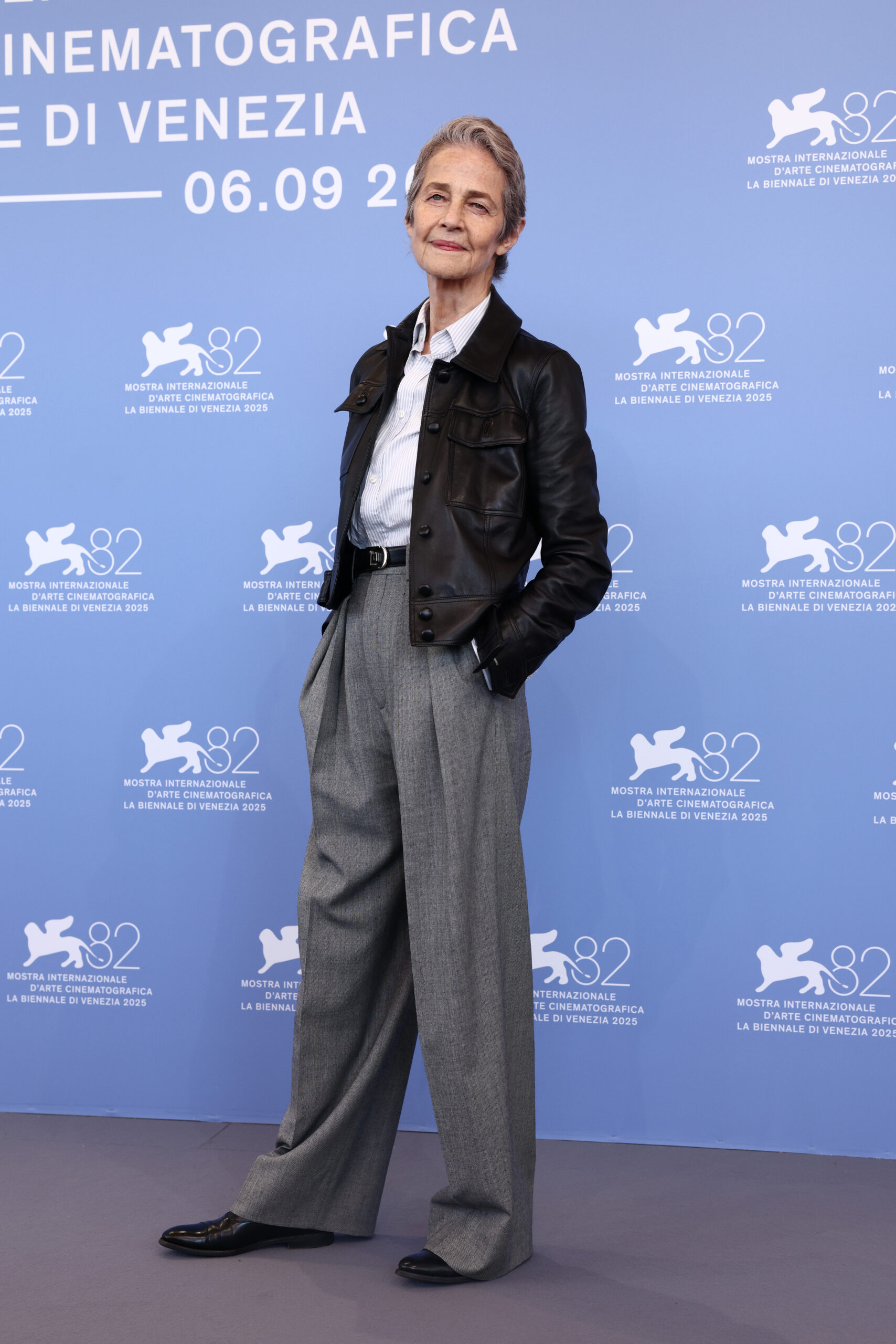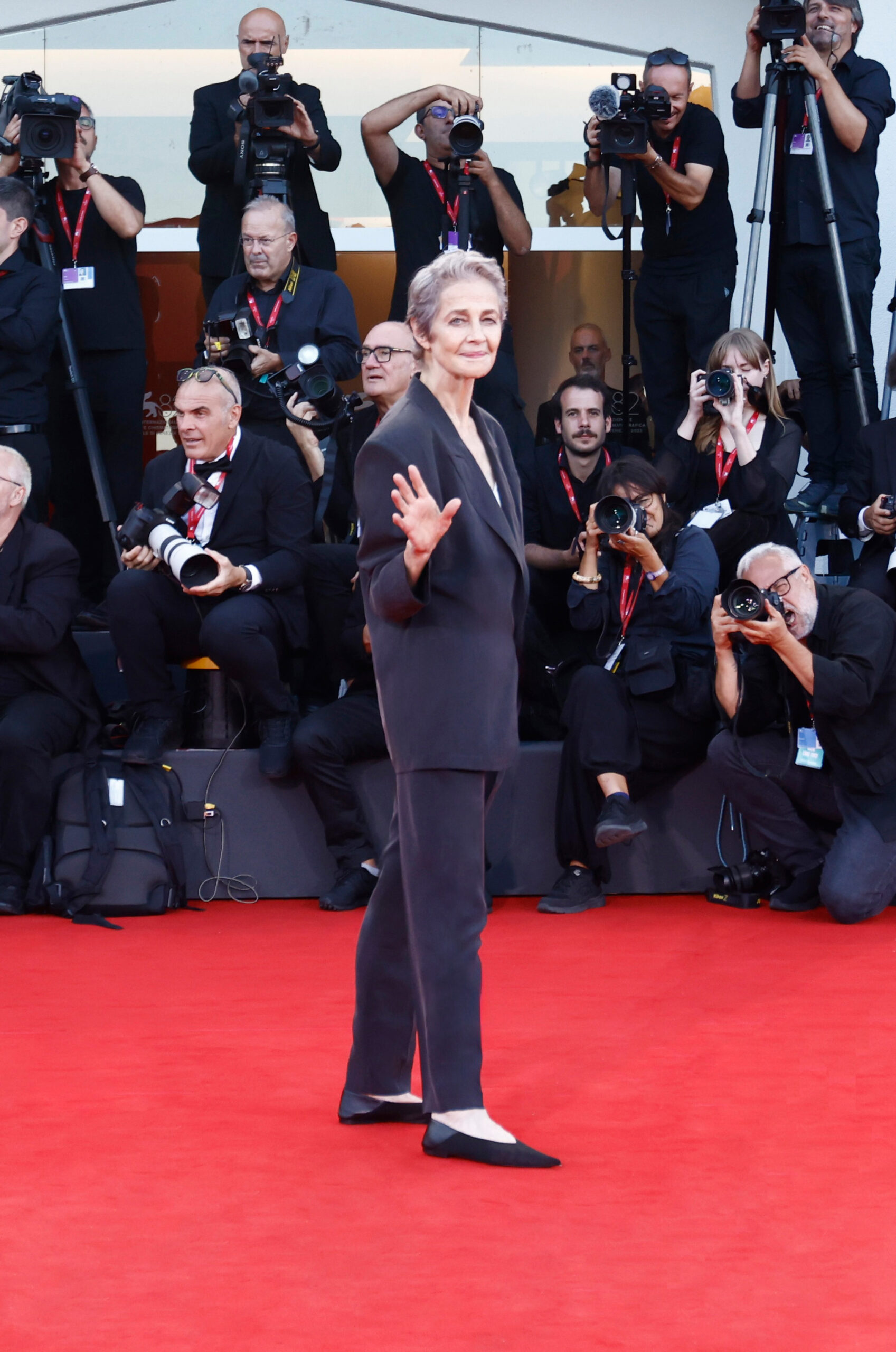 Face à lui, Charlotte Rampling confirmait sa fidélité à la maison. En journée, elle apparaissait dans une veste cropped en agneau, chemise rayée et large pantalon en laine chinée — un masculin-féminin comme elle seule sait l’incarner. Le soir, elle passait à la légèreté satinée : ensemble soie noir et slippers Nour en suède, silhouette fluide et intemporelle.