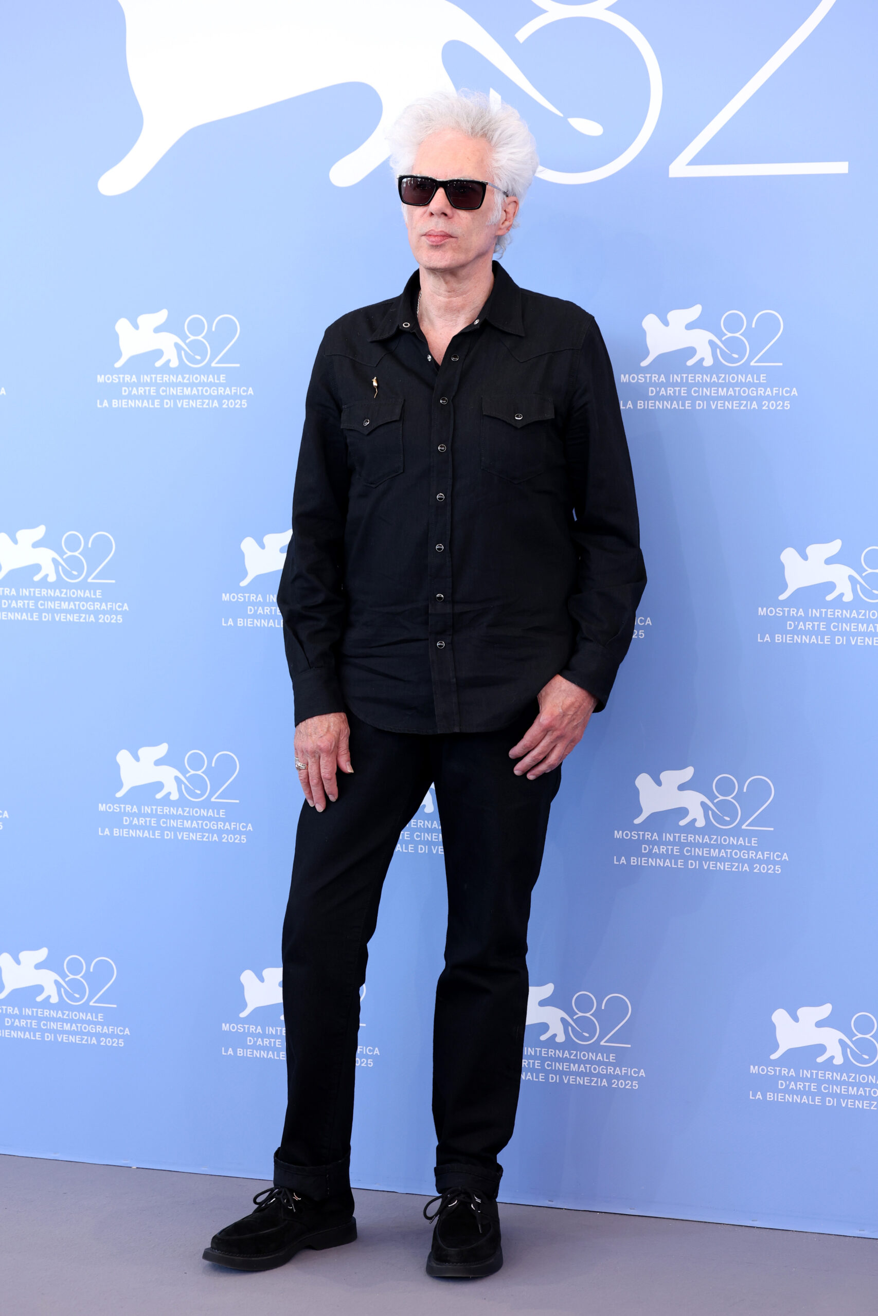 D’abord Jim Jarmusch, réalisateur célébré et invité d’honneur de la Mostra. Pour le photocall de Father Mother Sister Brother, il s’affichait en chemise western noire, denim droit et lunettes SL766, une allure effortless mais d’une précision calculée. Quelques heures plus tard, au soir de la première, il renfilait l’uniforme du dandy contemporain : tuxedo en grain de poudre, chemise popeline et derbies Teddy en suède. Vaccarello lui taille une figure de poète rock.