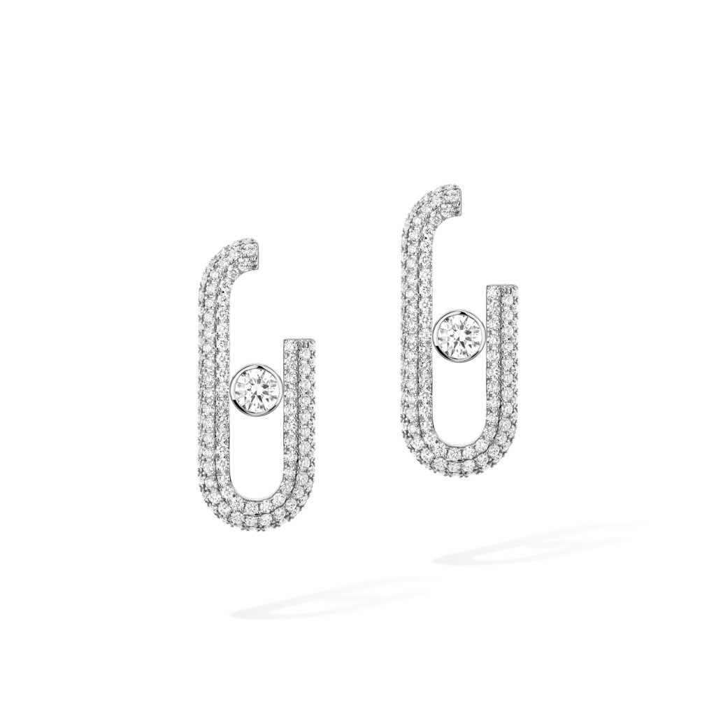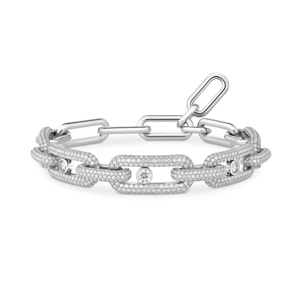 La collection Move Link XL, revisitée cette saison dans une esthétique affirmée, joue avec la puissance du maillon, élément intemporel de la joaillerie, que Messika élève au rang d’icône moderne grâce à l’intégration de ses diamants mobiles, véritables signatures de la maison. Sur Virginie Ledoyen, les boucles et le bracelet traduisent un langage graphique fort, presque architectural, sublimant l’élégance naturelle de son port de tête et la fluidité de ses gestes.