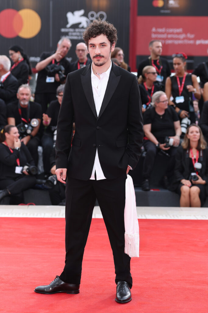 Enfin, l’acteur Will Price a incarné une élégance nocturne avec un smoking noir à revers pointus, chemise blanche et pantalon coordonné. Un foulard en soie blanche remplaçait la cravate, conférant une touche dandy contemporaine, tandis que des derbies noirs et des pièces de joaillerie Dior venaient souligner l’ensemble.