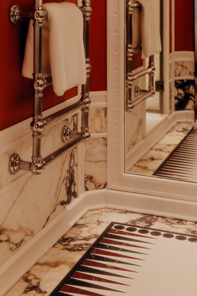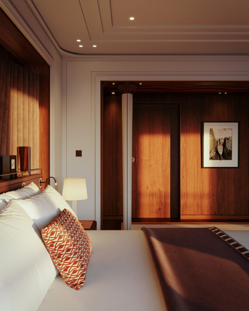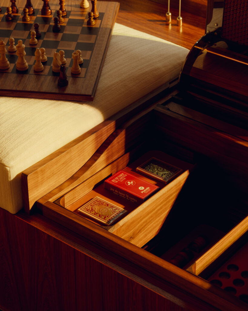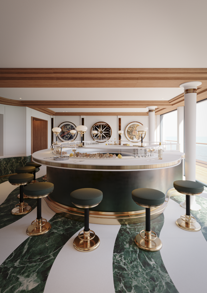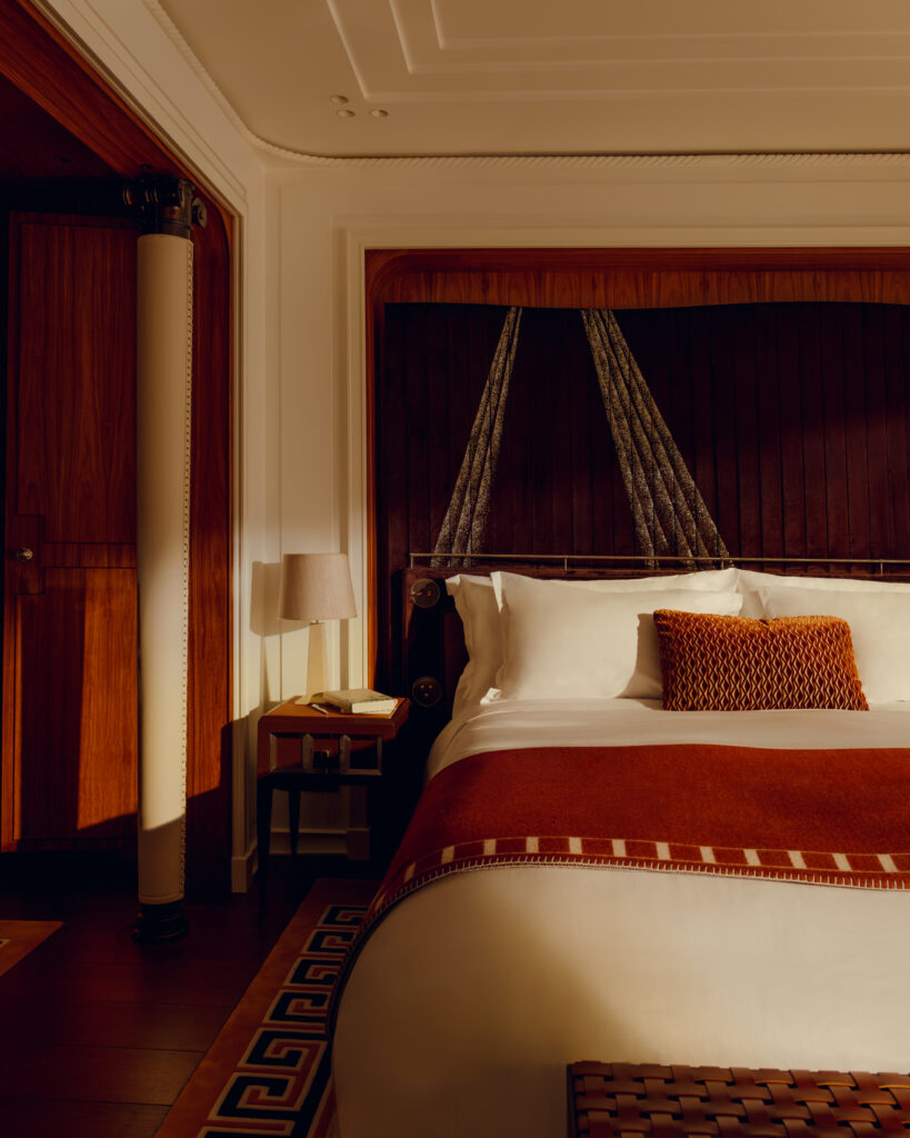 À bord, l’expérience se veut totale. L’architecte Maxime d’Angeac, directeur artistique d’Orient Express, signe un intérieur qui réinvente le luxe maritime à la française, dans l’esprit du Normandie et de l’âge d’or ferroviaire. Les 54 suites, de 45 à 230 m², affichent des volumes spectaculaires, rehaussés de grandes baies vitrées.