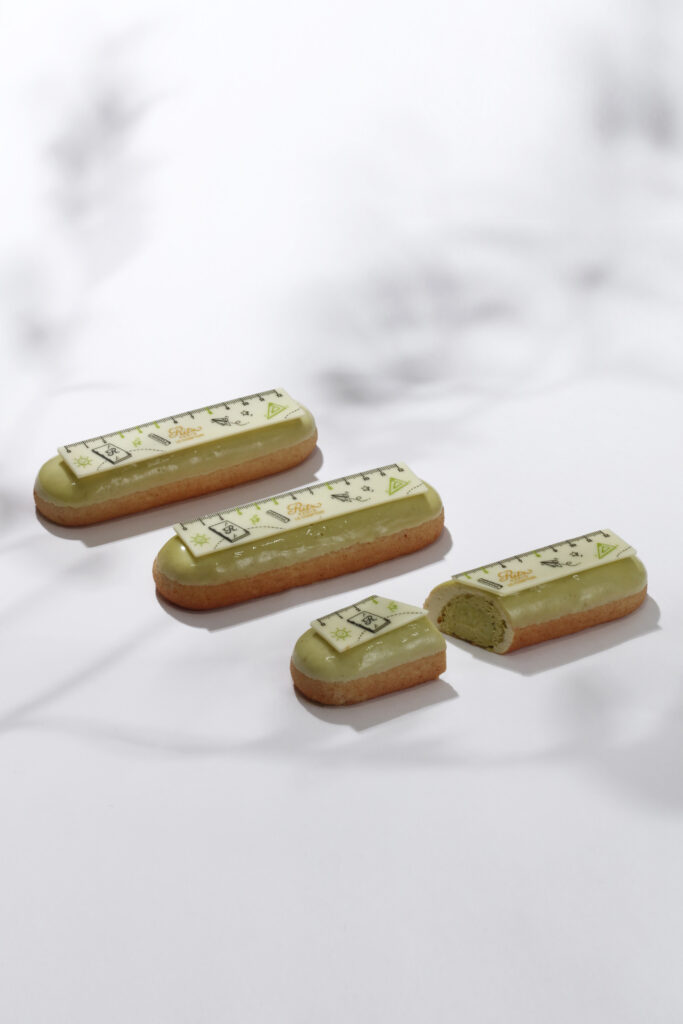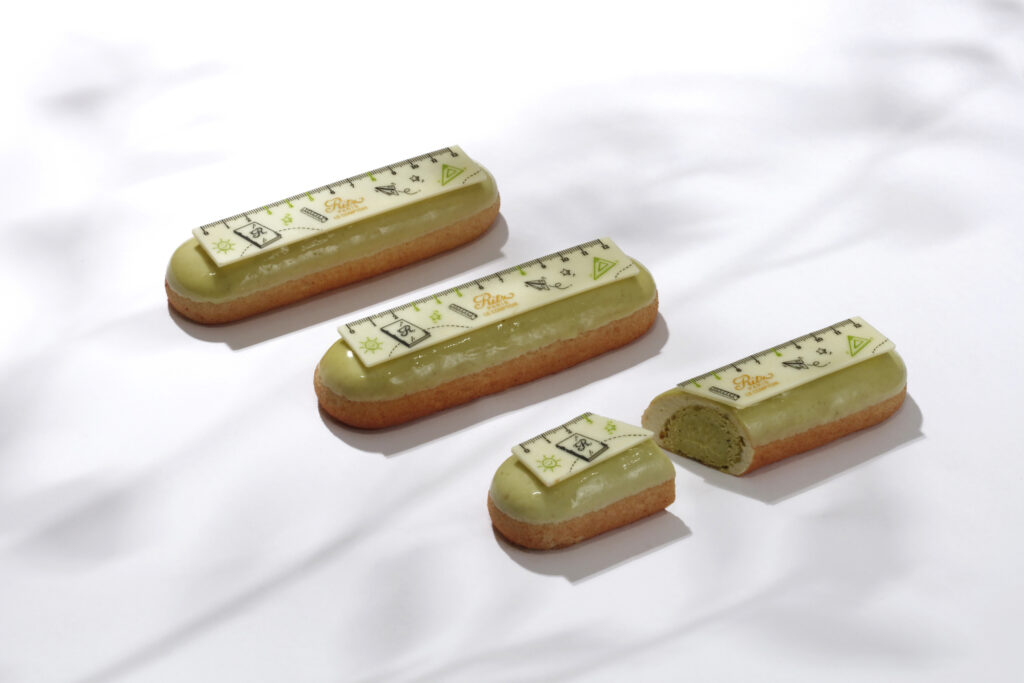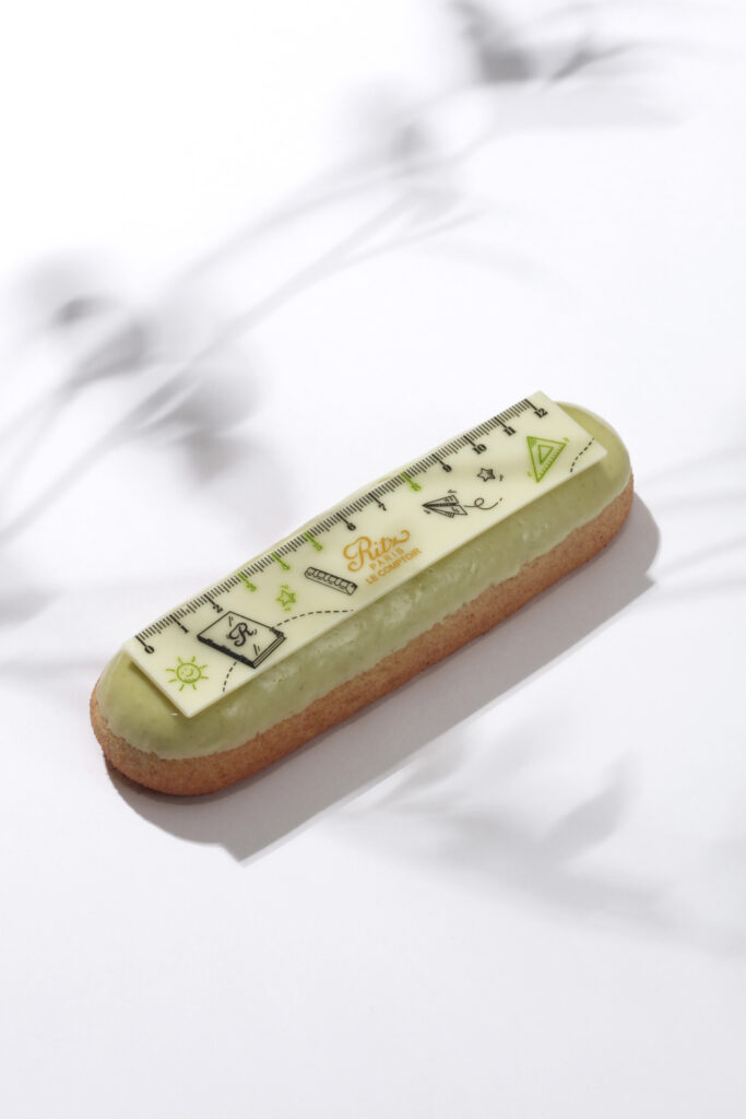 Autre prouesse ludique, l’Entremets Éclair Pistache (14 €) adopte la forme d’une règle d’écolier. Biscuit pâte à chou, mousse légère et crémeux pistache se dissimulent sous un glaçage lisse et gourmand, fidèle à l’art du trompe-l’œil qui fait la réputation des boutiques Ritz Paris Le Comptoir.