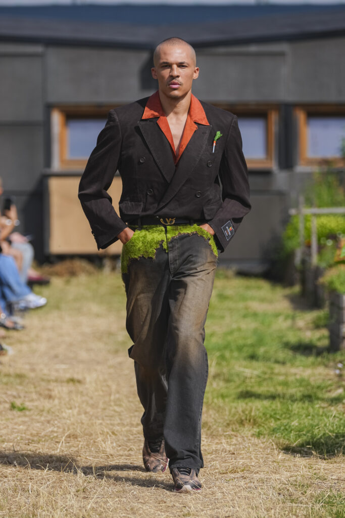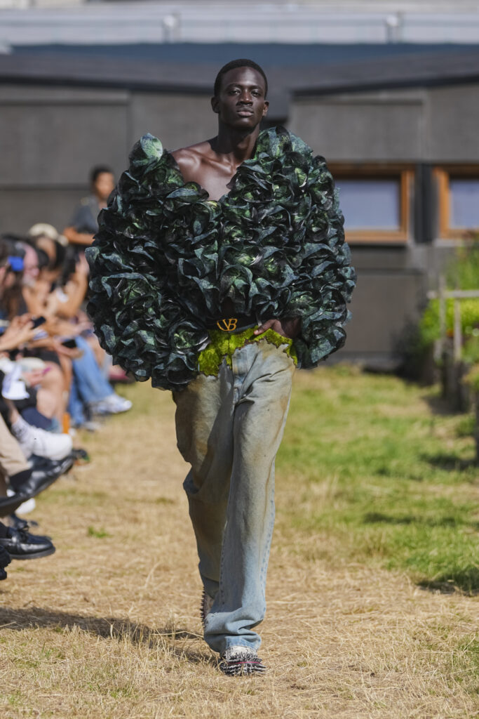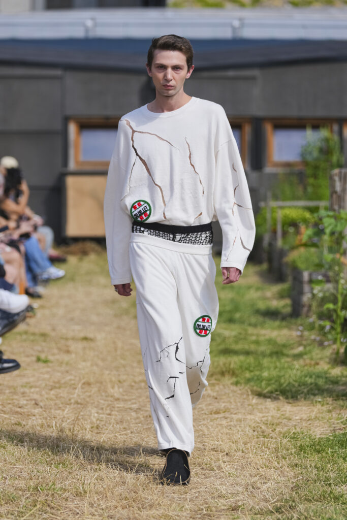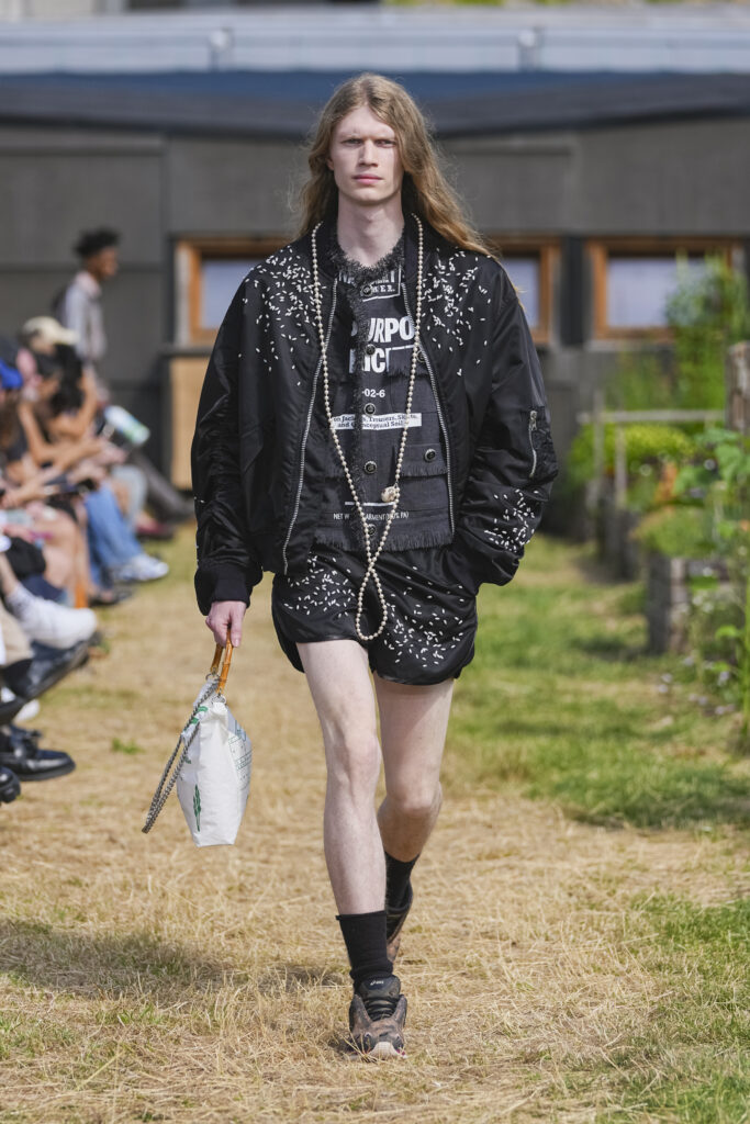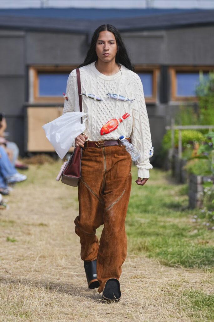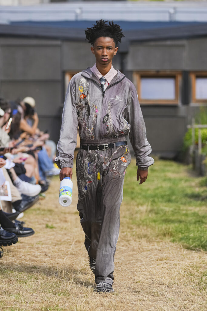 Les matières sont volontairement trompeuses : du polyester imprimé façon denim ou cuir, des broderies animées par l’effet de la marche, des textiles réfléchissants qui réagissent à la lumière UV. Le créateur joue aussi avec des pièces semi-transparentes portées sur des bases plus rigides, créant des jeux de duplication et d’hallucination visuelle.