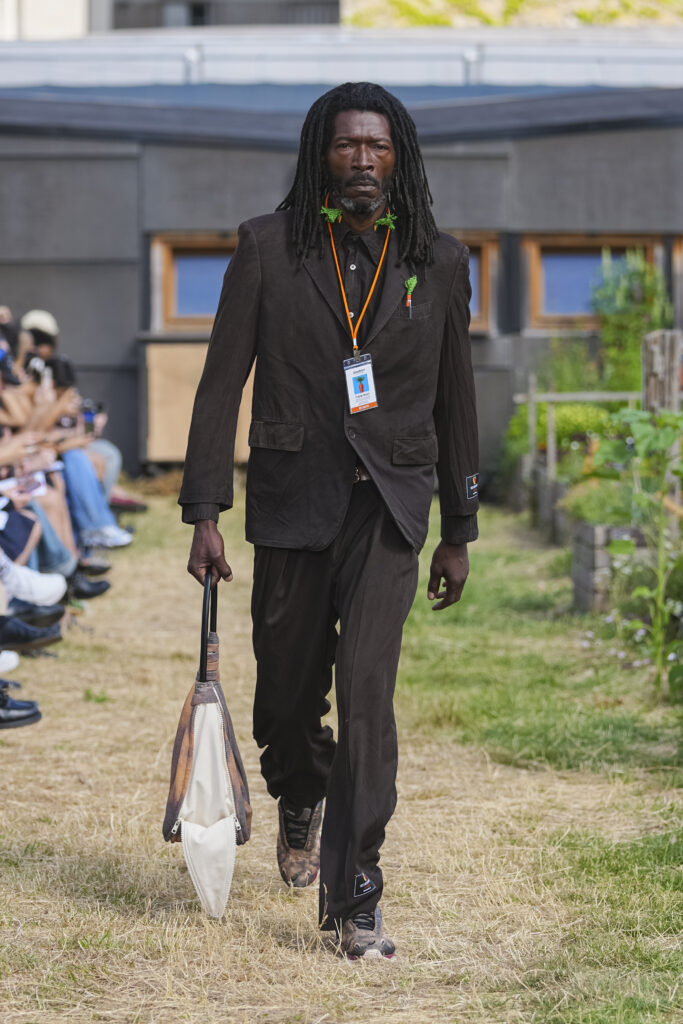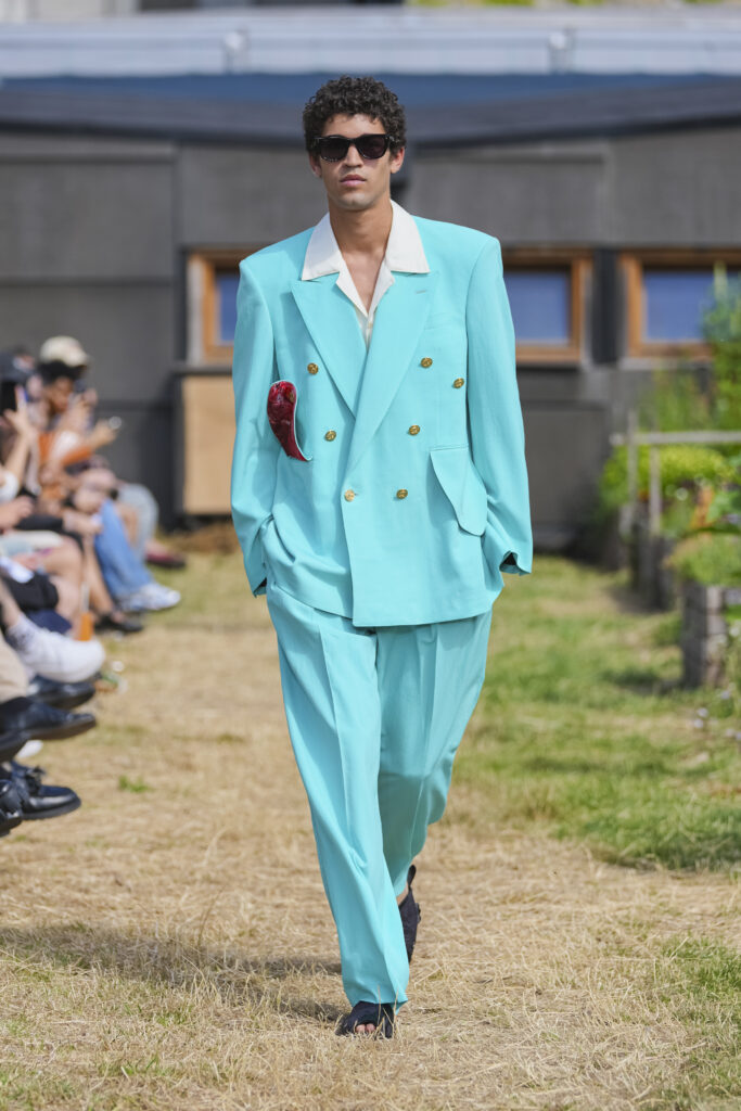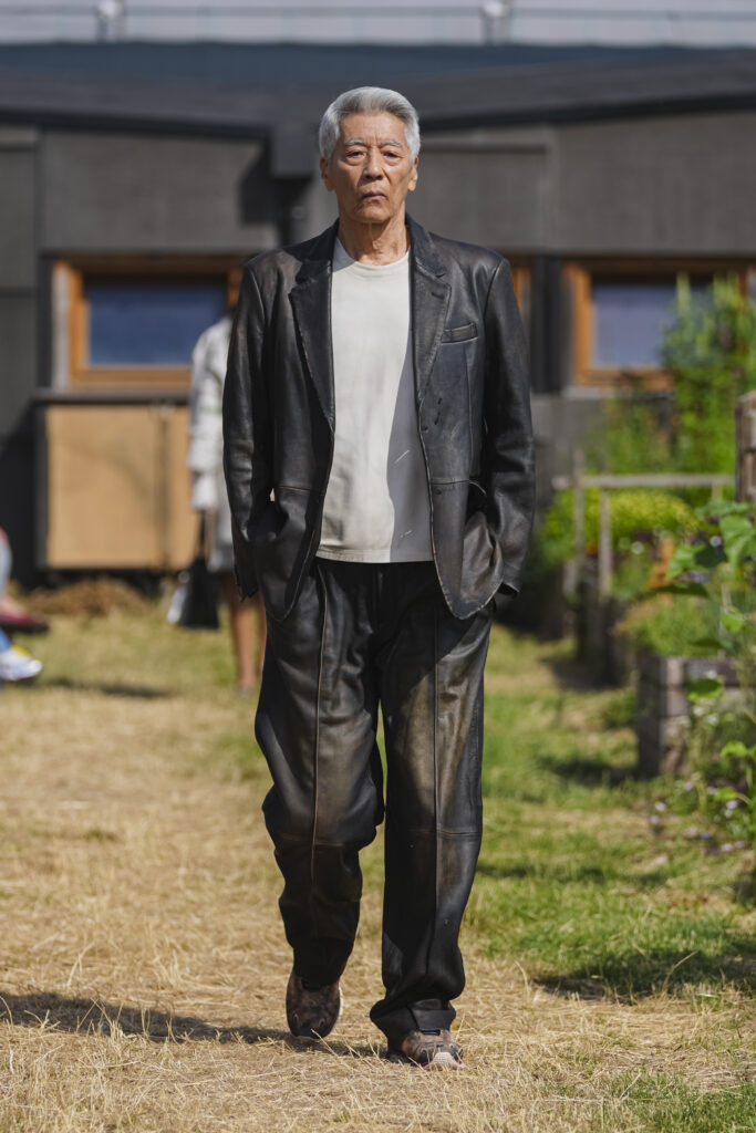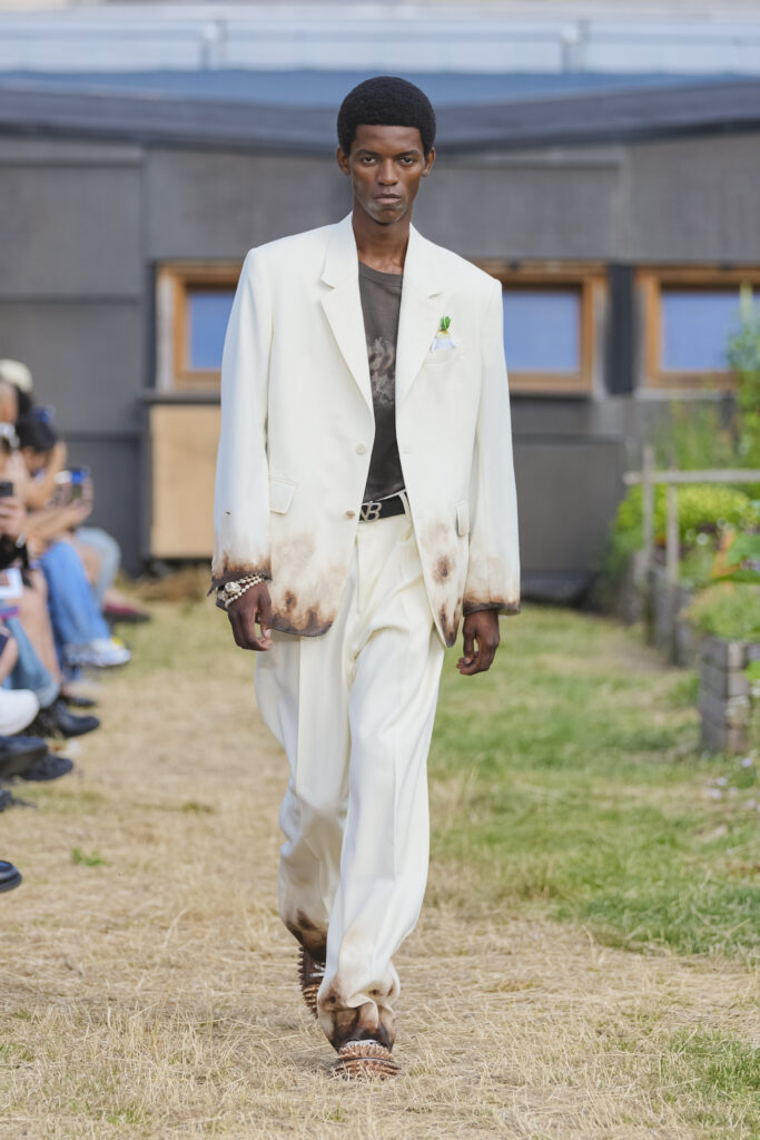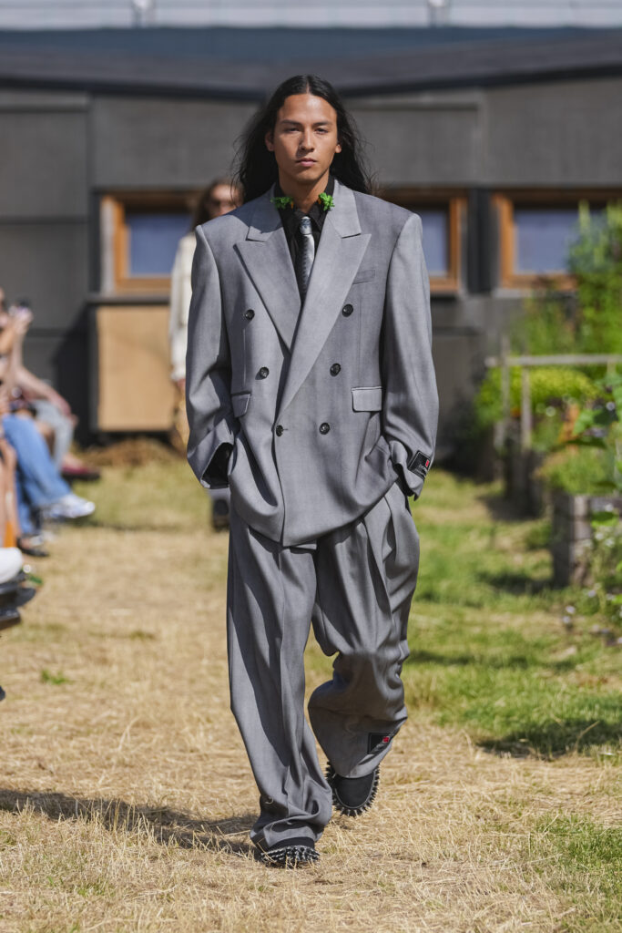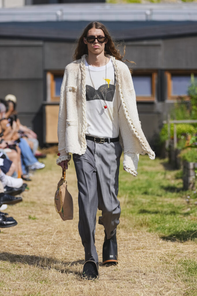 Les matières sont volontairement trompeuses : du polyester imprimé façon denim ou cuir, des broderies animées par l’effet de la marche, des textiles réfléchissants qui réagissent à la lumière UV. Le créateur joue aussi avec des pièces semi-transparentes portées sur des bases plus rigides, créant des jeux de duplication et d’hallucination visuelle.