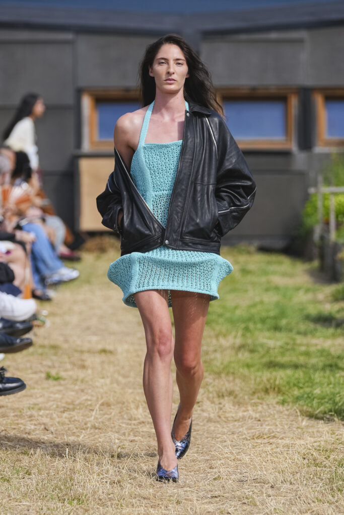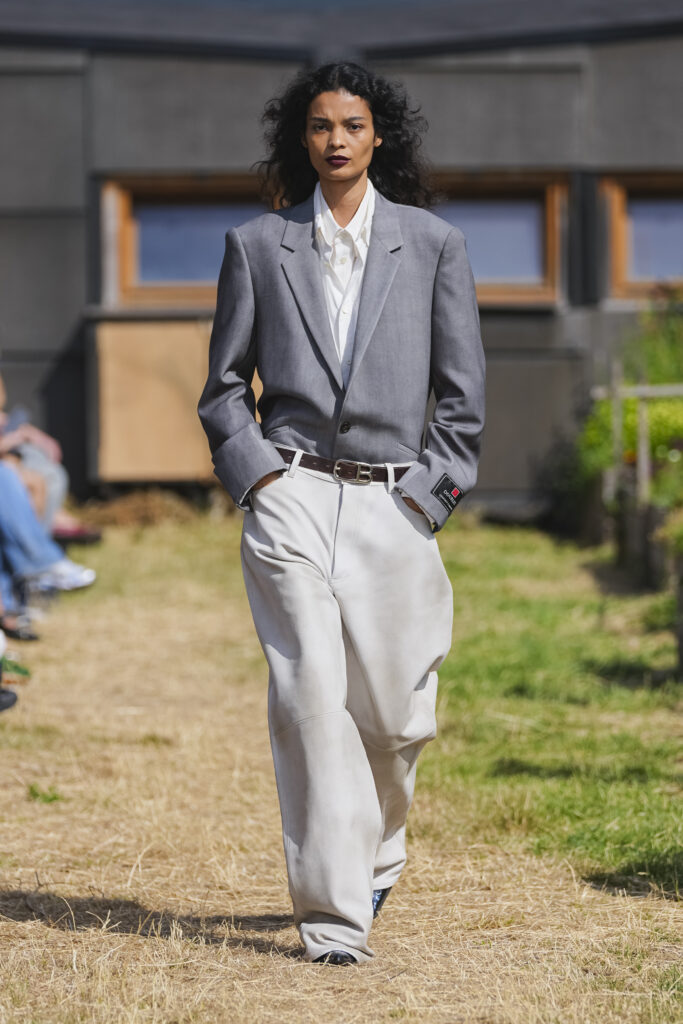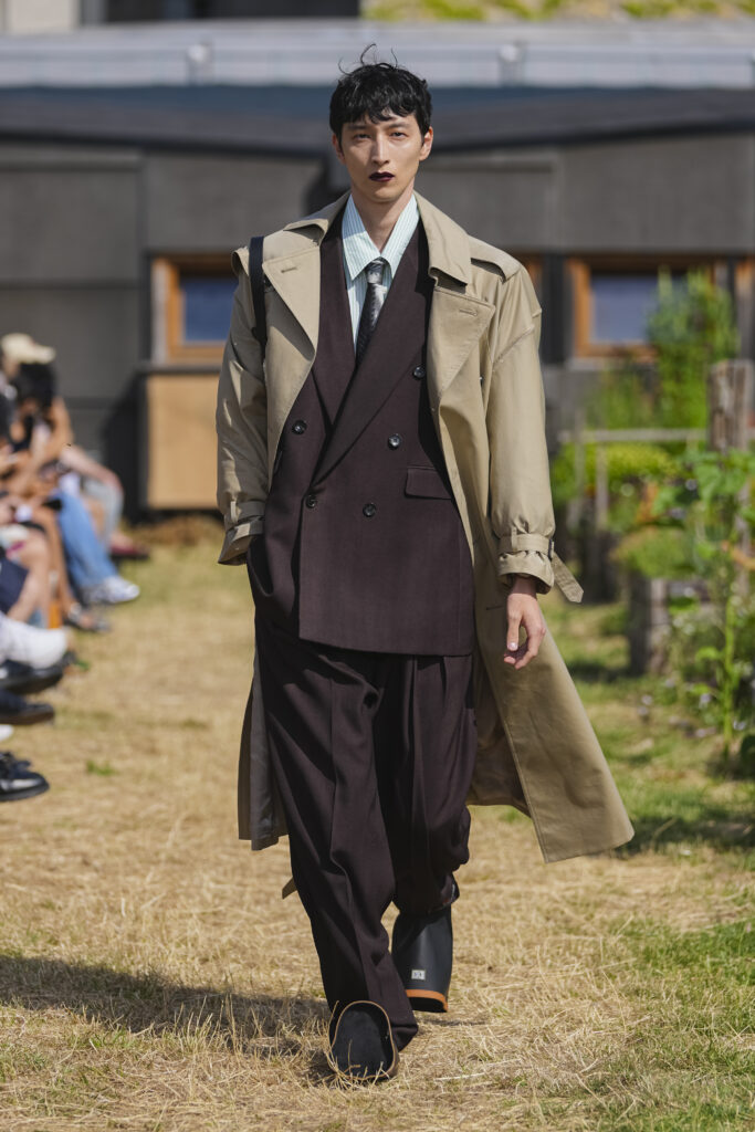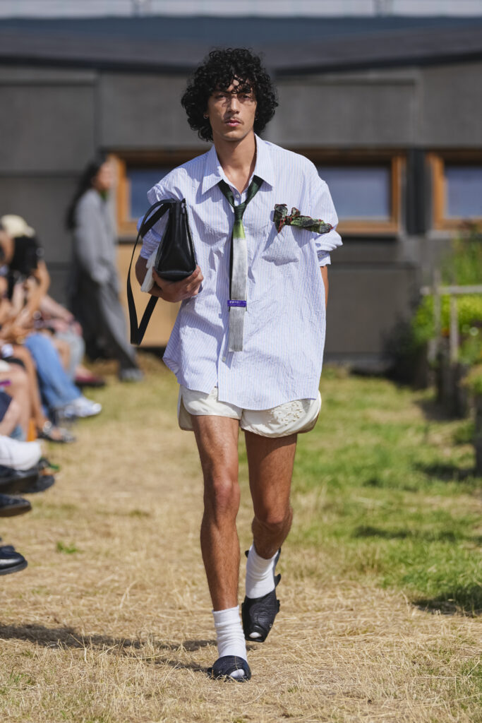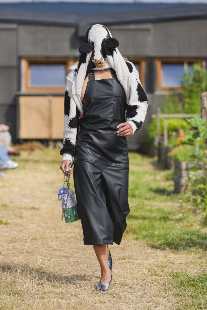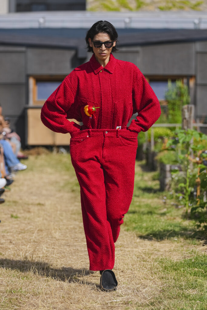 Les matières sont volontairement trompeuses : du polyester imprimé façon denim ou cuir, des broderies animées par l’effet de la marche, des textiles réfléchissants qui réagissent à la lumière UV. Le créateur joue aussi avec des pièces semi-transparentes portées sur des bases plus rigides, créant des jeux de duplication et d’hallucination visuelle.