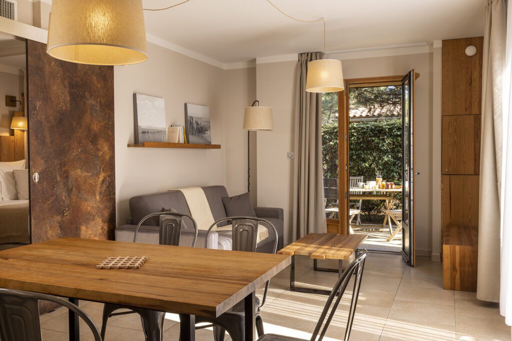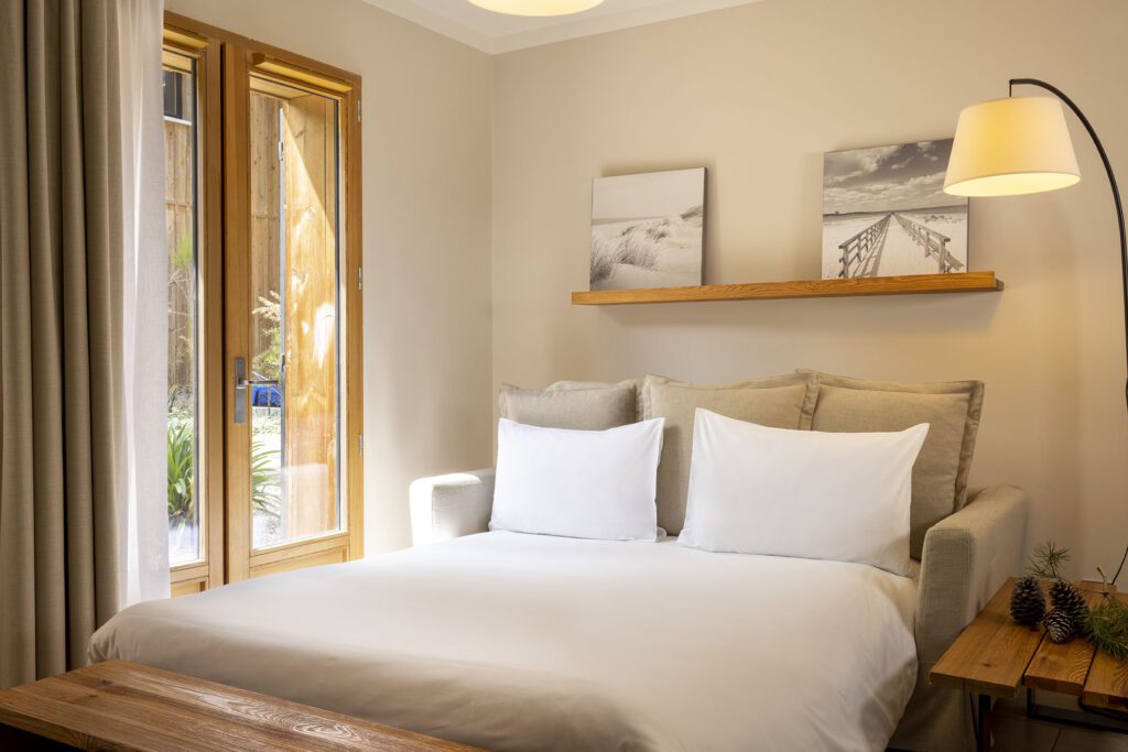 Chaque lodge conjugue l’intimité d’une résidence secondaire et le service d’un quatre-étoiles : room-service gourmand, conciergerie vélo, ménage quotidien. Le Balnéo & Spa, bassin intérieur-extérieur chauffé à 33 °C, s’entoure de soins signés Phytocéane et CF Natural, tandis que le restaurant Le Cabanon du chef Clément Petit sublime huîtres du Bassin et asperges des sables — à déguster sur une terrasse rythmée par le tangage des pins .