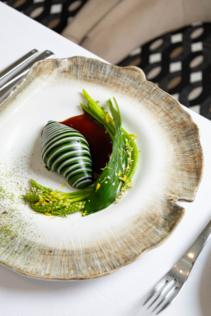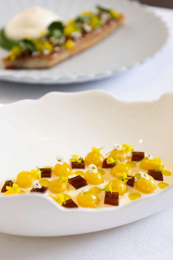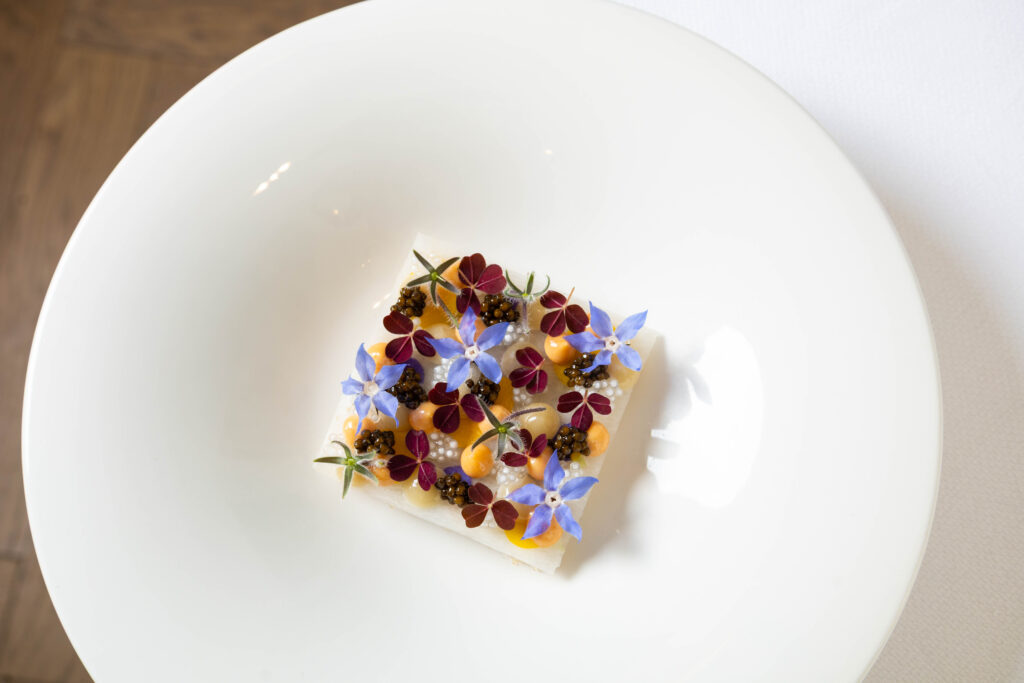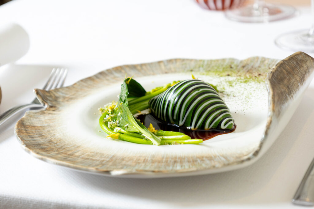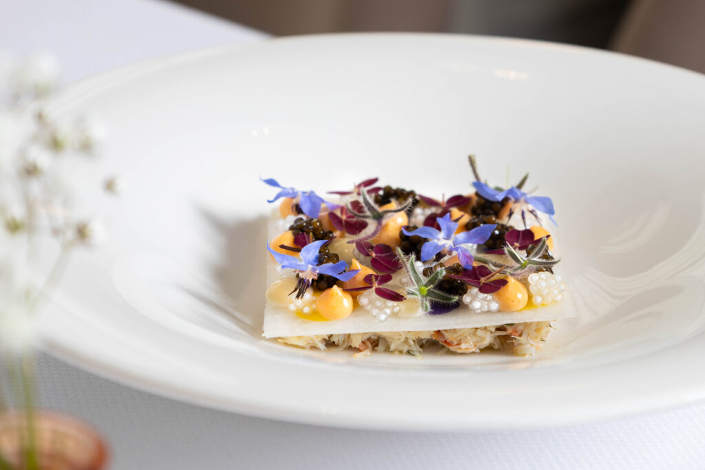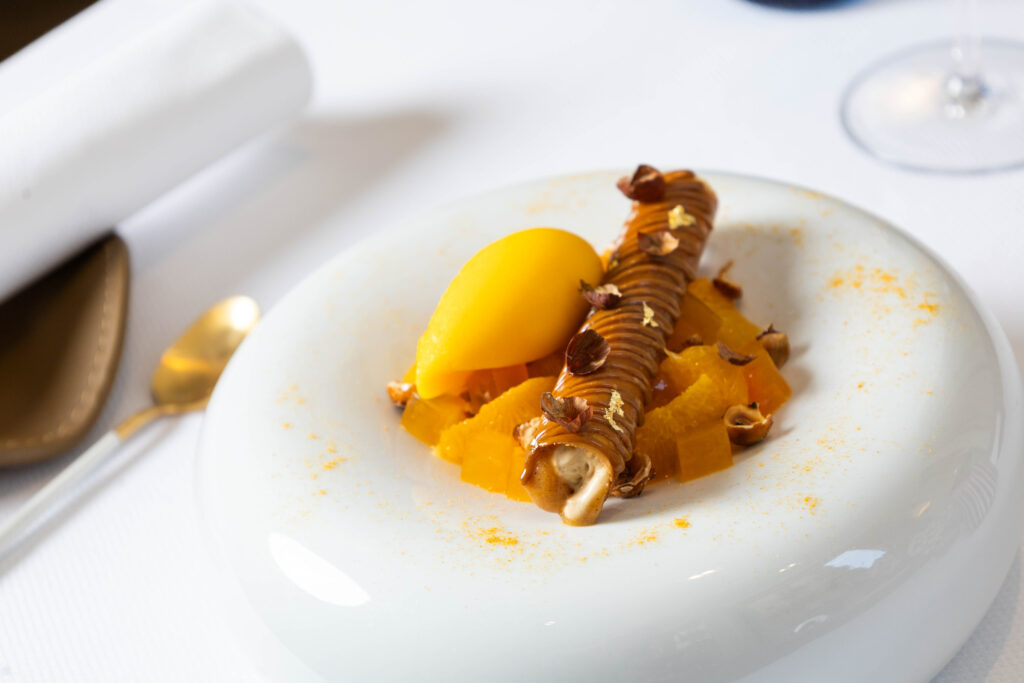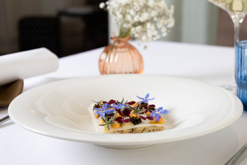 Signature de l’été : le tourteau de Roscoff en feuille de daïkon imprimé, relevé d’un condiment miel-xérès et perlé de tapioca au caviar impérial ; un exercice d’équilibre où la douceur iodée s’accorde à l’acidulé, la texture soyeuse au croquant . Plus terrien, le lapin Rex du Poitou rôti, jus de thym serpolet fumé au bois de baies, s’entoure de romaine croustillante, maïs, raisin blond et jalapeños doux — terroir et inventivité jouent en polyphonie . Chaque plat célèbre un réseau de producteurs d’exception — Compagnie de Bouteville pour le vinaigre, Tahiti Vanille, truffières Louis Pradel — souvent labellisés Bleu-Blanc-Cœur, gage de pratiques durables .