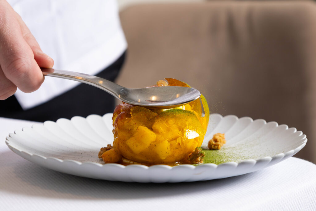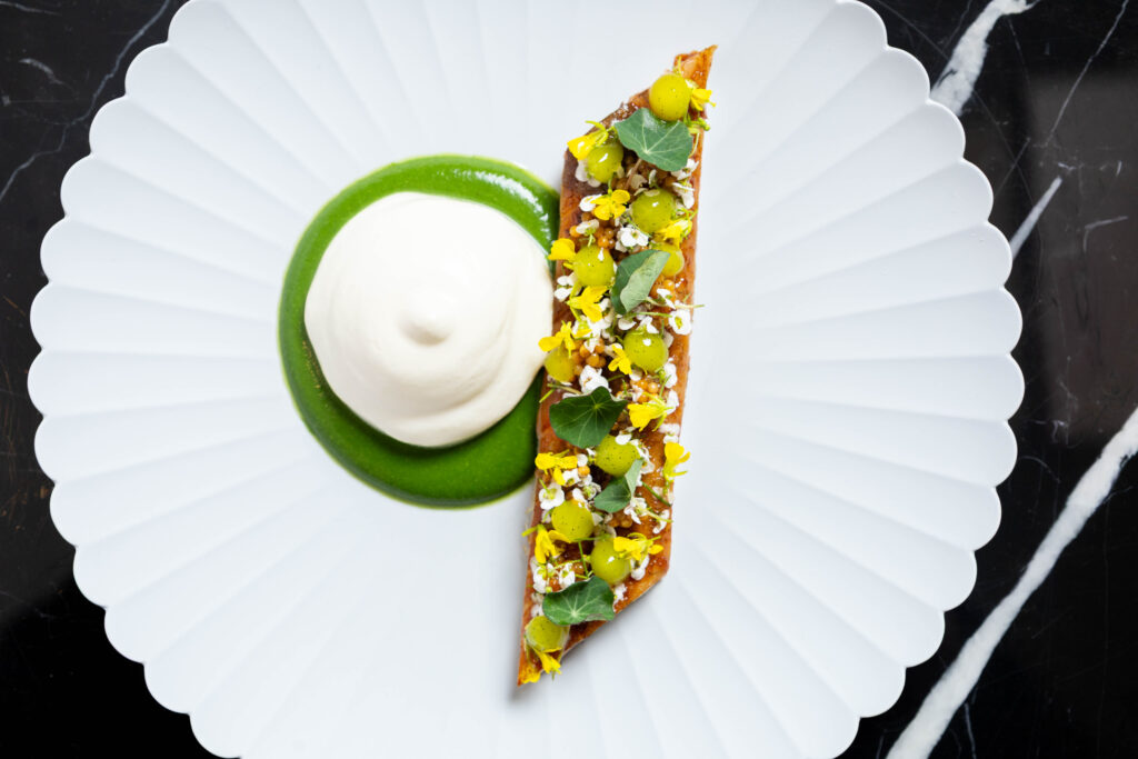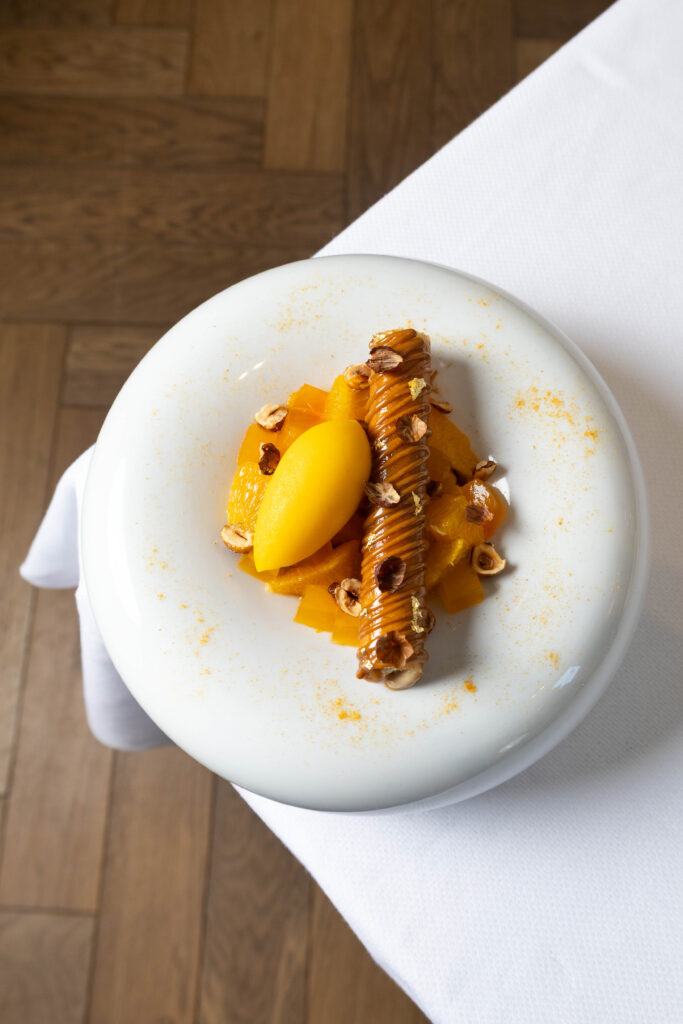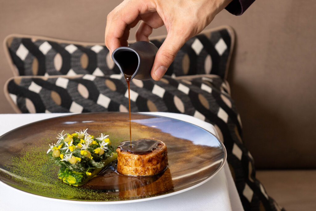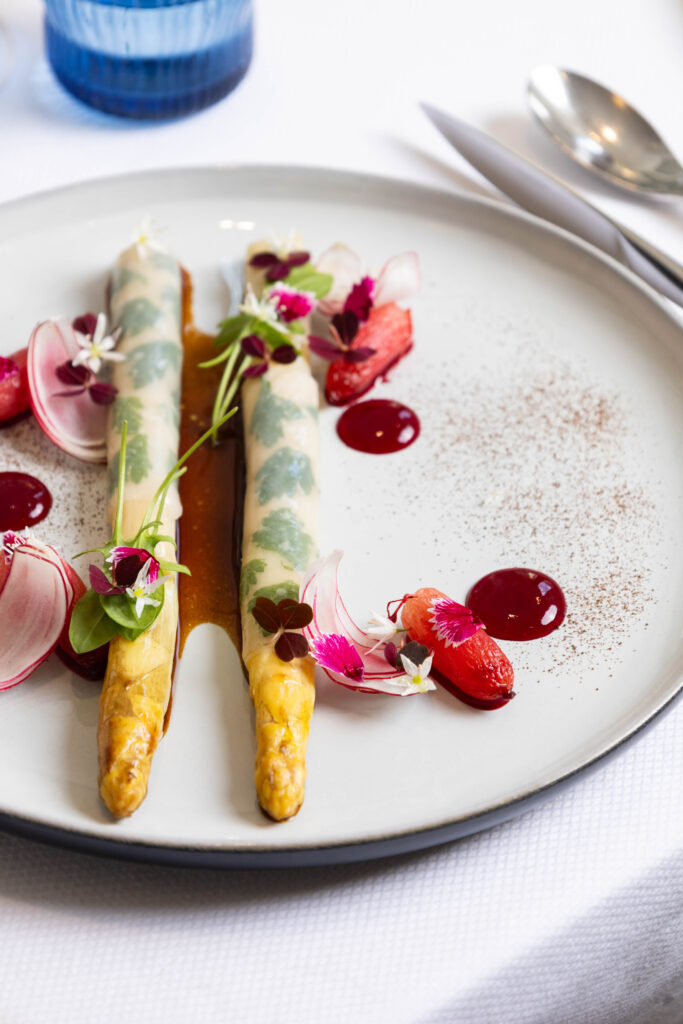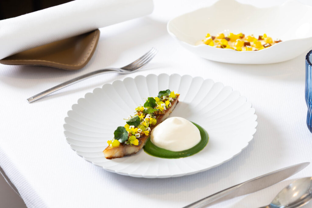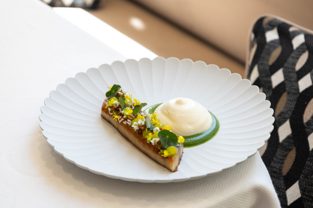 Signature de l’été : le tourteau de Roscoff en feuille de daïkon imprimé, relevé d’un condiment miel-xérès et perlé de tapioca au caviar impérial ; un exercice d’équilibre où la douceur iodée s’accorde à l’acidulé, la texture soyeuse au croquant . Plus terrien, le lapin Rex du Poitou rôti, jus de thym serpolet fumé au bois de baies, s’entoure de romaine croustillante, maïs, raisin blond et jalapeños doux — terroir et inventivité jouent en polyphonie . Chaque plat célèbre un réseau de producteurs d’exception — Compagnie de Bouteville pour le vinaigre, Tahiti Vanille, truffières Louis Pradel — souvent labellisés Bleu-Blanc-Cœur, gage de pratiques durables .